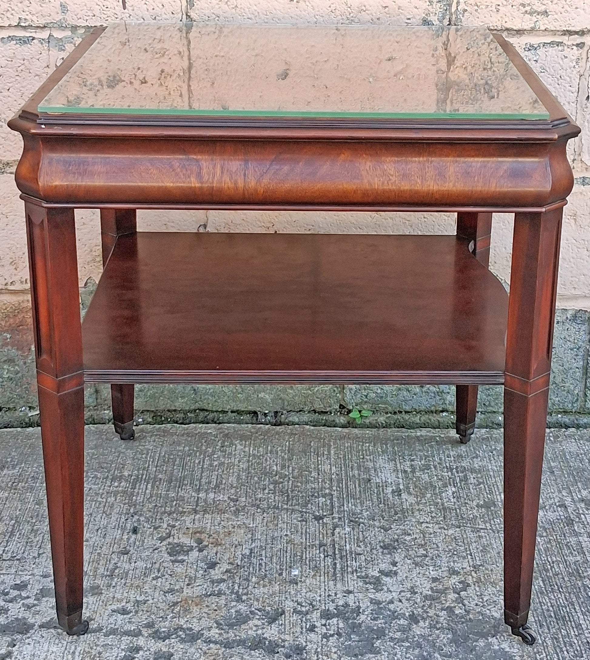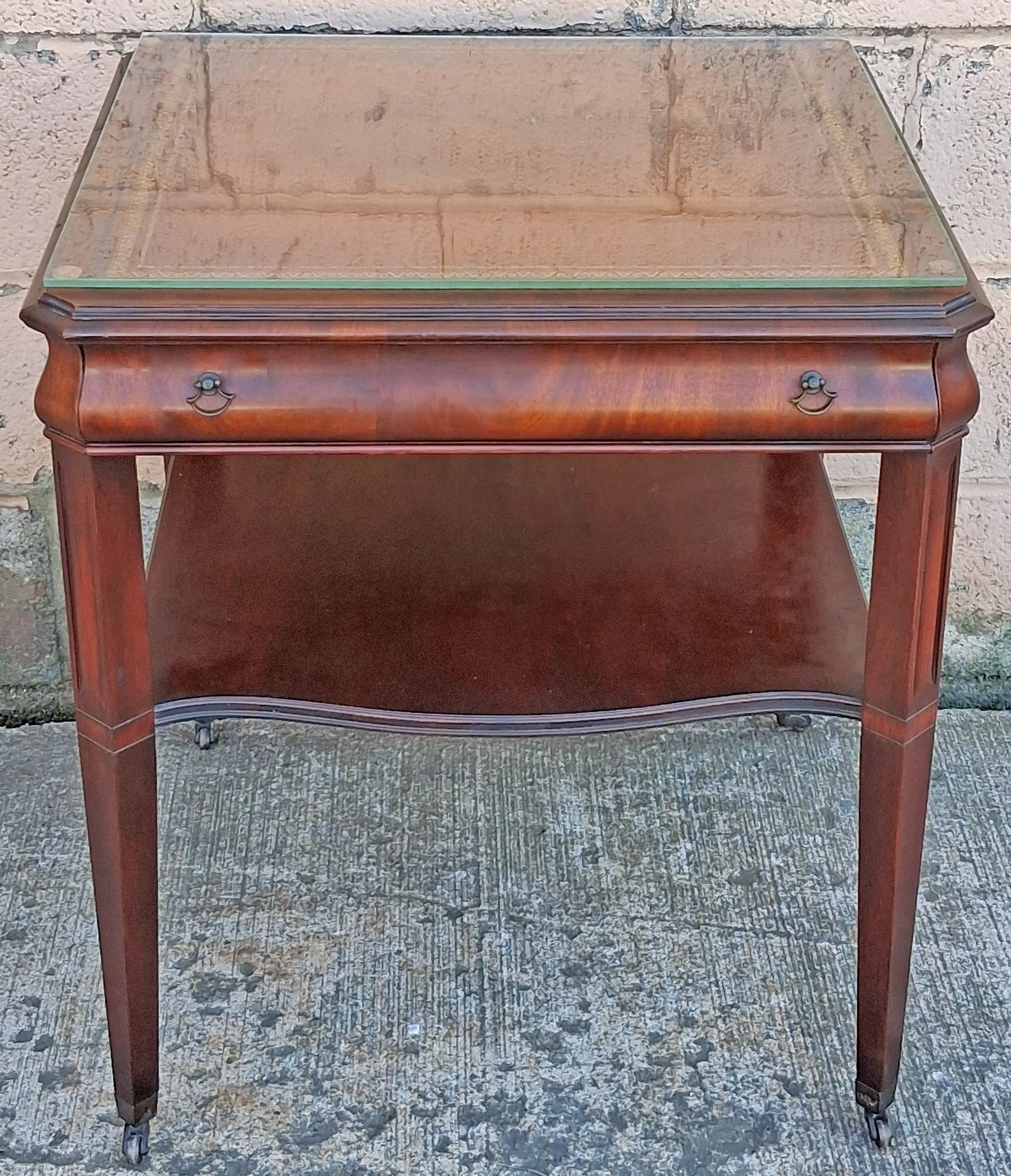 Underneath the table top, there is a very wide drawer with 2, beautiful, brass, drop-pulls. Below the drawer is a flat shelf with a serpentine, (curved) front. The nightstand sits on 4, reeded legs with an elegant, pin-shaped design. Each leg has a brass caster at the bottom.