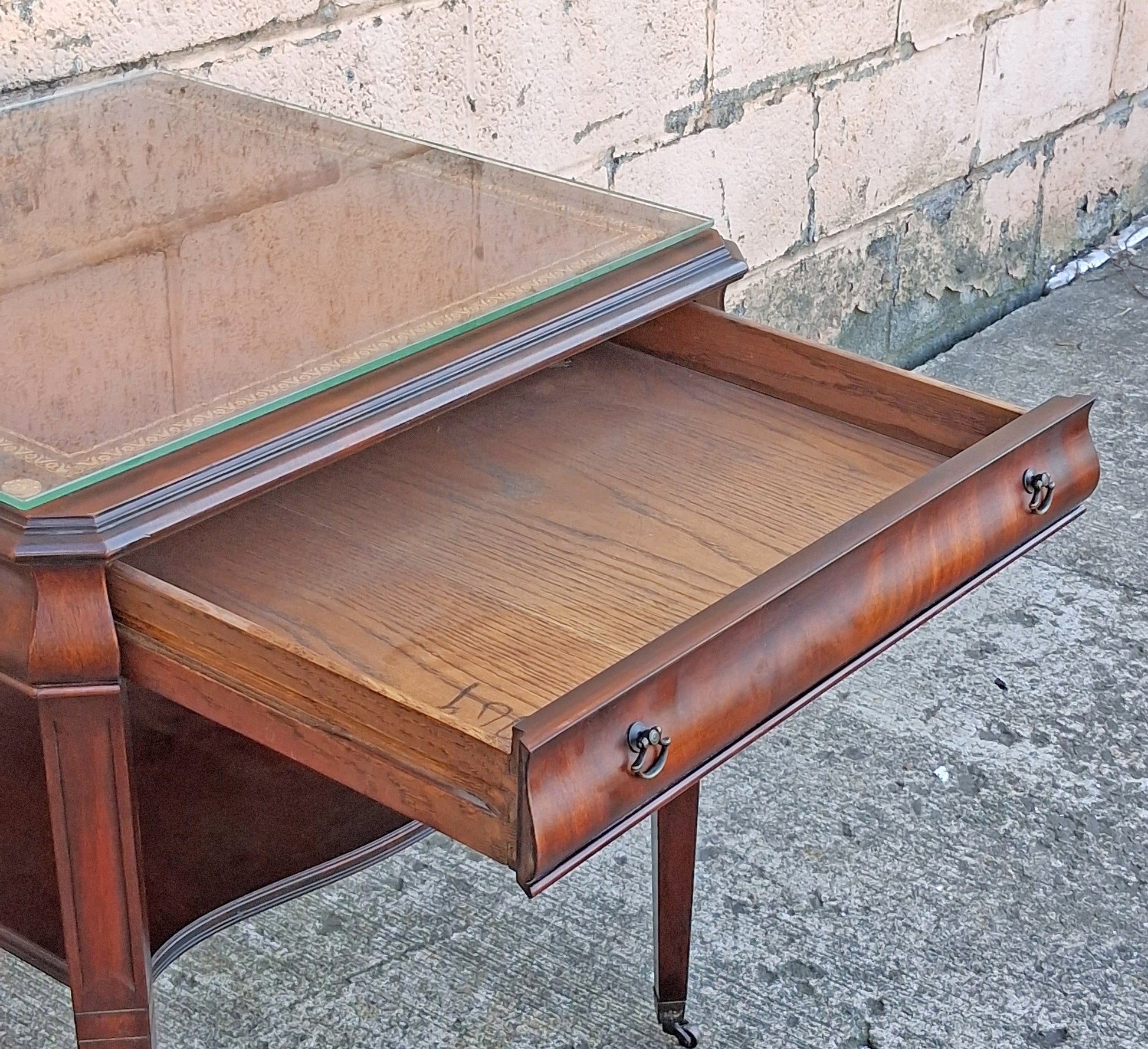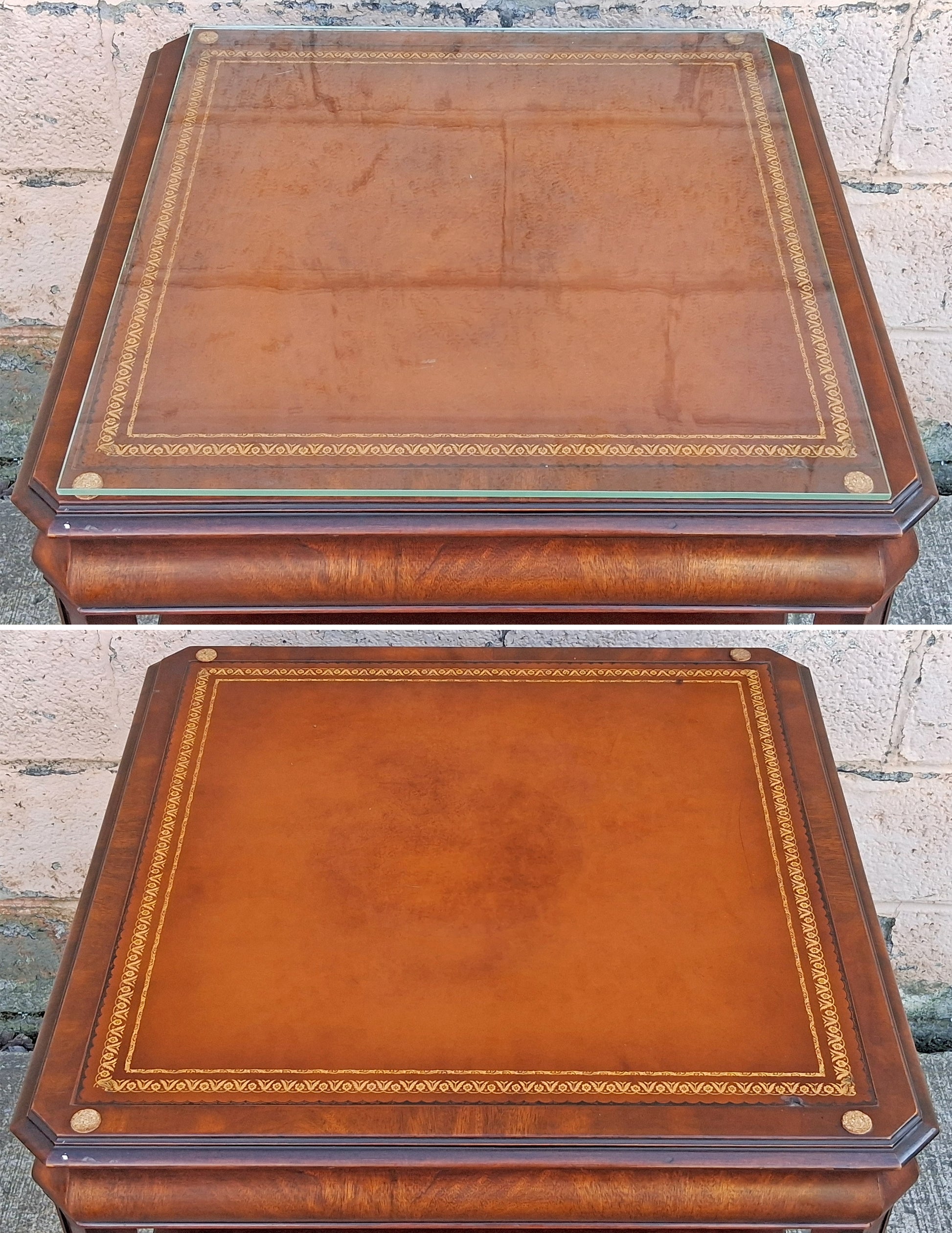 In the center of the tabletop is a leather panel with a gilded, floral pattern on the edges. To protect the table top, the previous owner installed a 1/4" thick, tempered, glass panel with polished edges. Below the glass are 4 small scuff-protectors.