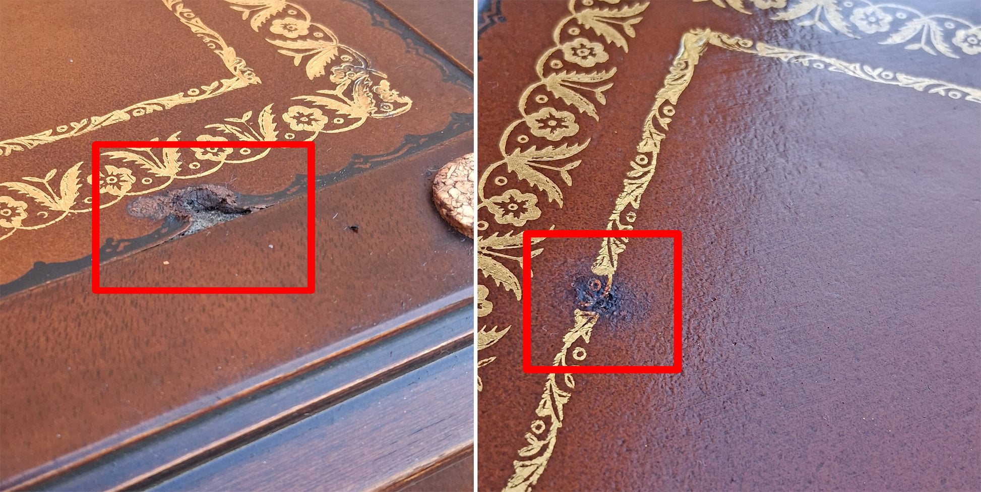 The table is strong, solid, and sturdy, and in excellent condition. There are small nicks & scratches. However, there are no breaks, cracks, gouges, rot, or warp. The only real damage we could find on the table are on the leather top. There is a small discoloration, and a very small rip (see last photo).