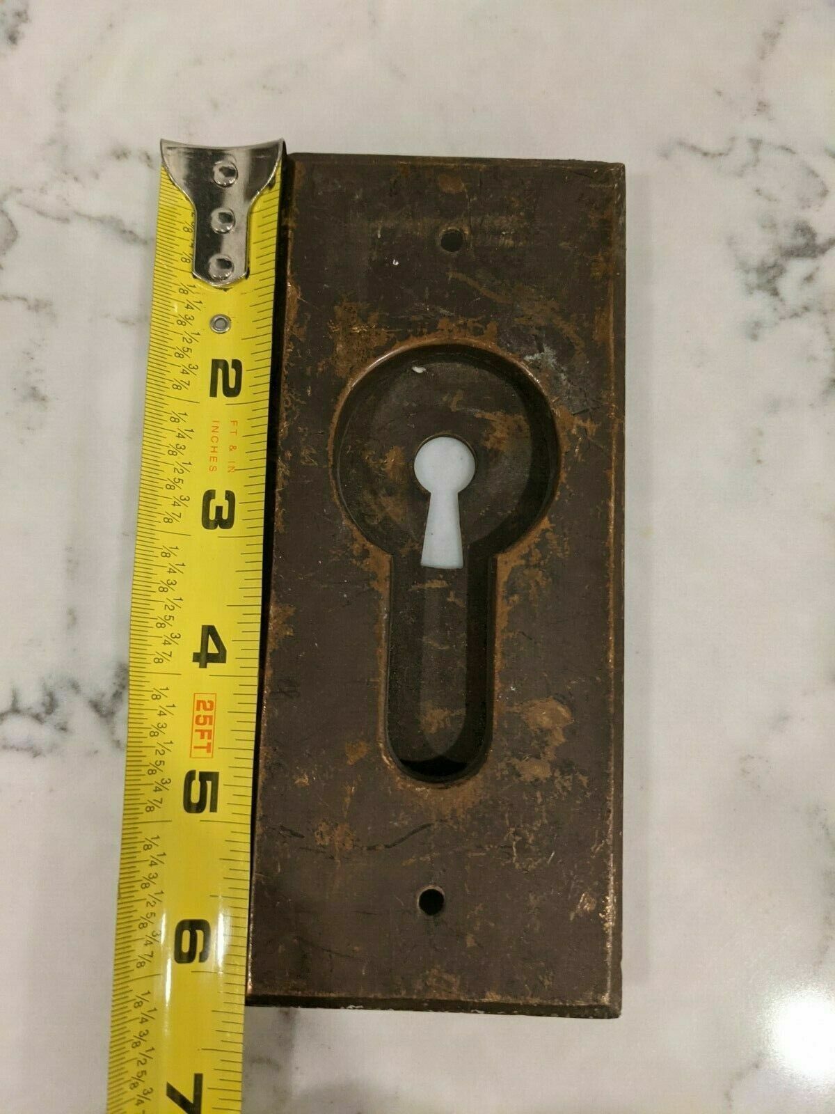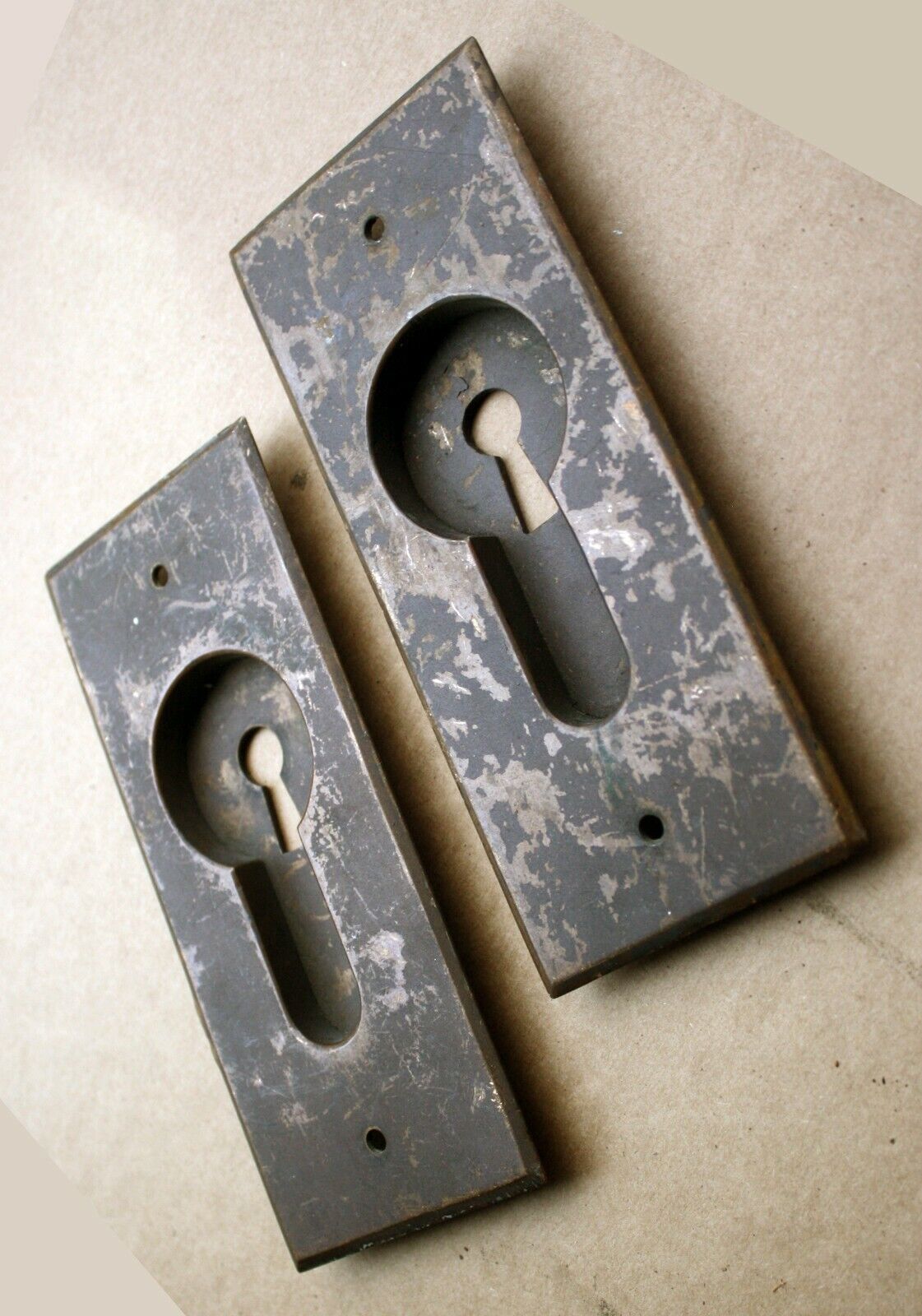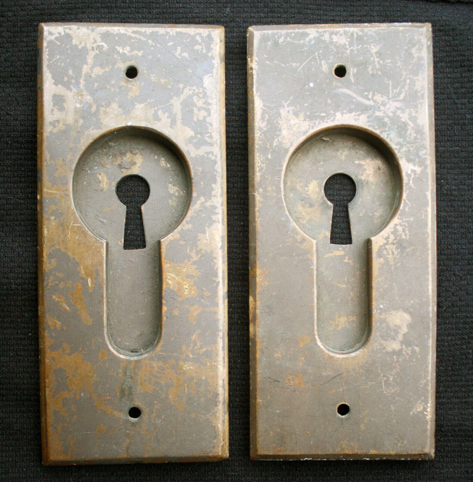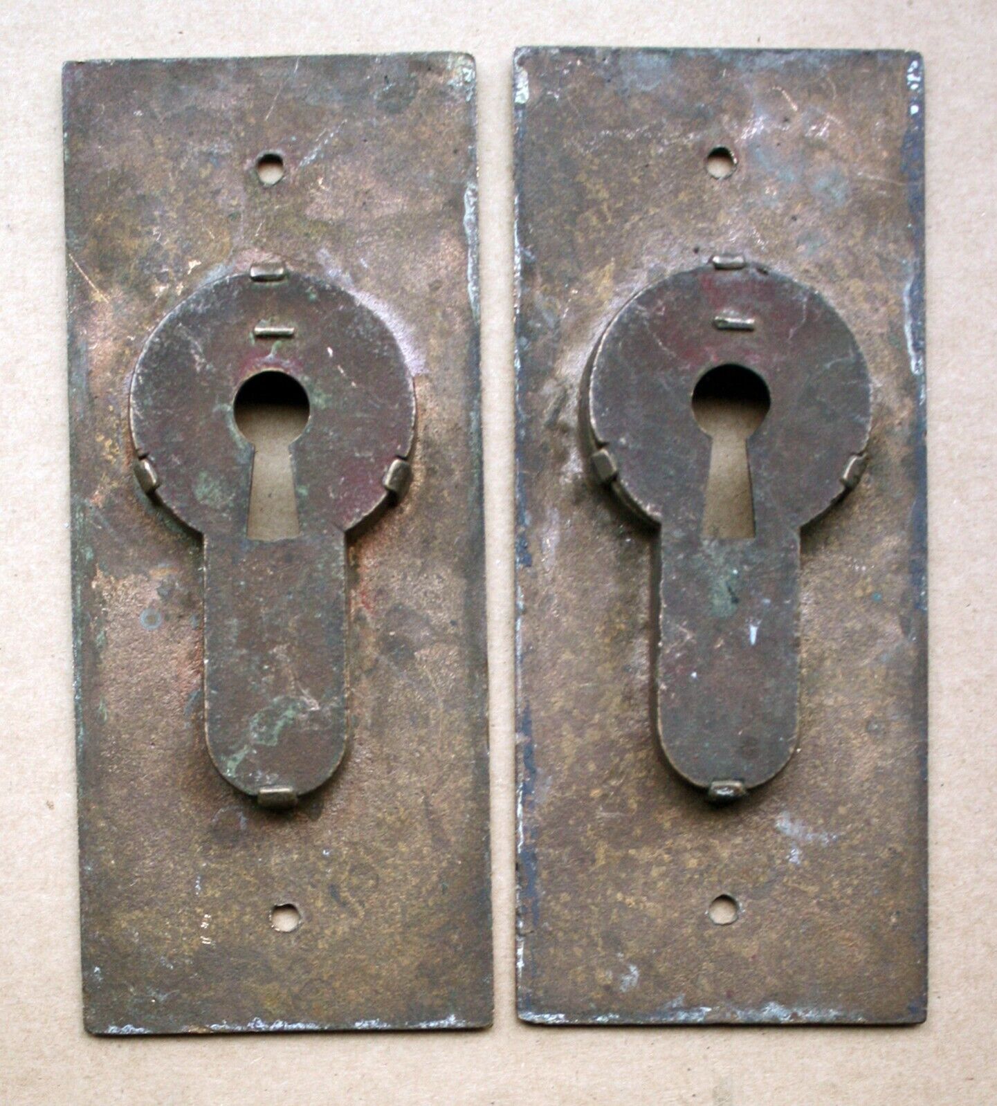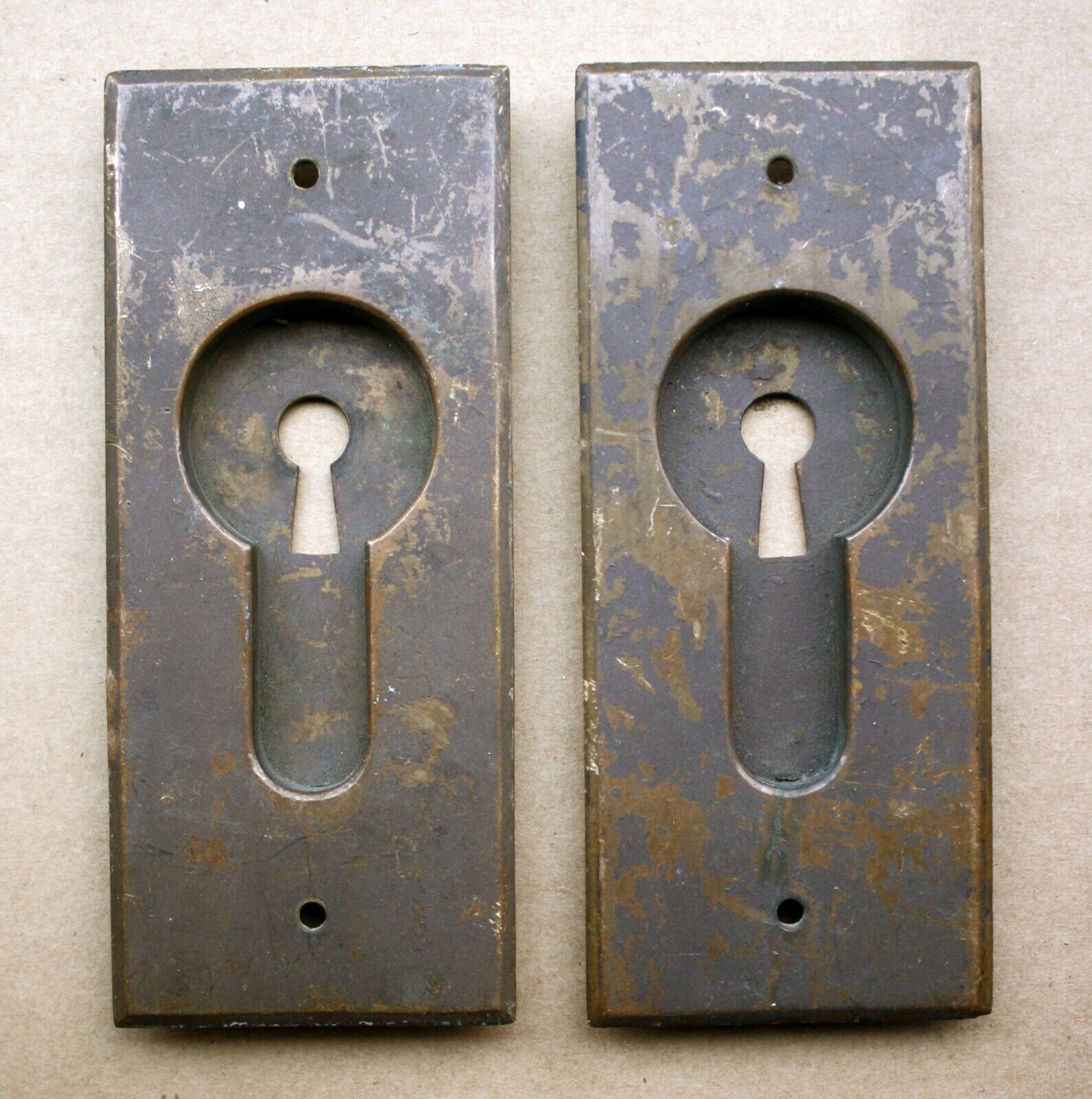 BIG! Pair Antique Vintage Old Reclaimed Salvaged SOLID Cast Bronze Brass Pocket Door Key Plate Pull