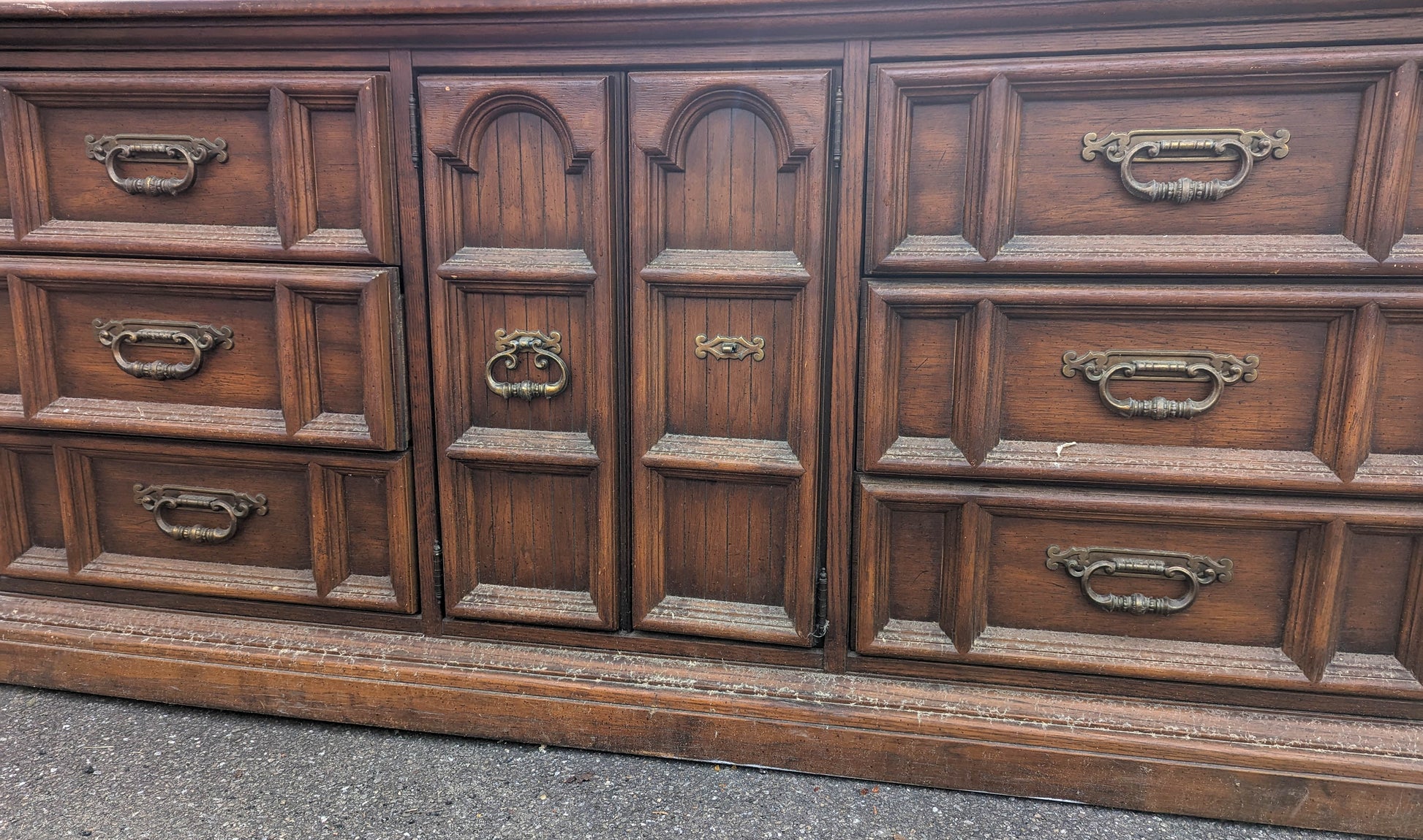 Beautiful, chunky pair of drawer, bail pulls salvaged from Northeastern Pennsylvania. We removed them from an old, "Broyhill," dresser (see last photos). They are made of a non-magnetic alloy and have the number 1007 stamped on the back of their handles.