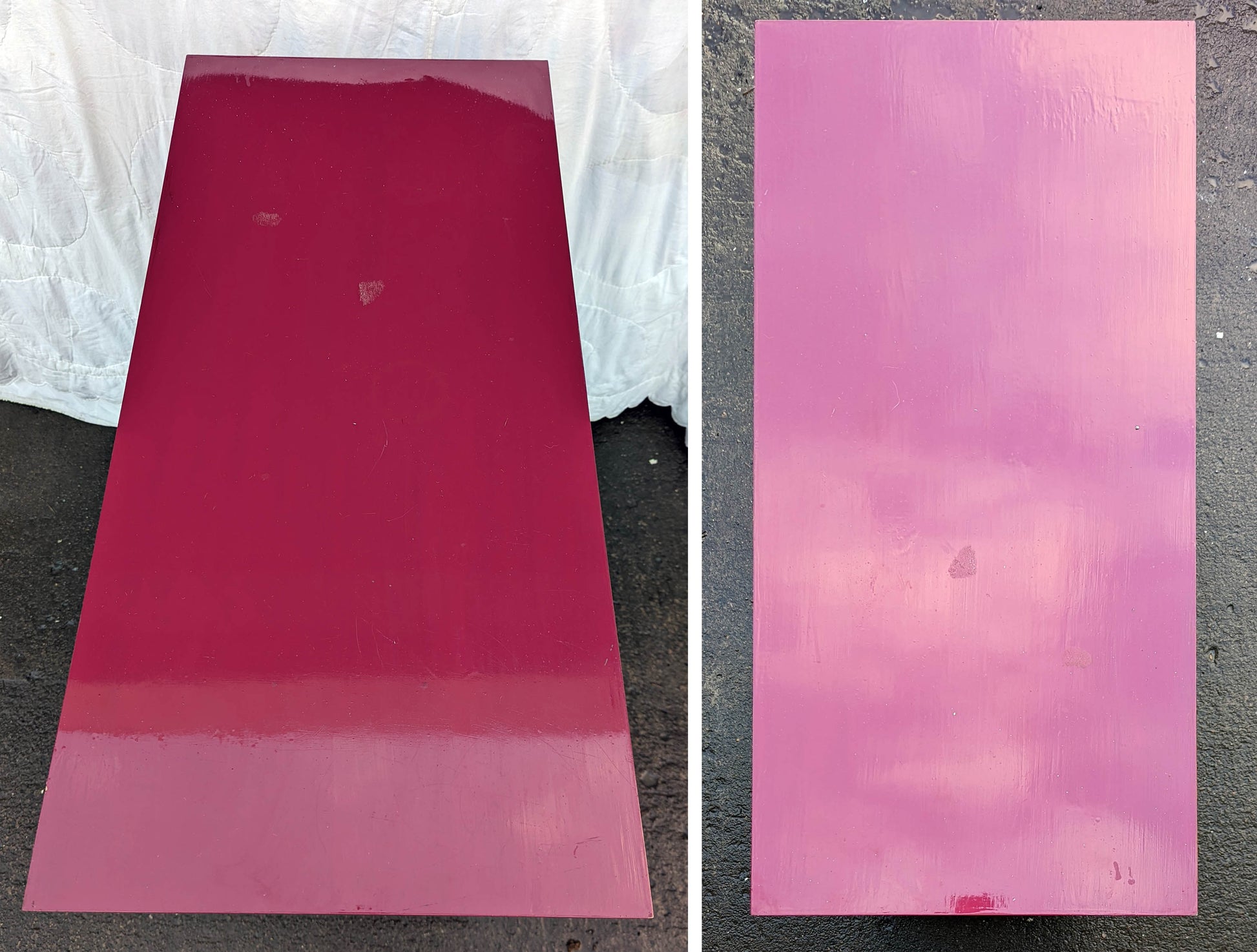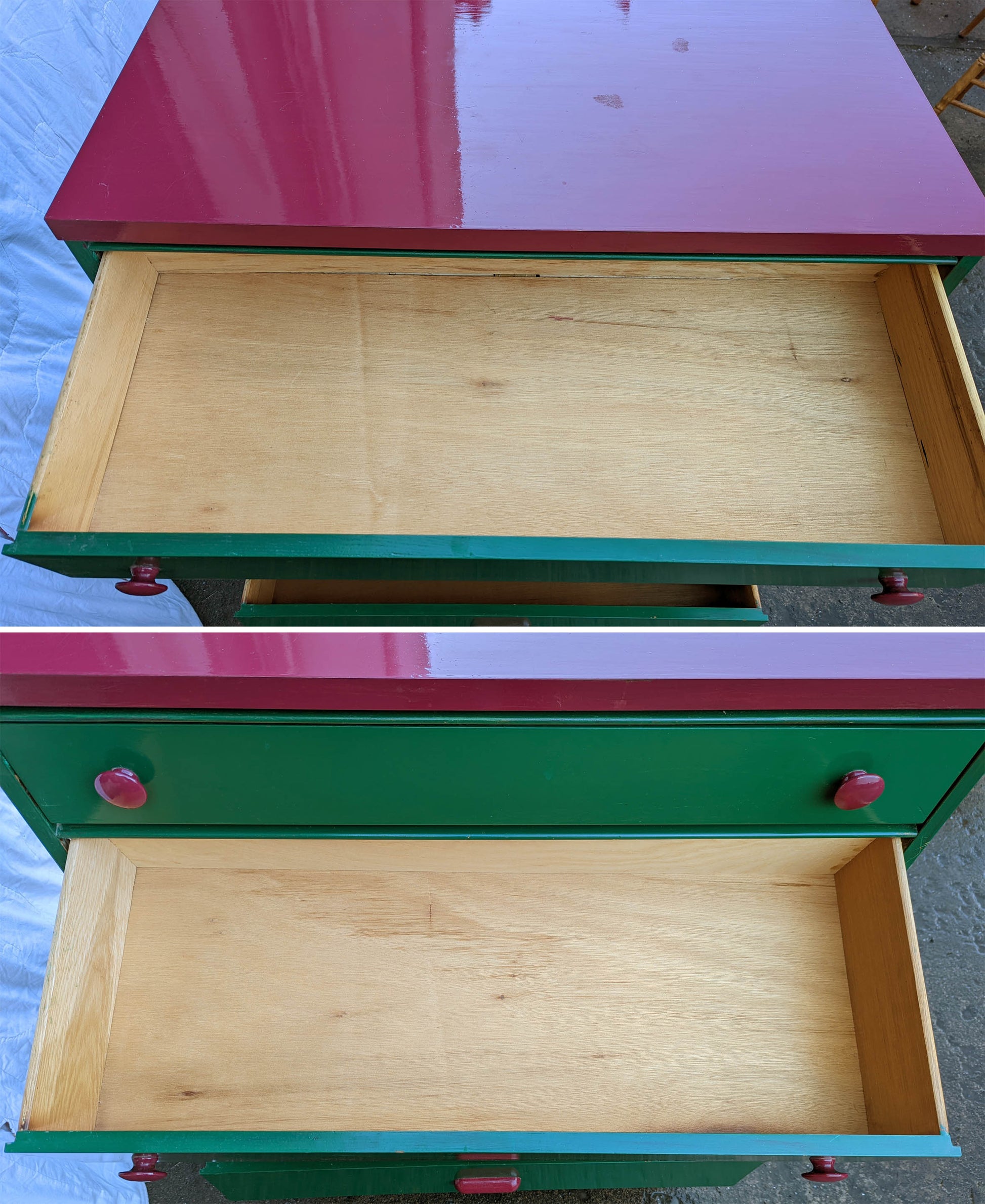 The dresser itself is in excellent structural and cosmetic condition. However, there are spots where the paint is scratched or scuffed. The top has 2 scuffs that are only noticeable at the right angle. There are nicks, scratches, and white marks here and there. All you would need to fix this is some touch-up paint. Since the blemishes are so small and thin, even if you don't have the exact same shade of green or pink, the touch ups will be much less noticeable than the nicks and scratches.