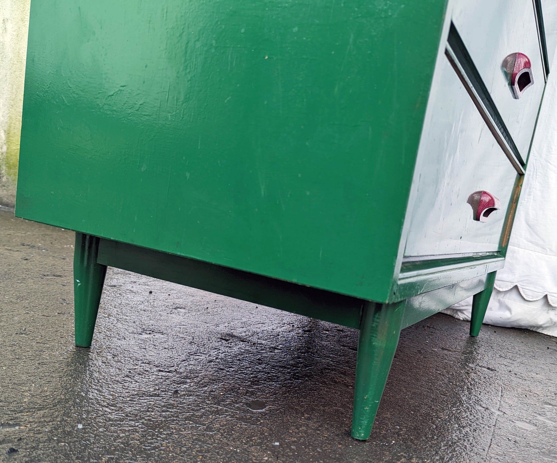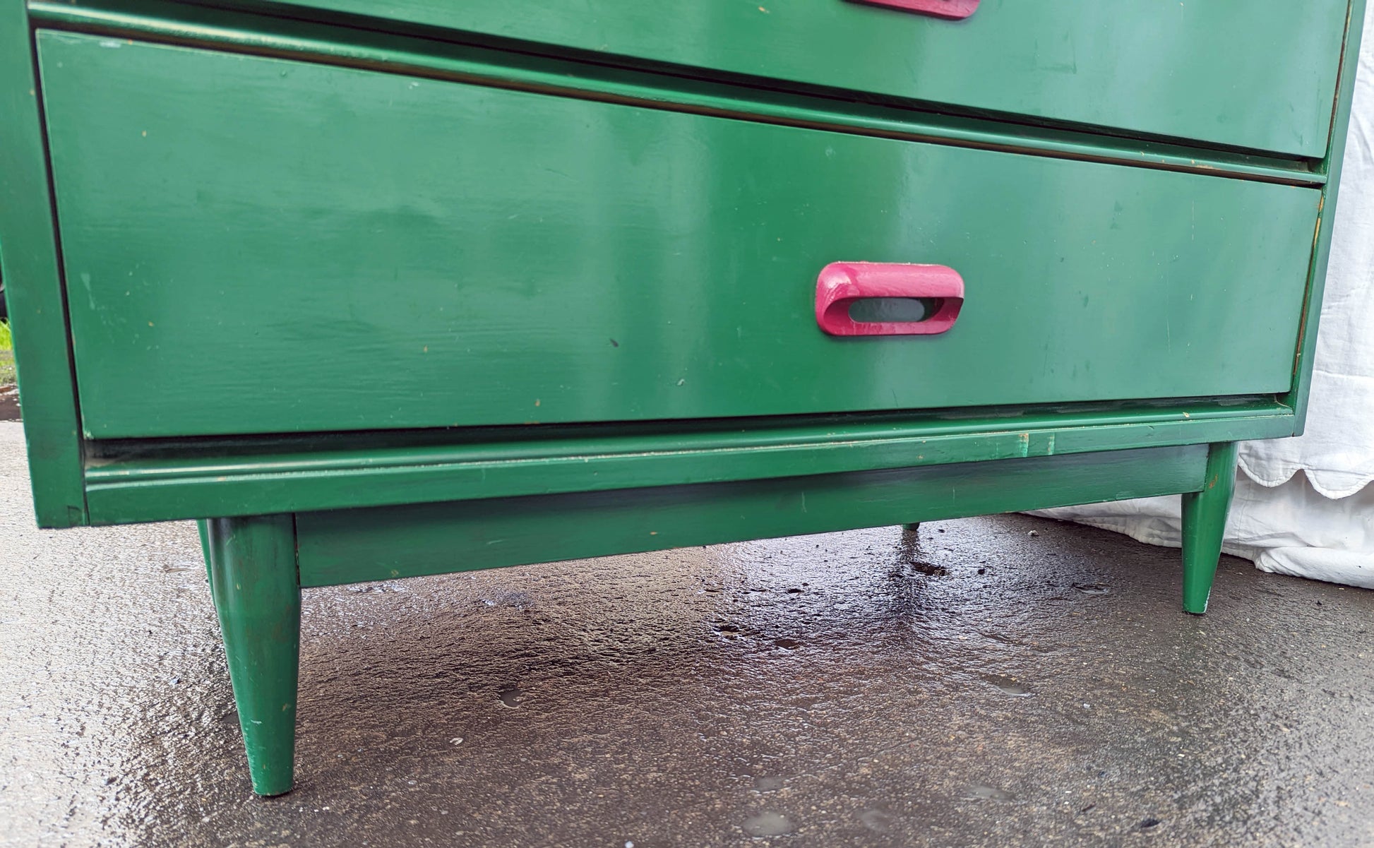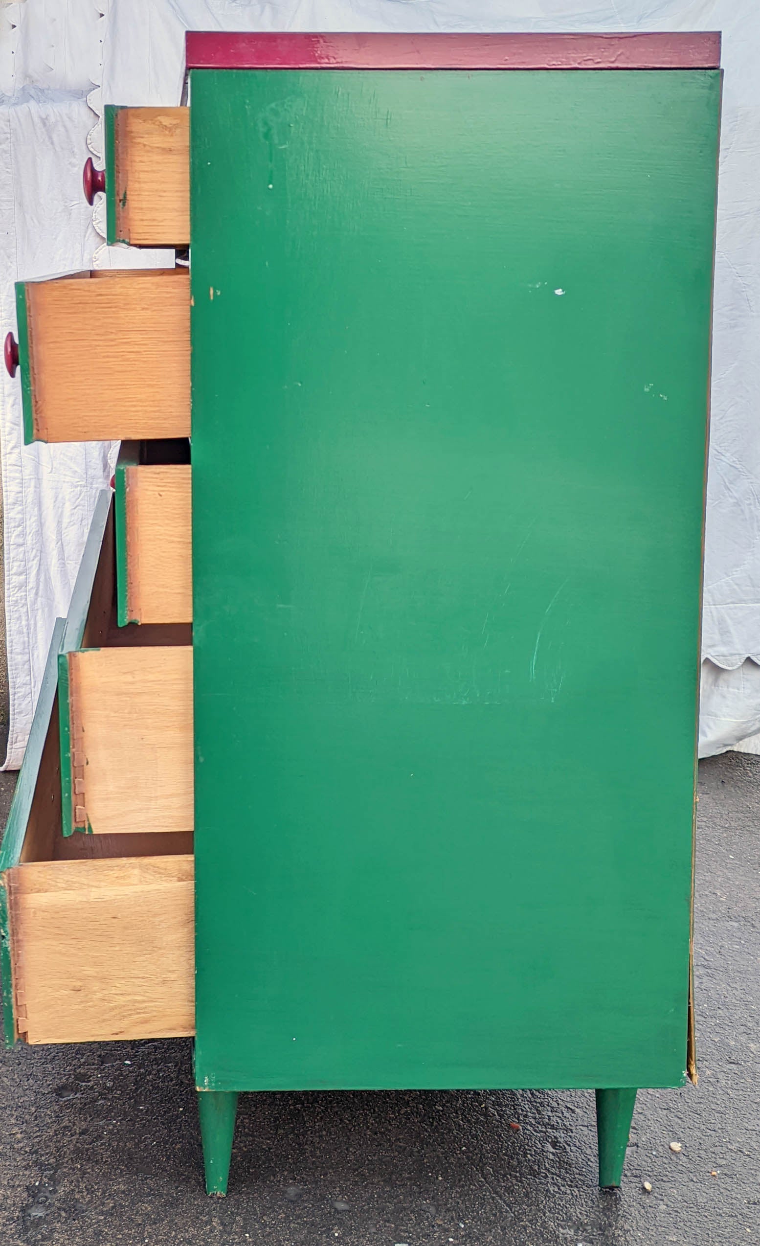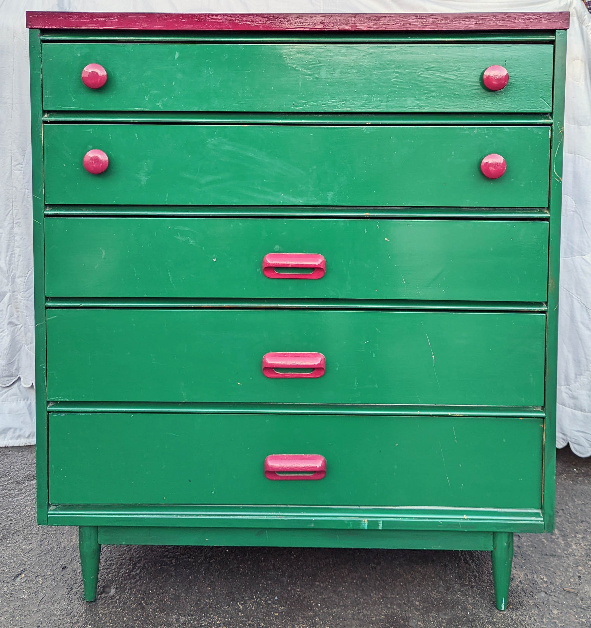 Green & Pink Vintage Old Mid Century Modern Antique Solid Wood Wooden Dresser Highboy High Boy Chest 5 Drawers