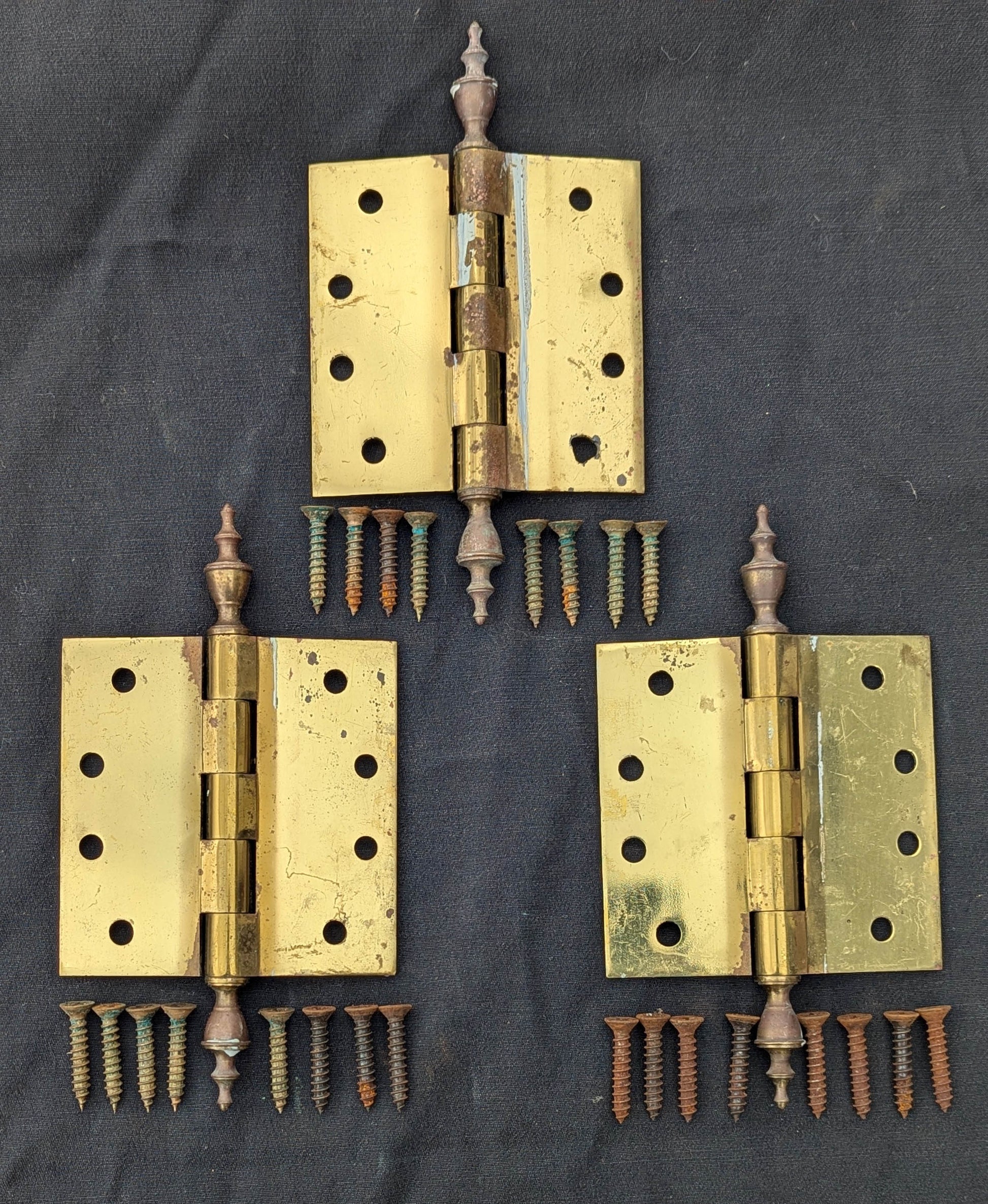 3pc Set 4"x4" Vintage Old "Lawrence" SOLID Brass Exterior Entry Door Ball Bearing Architectural Hinges Steeple Tip Finial Screws Reclaimed Salvaged