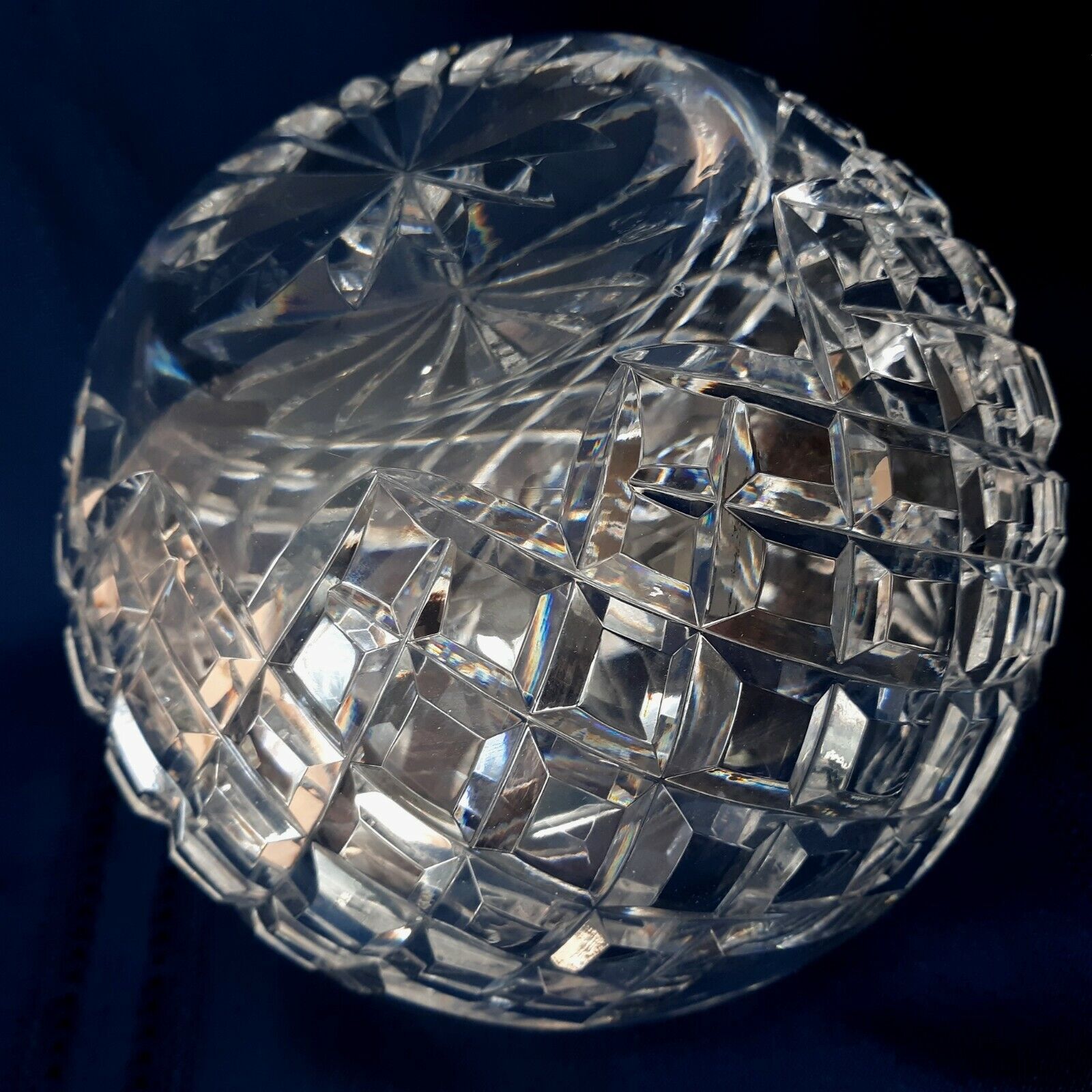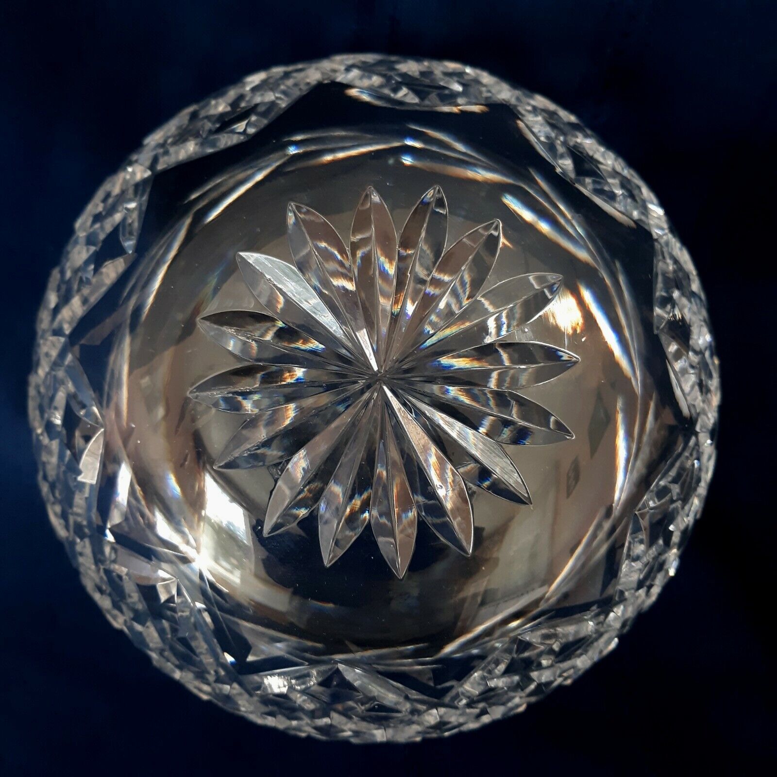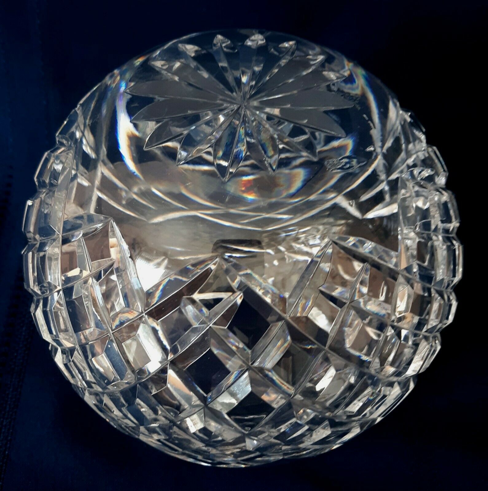 This listing is for a vintage Kosta Boda lead crystal glass heavy table vase. Contemporary art glass vase features a sphere shape with deep cut diamond panels that enhance the play of light across the clear crystal. Panels are faceted to perfection. Starburst design on bottom. Top displays a laurel wreath band panel (7/8 inch wide). It was purchased in Sweden, late 80’s. Never been used and kept it just for display.