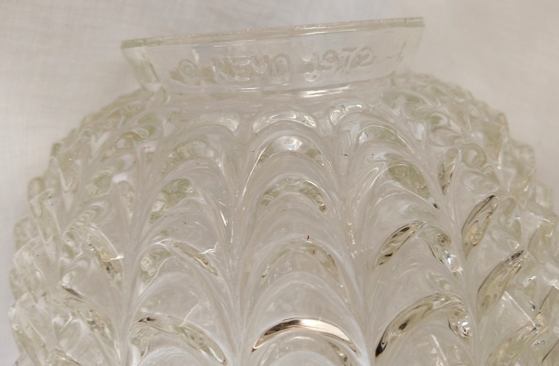 This listing is for a beautiful beehive shaped clear glass large heavy lampshade with brass plated metal finial. Lampshade could be used for pendant or ceiling light fixtures. It features striking draped fabric texture glass (swag design) that gives a true look of elegance. Glass is marked Nemo 1972 along the upper edge. Lampshade was kept in an enclosed case of a lamp factory outlet that went out of business over 25 years ago. Never been used.
