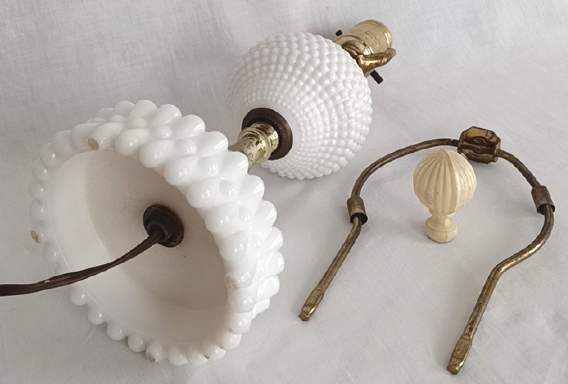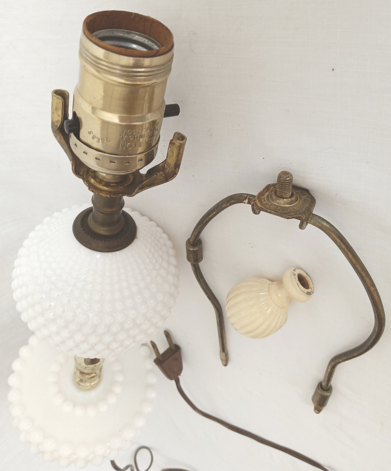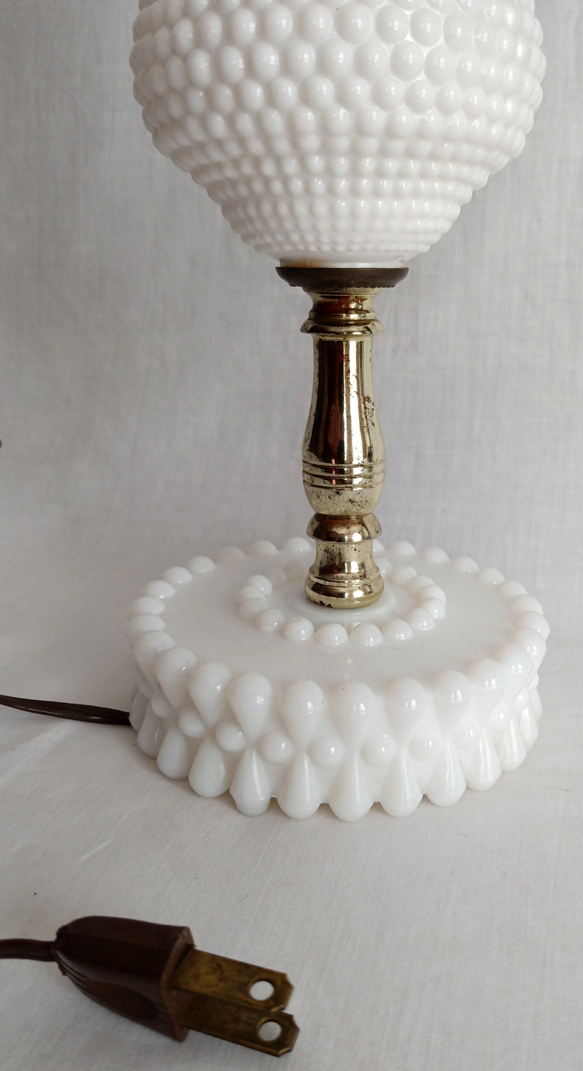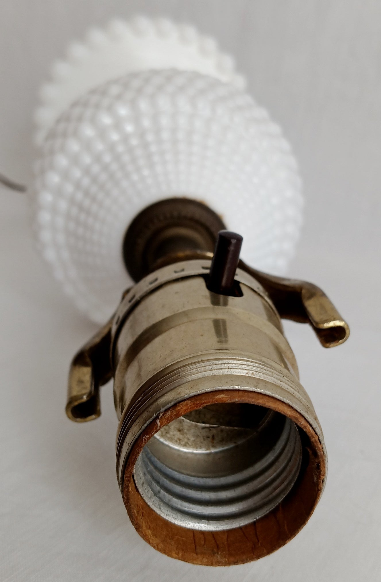 This listing is for a Mid-Century milk glass lamp. It features a body with hobnail design and a round base with tear drops patterns. Chrome and brass plated metal finish inner hardware in between. Lamp comes with brass plated metal harp and hard plastic finial (sphere shape). Lamp holder is made by Leviton with press on and off switch and 660W - 250V UL stamped on it. Lamp takes a standard bulb max 40 Watt. All parts are in good working condition. Bulb and shade are not included.
