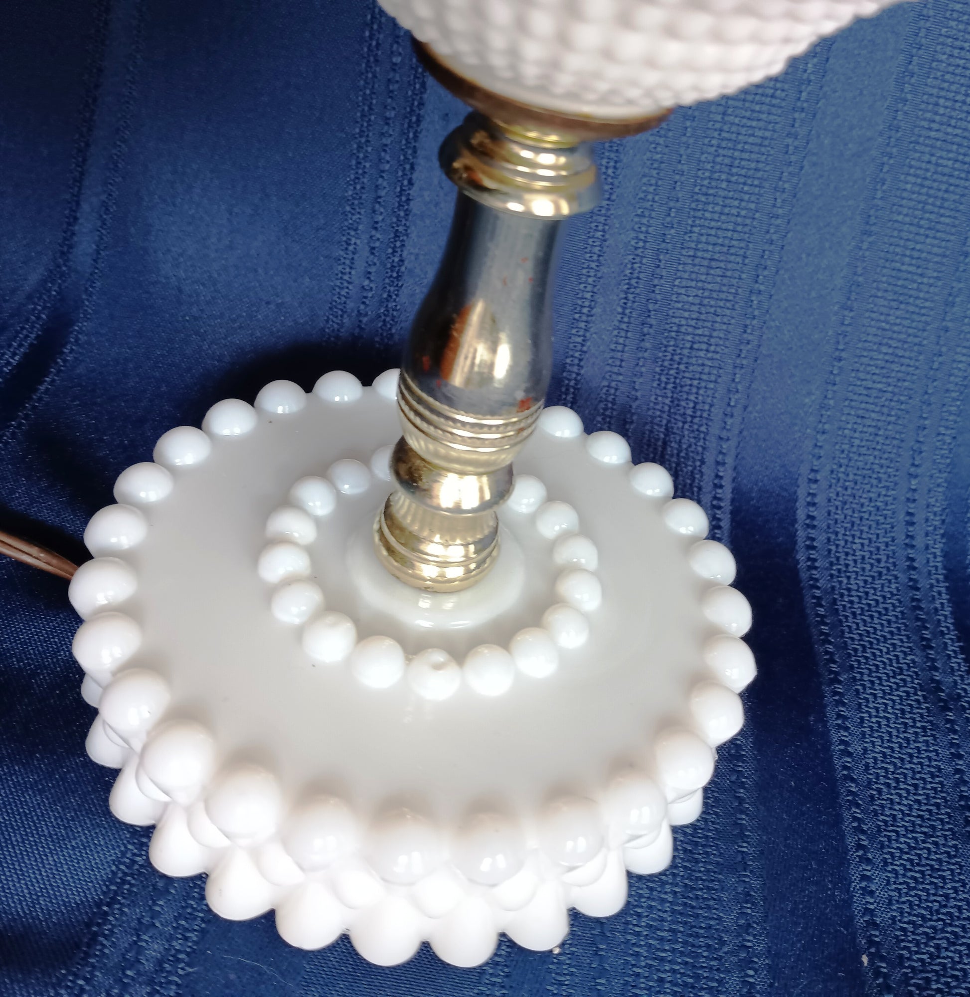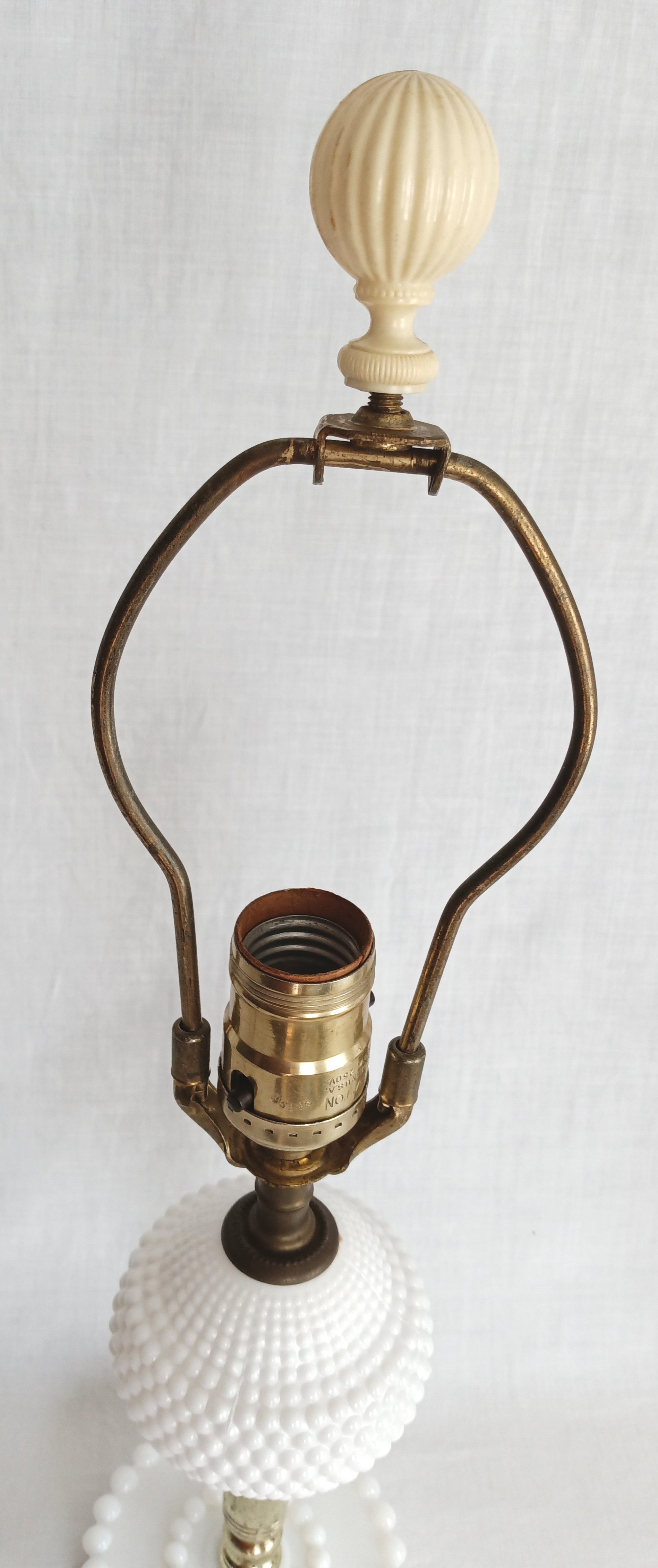 Mid Century Milk Glass Beaded Hobnail Tear Drops Design Table Lamp Desk Boudoir Bedroom Vanity w/Harp + Finial 18" Tall Retro Lighting