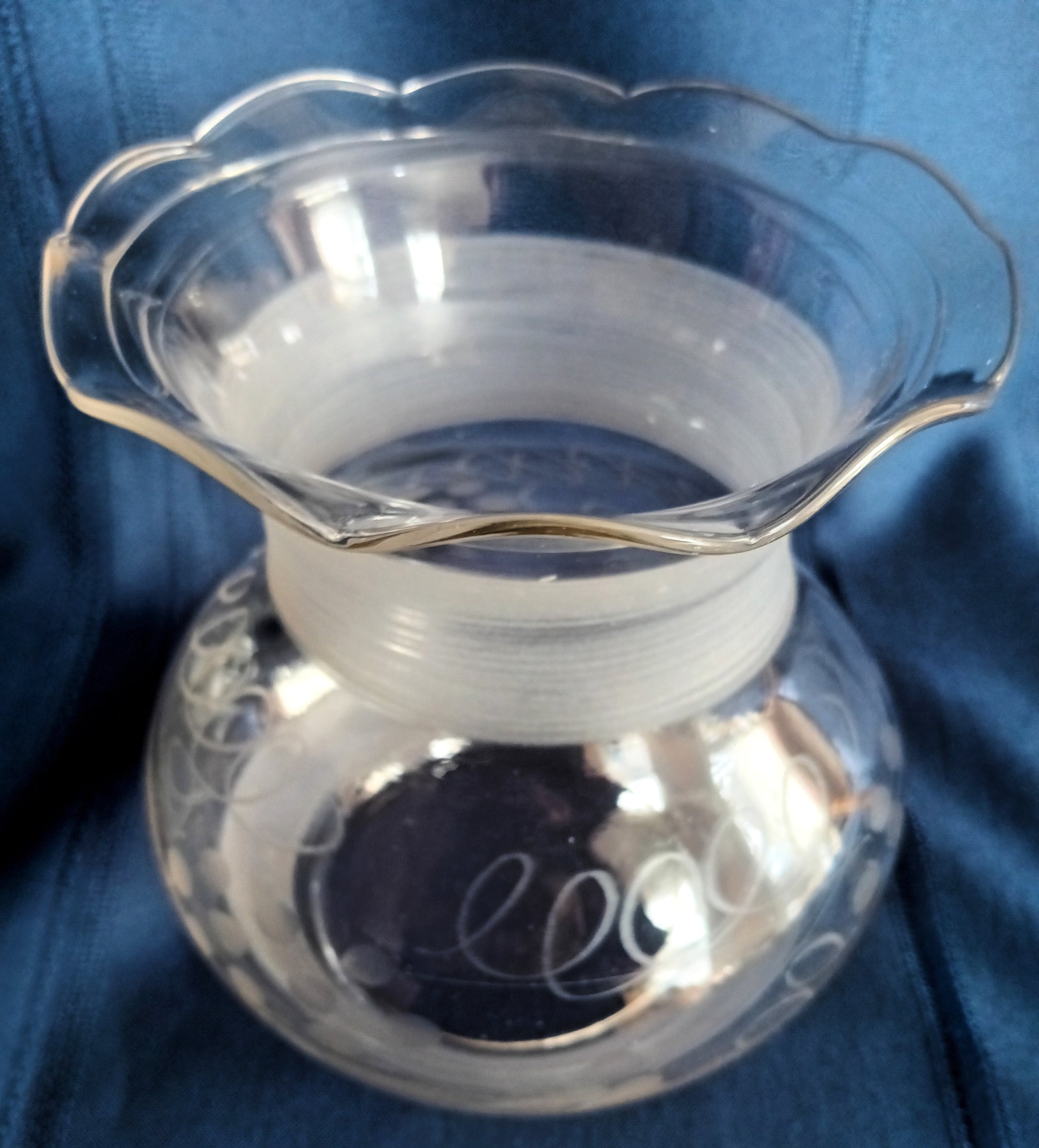 This listing is for a hand-blown clear glass lampshade with etched grape design and fine ring patterns under top and above bottom. Top has a scalloped edge. Replacement chimney/cover light with its antique charm is suited to oil gas/electric table lamps. Lampshade was found in a basement of old Victorian house outskirts of Philadelphia.