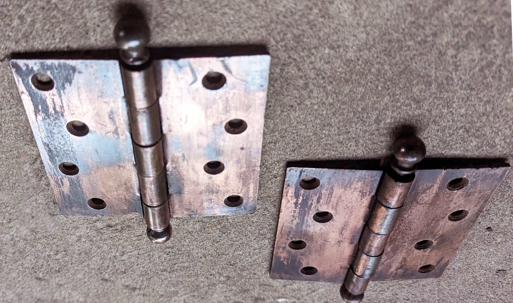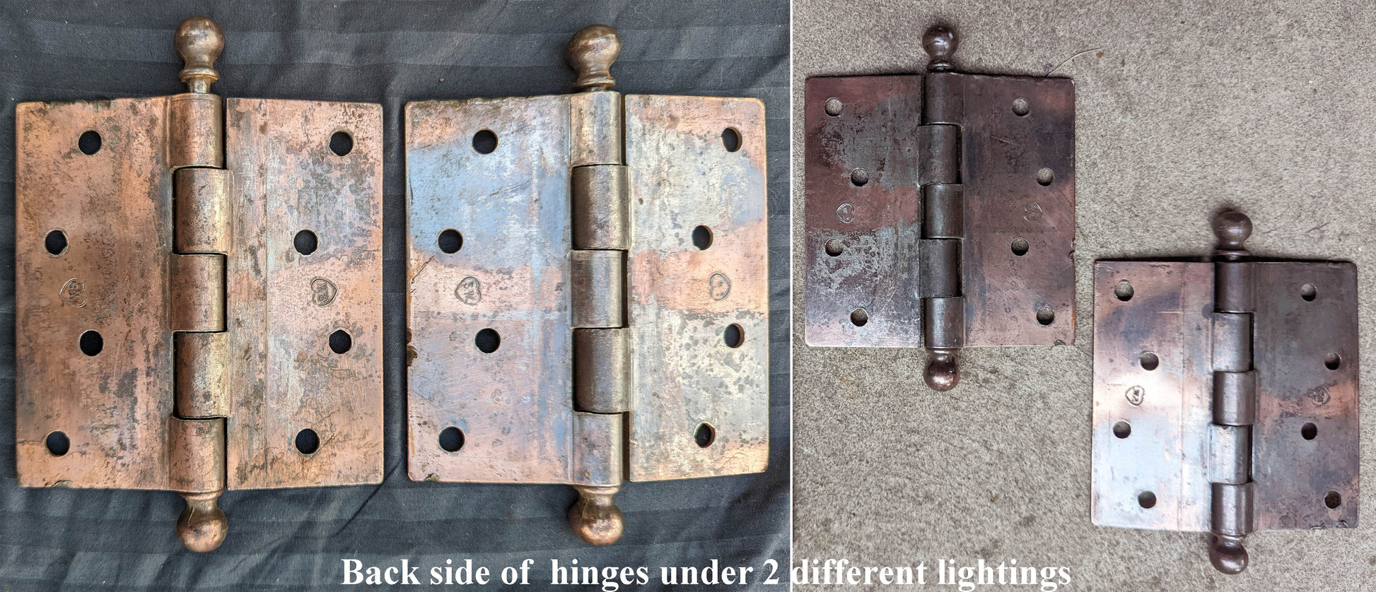 Originally, the hinges were copper plated and coated with a black lacquer finish ("Japanned"). Some of the plating and lacquer wore off over the years leaving them with a nice, distressed finish.