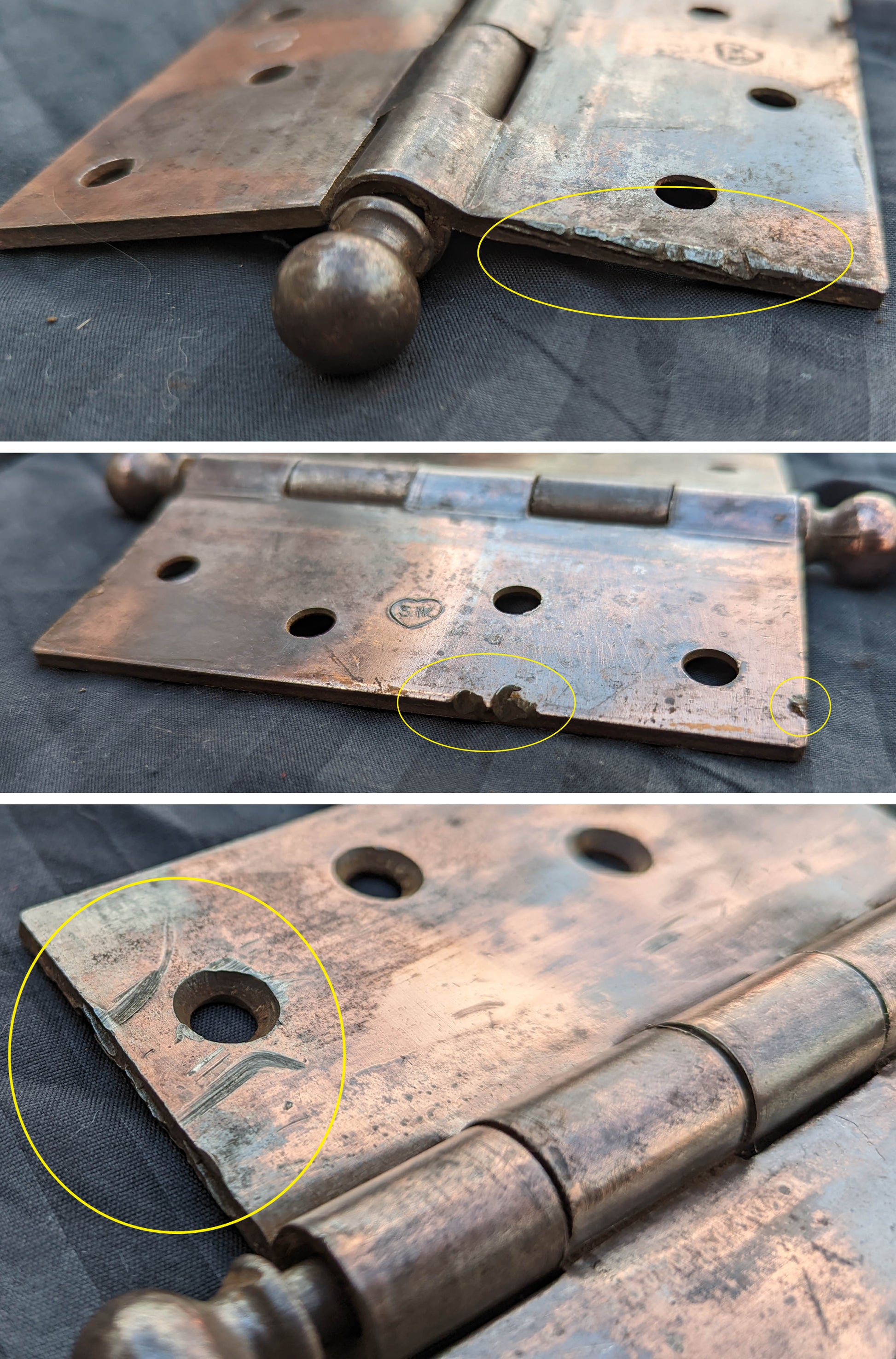Considering their age, the hinges are in great condition. They have the typical nicks, small dents, and scratches that you would expect to find on old, used hinges. The worst blemishes are circled in yellow and shown in a single photo. However, there are no breaks, cracks, bends, or any other serious flaws. Both hinges are perfectly straight and open and close easily.