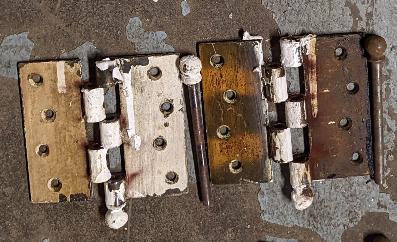 At the point of salvage, the hinges were painted and dirty (see last photo). Since then, we removed the paint, and cleaned them to the best of our ability. There are still tiny spots of rust here and there, but that just adds to their distressed look.