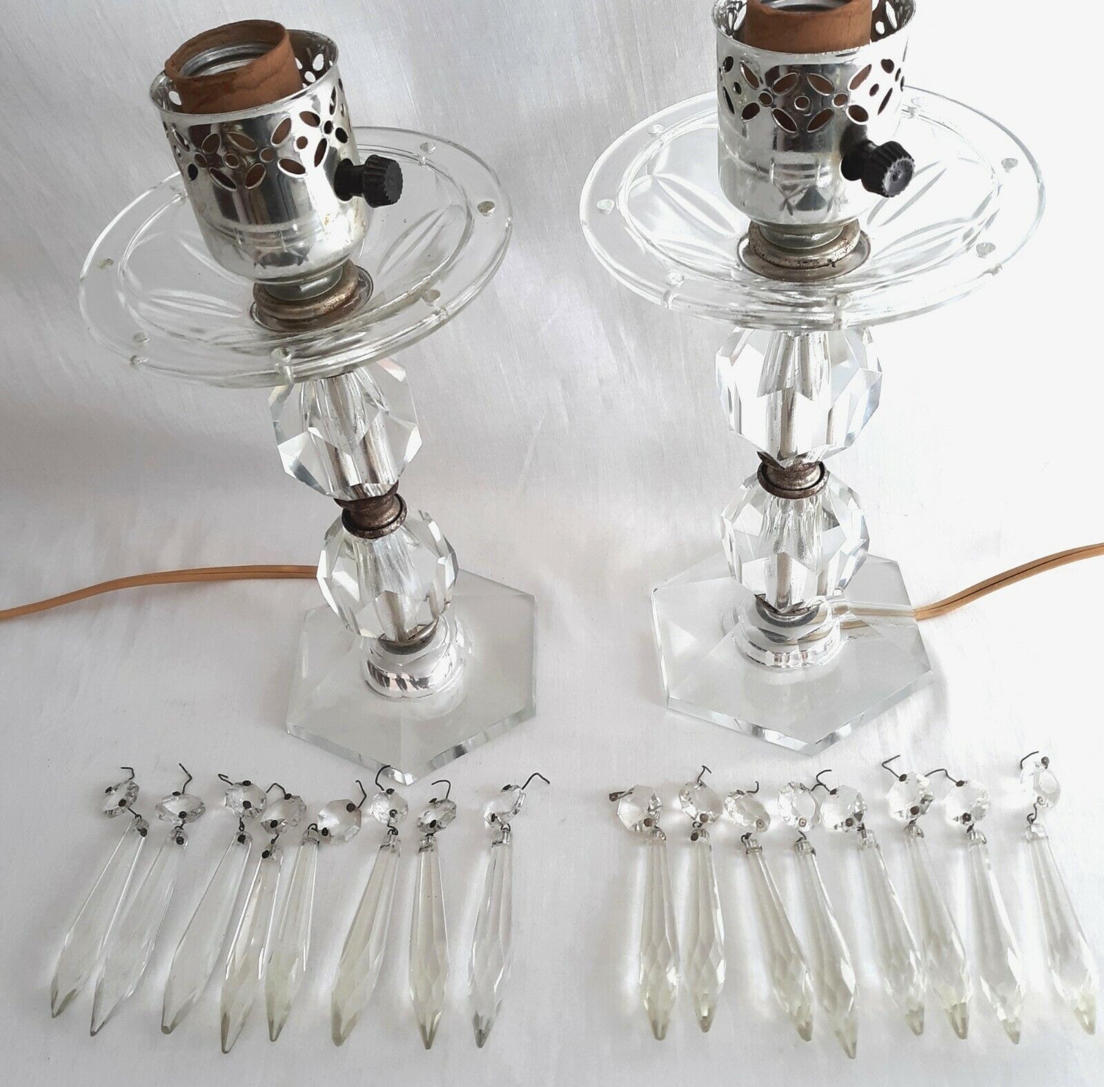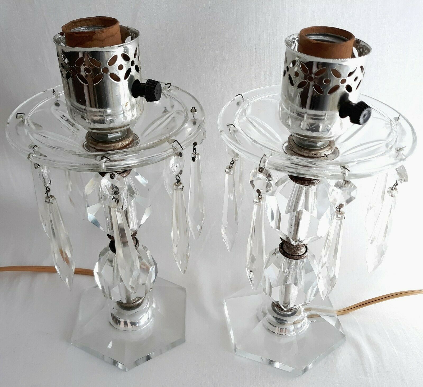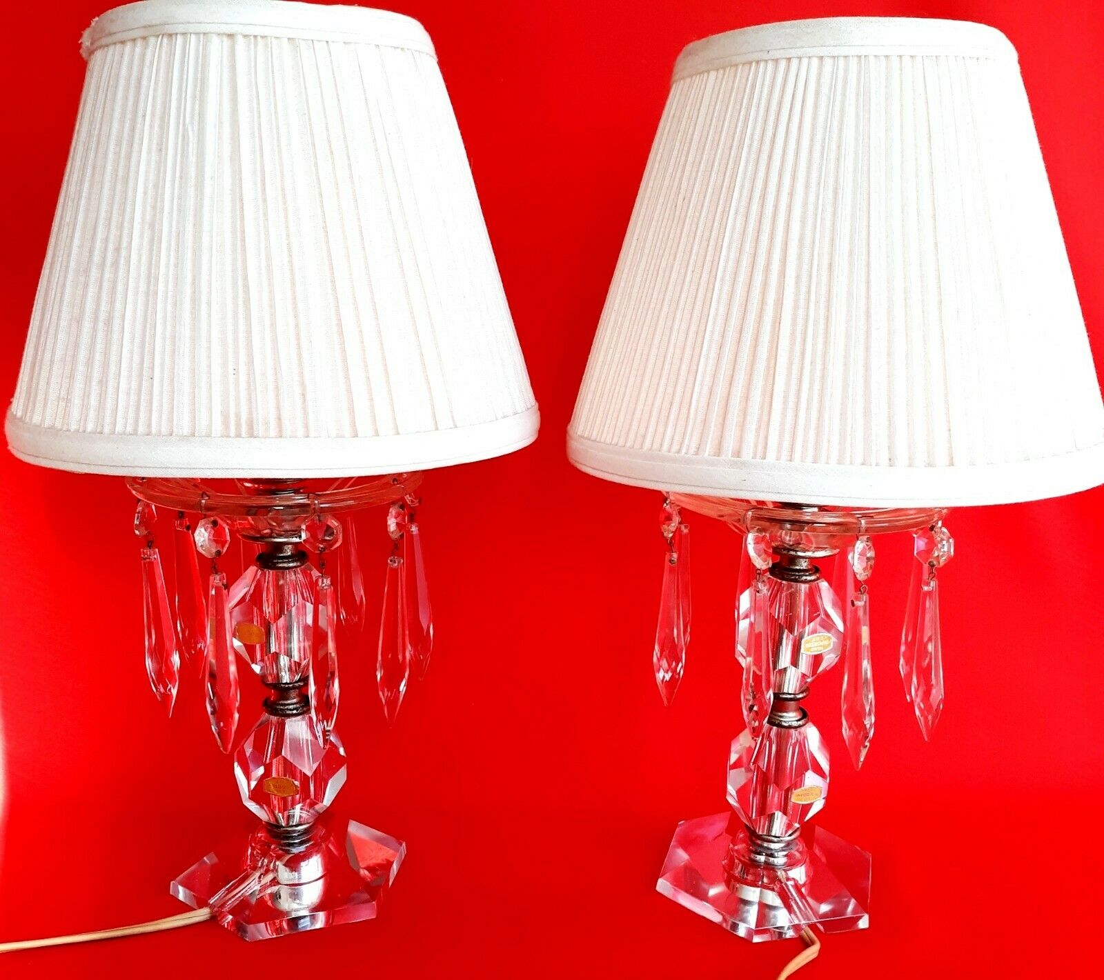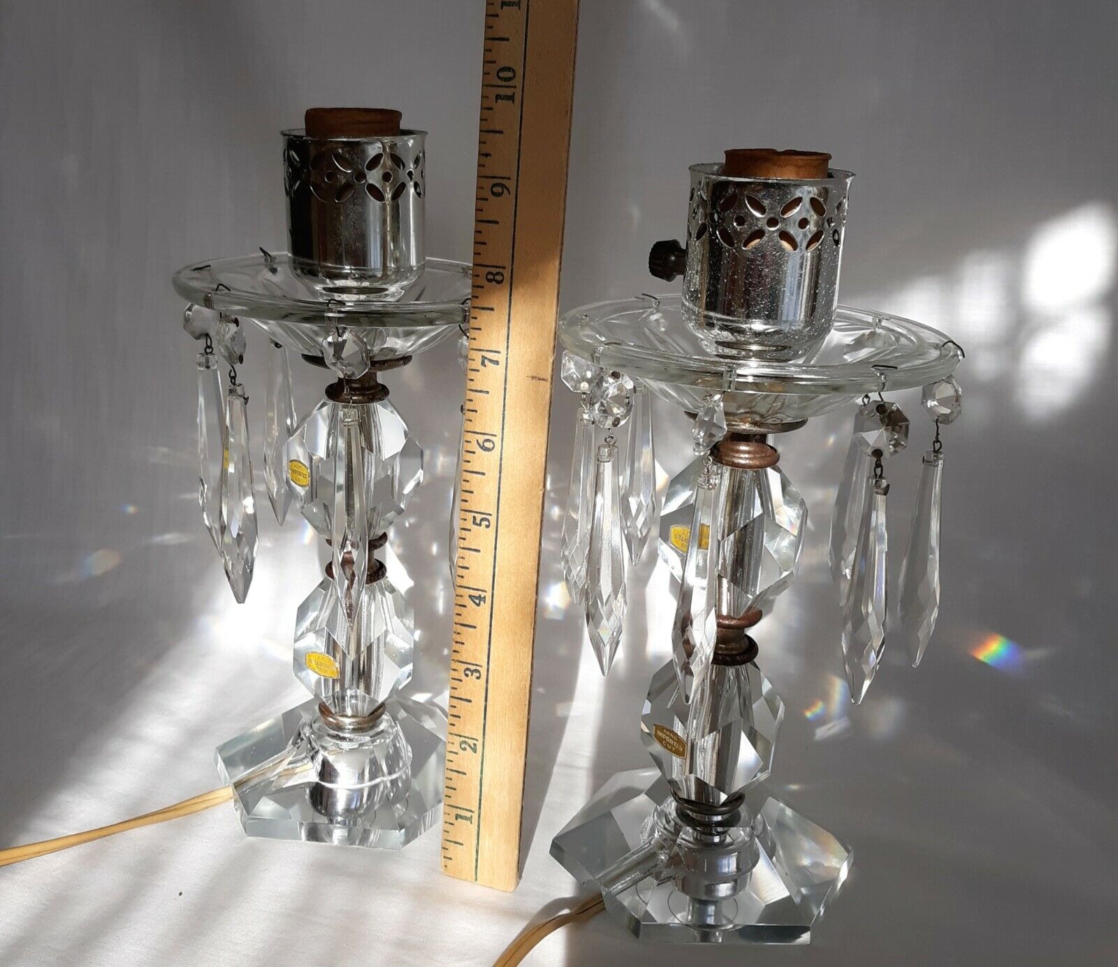 This listing is for elegant vintage pair clear lead crystal glass table electric lamps. Each lamp features a column constructed of 2 oval shapes of multifaceted crystal glass with dramatic tapers and bevels. Chrome plated metal inserts, in between. Heavy crystal base has a hexagonal shape. Top pressed glass bobeche features a flower design with scalloped edge and a set of 8 rows of hanging crystals prisms. Each row has one octagon bead prism and one icicle crystal prism connected with antique brass pins. Sockets are made by Leviton with rotary on/off switches. Electrical cords are original to the lamps. Lamps are in good working condition. Bulbs and shades are not included. Imported Hand Cut (crystal) stickers on both lamps.