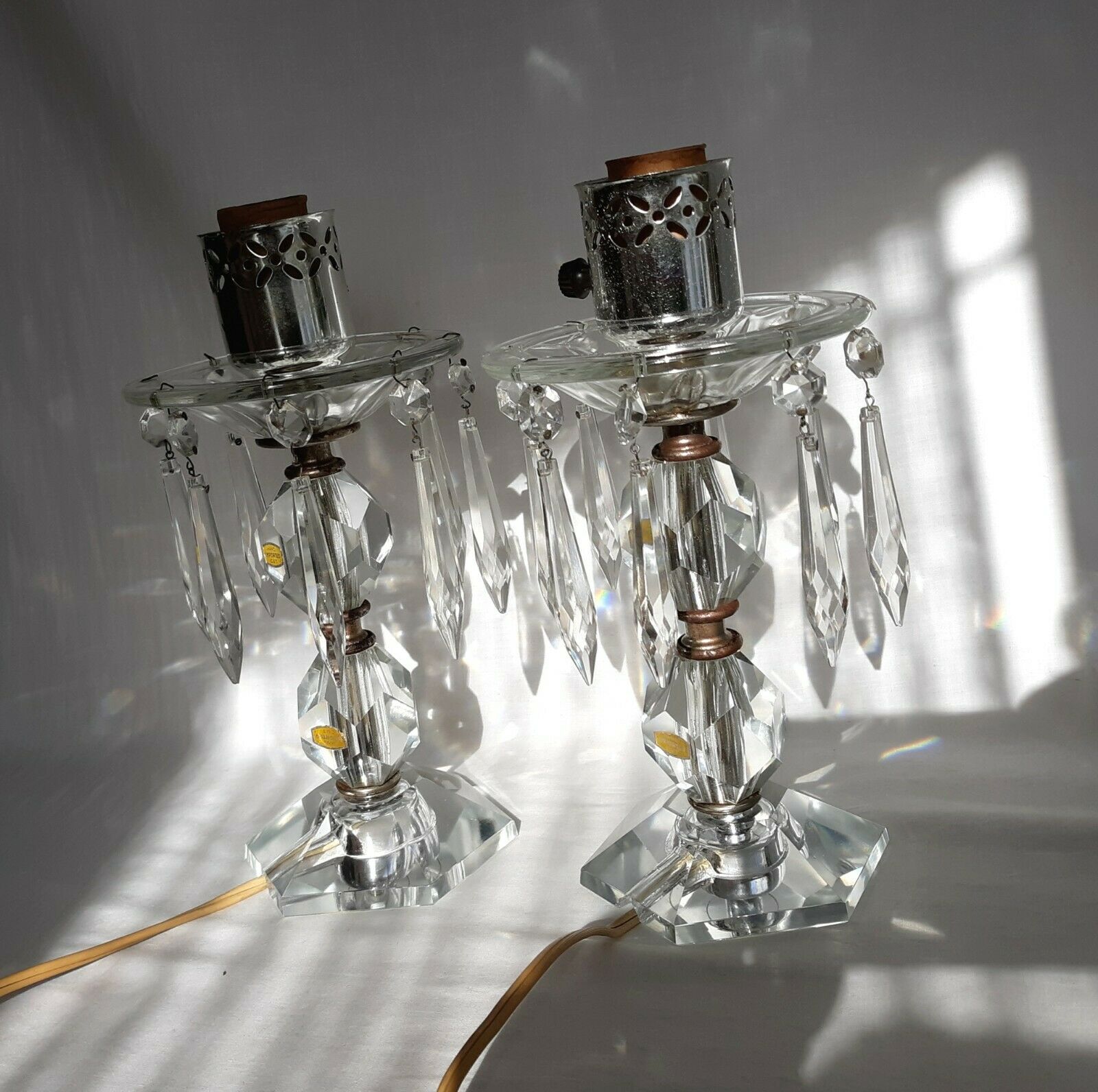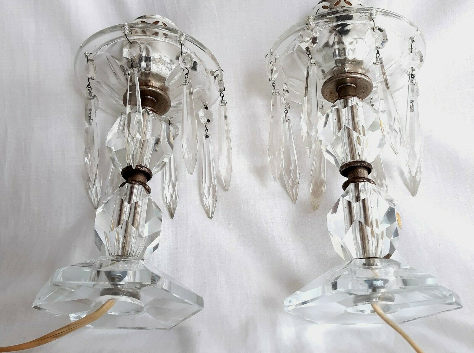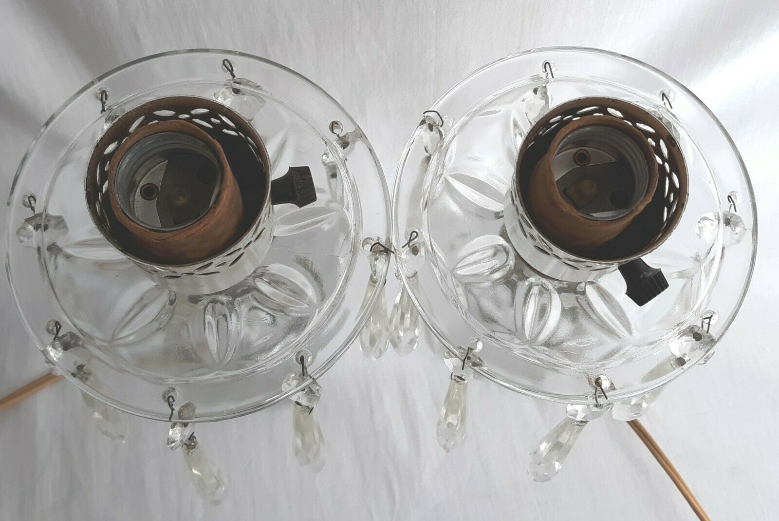 Lamps are in great condition with light wear expected and commensurate with vintage items. Crystal glass parts and hanging crystal prisms are in good condition with occasional flea bites and slight nicks on the fine glass edges. No missing parts. Light rusty spots near and on metal parts. Please see pictures.