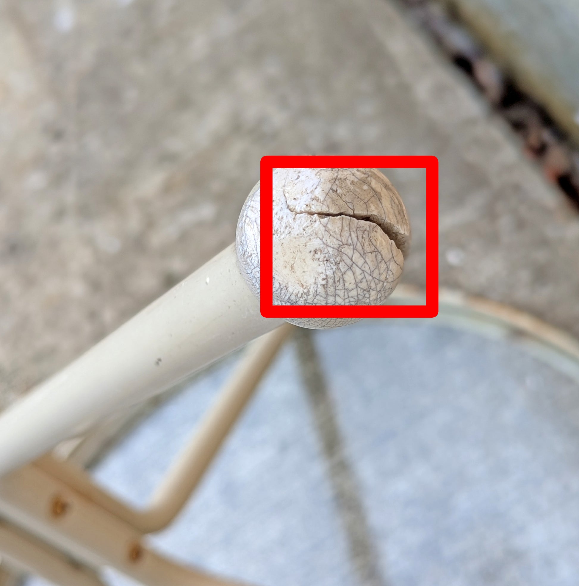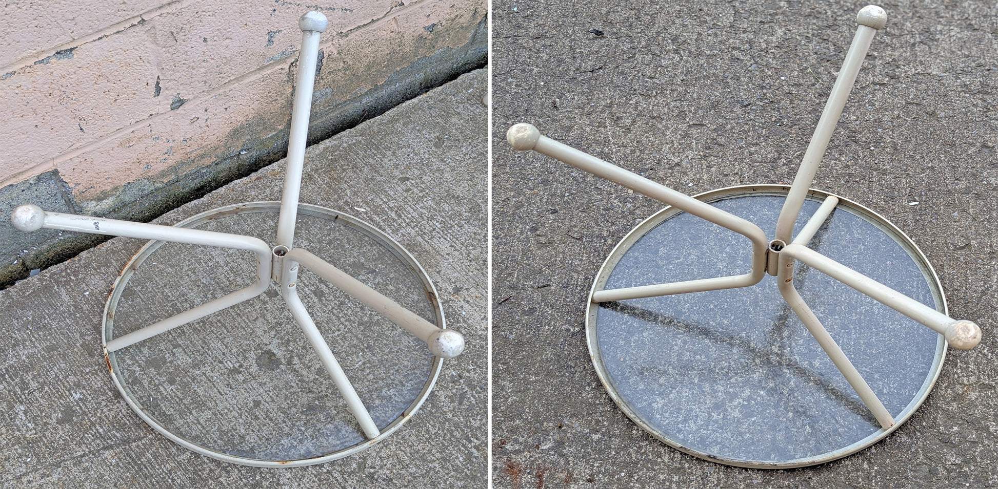 The tables have a three leg base connected together by a metal cylinder at the bottom. Each leg has a rubber cap protecting the metal from rust or scratches. One of the rubber caps on the 2nd table is cracked (see last photo)
