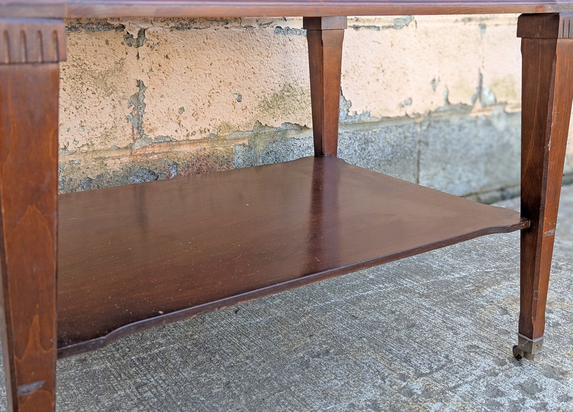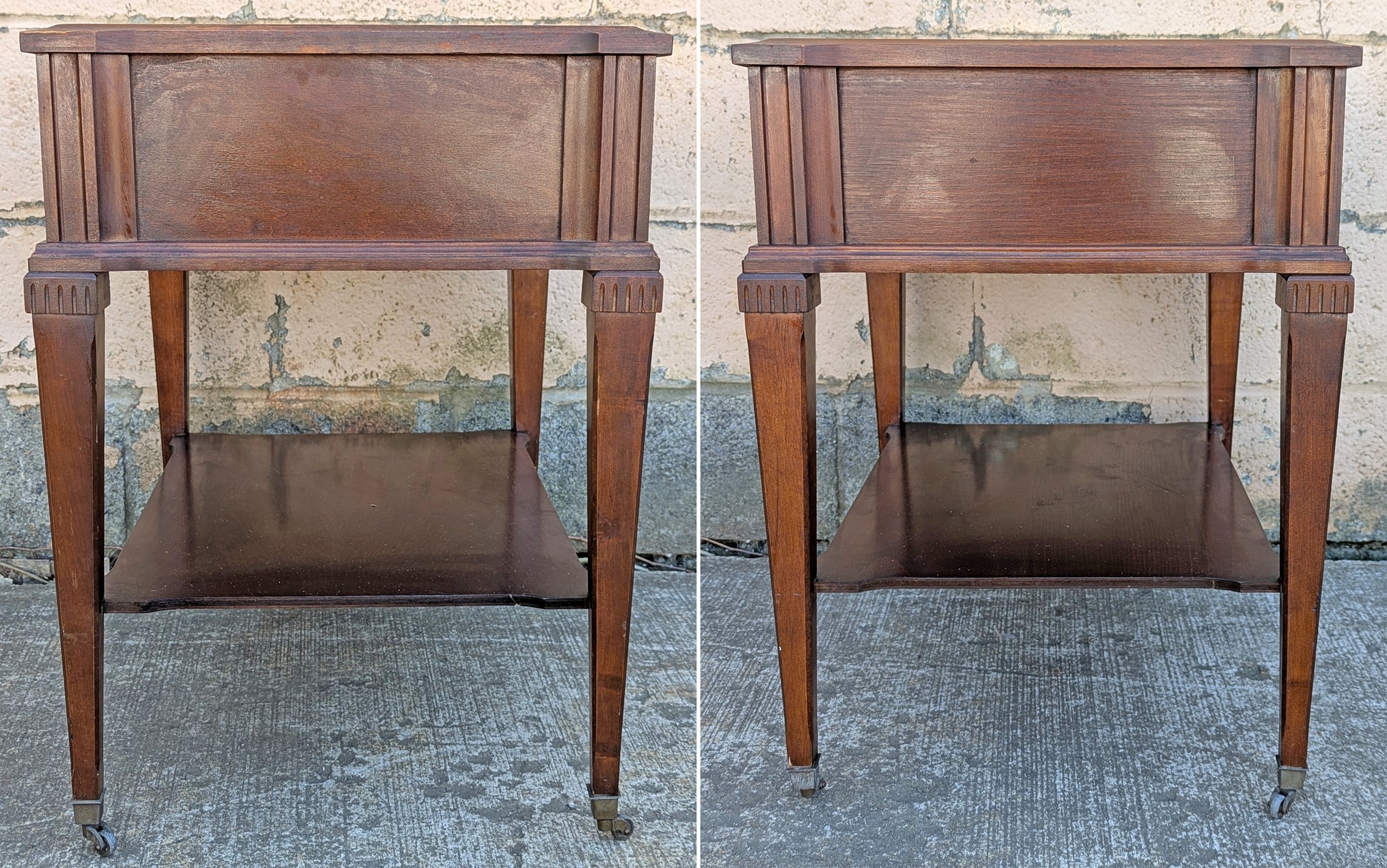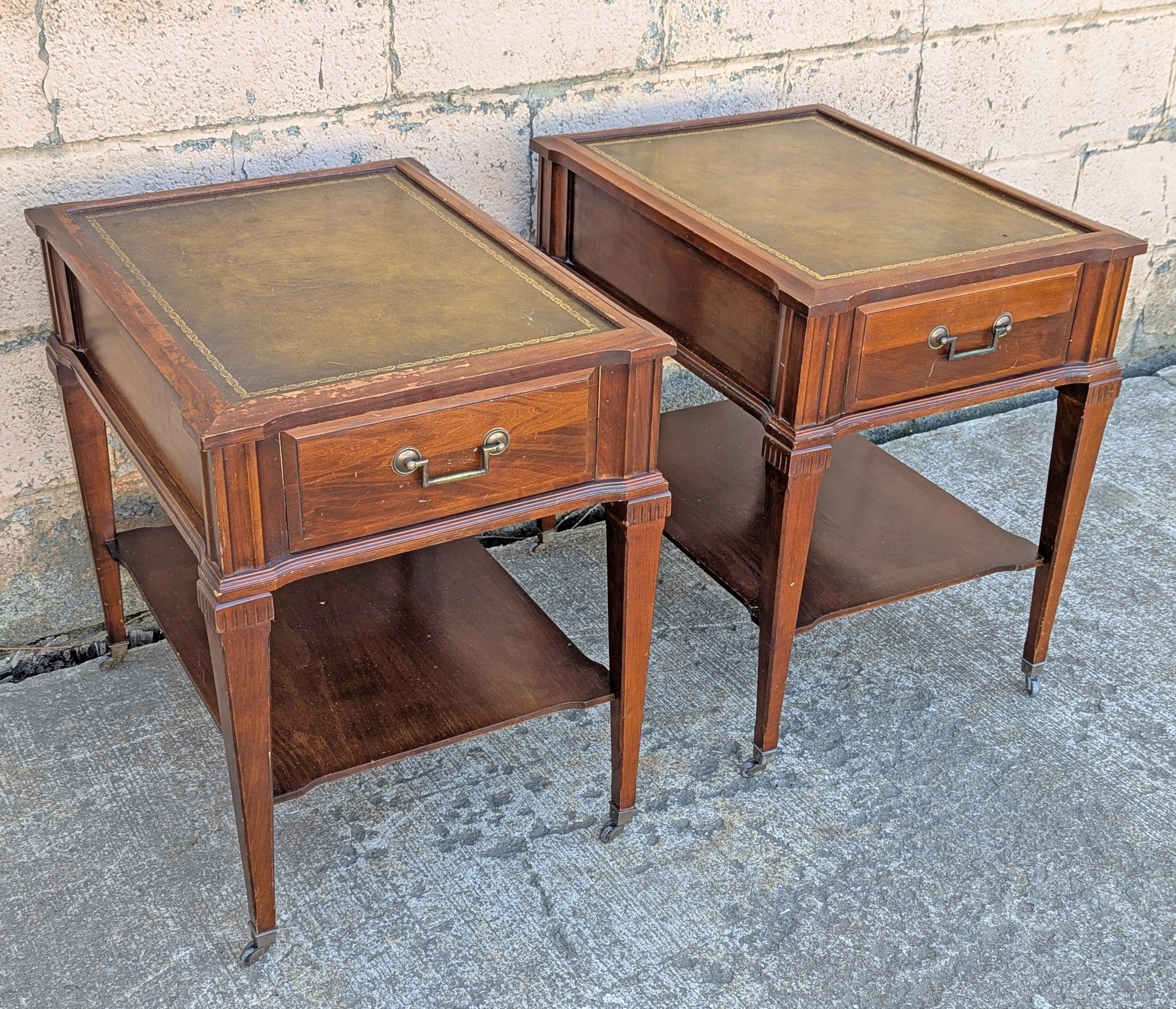 Each table sits on 4 elegant, tapered legs with nice details at the top. The drawer has metal, drop pull in the center.