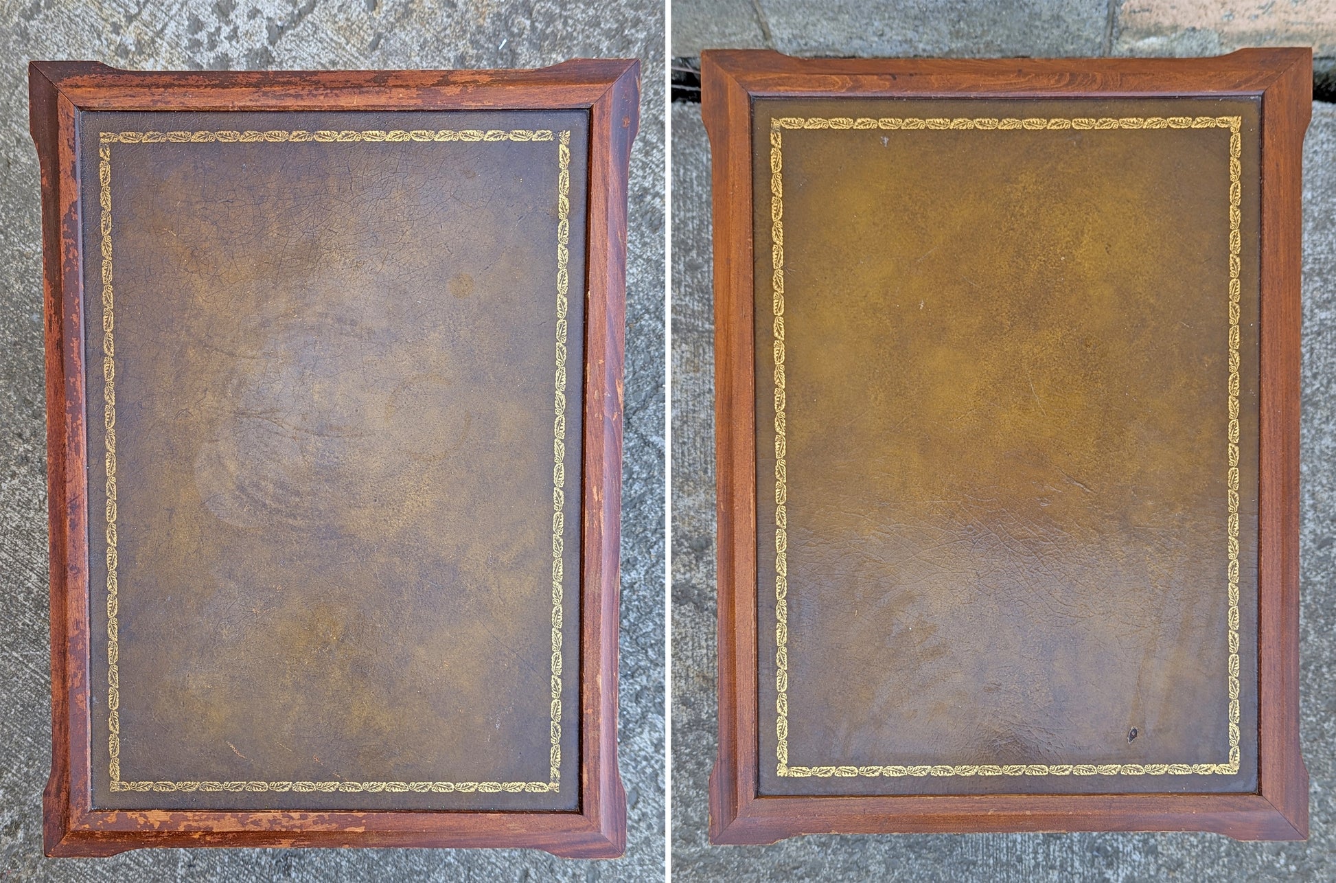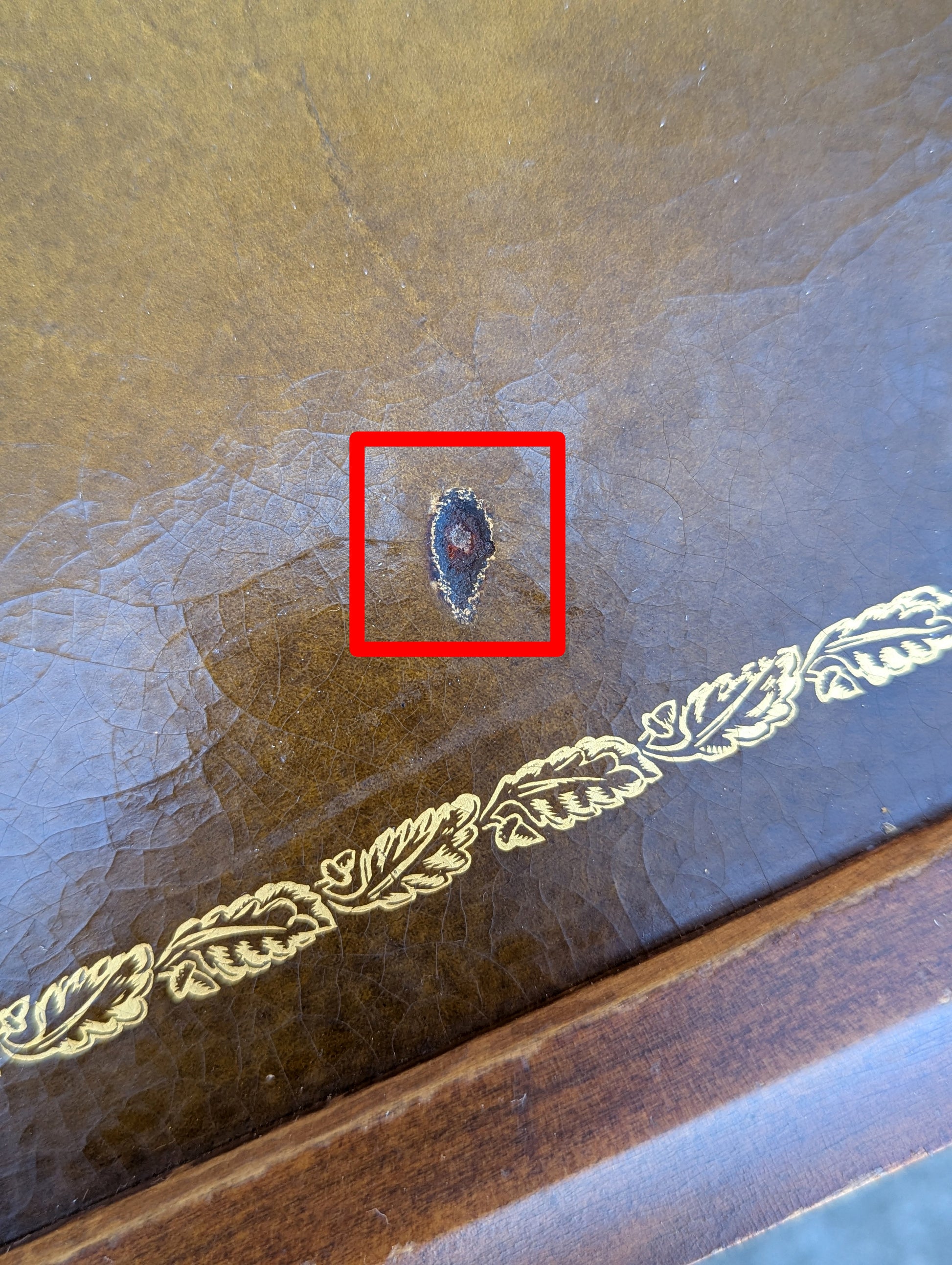 The tables are strong, solid, and sturdy, but have some cosmetic blemishes. Both tables have spots of worn finish (especially Table#1) mainly on the table top edges. The only piece of damage on either table is a small hole in the leather top of table#2 (see last photo). Otherwise, except light scratches and nicks (which you would expect to find on a table this old), there are no breaks, gouges, rot, warp, or any serious flaws.