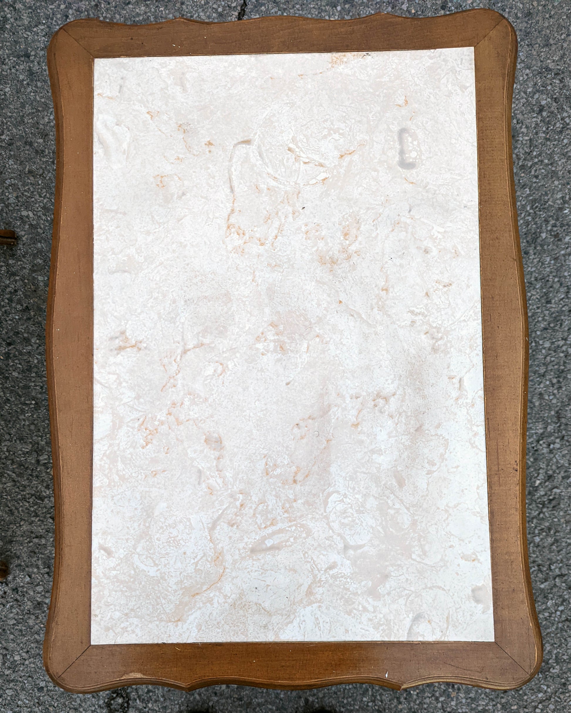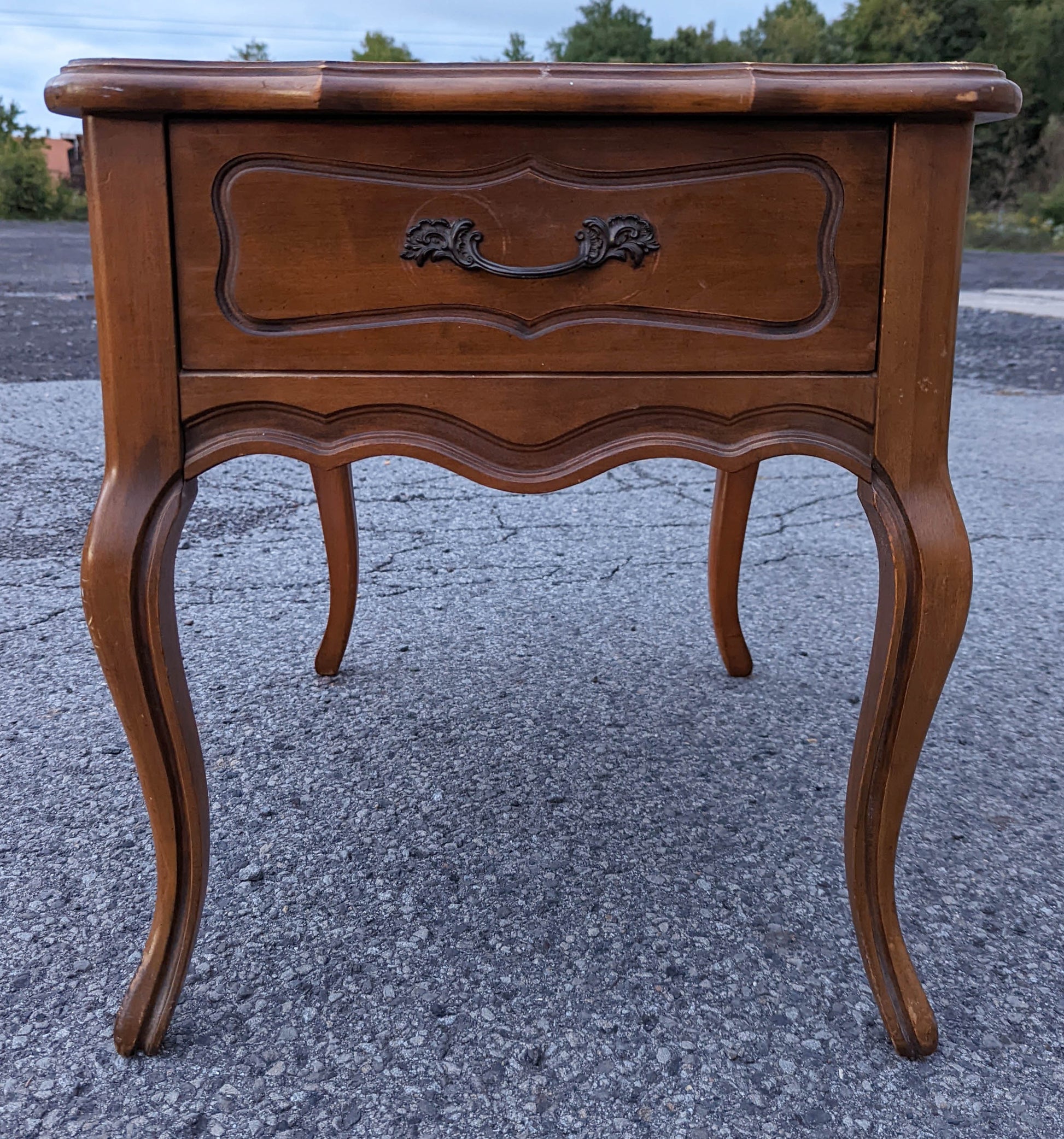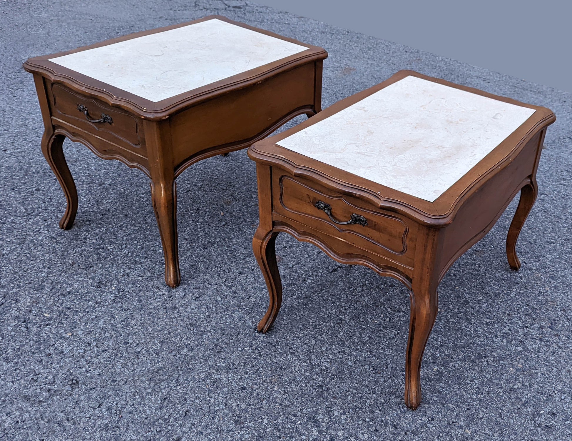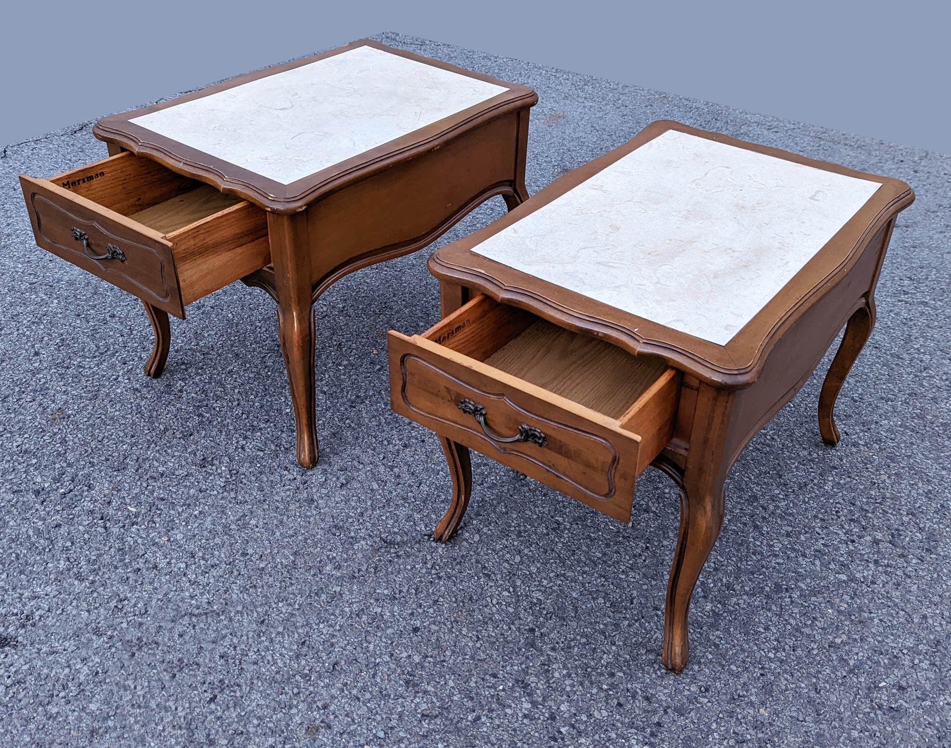 Vintage, French style, end tables or nightstands salvaged from Northeastern Pennsylvania. They were made by, "Mersman," of Celina, OH and are made of solid maple (no particle board or MDF). The rectangular center panels on top are Formica veneer. They have a marble-grain design.