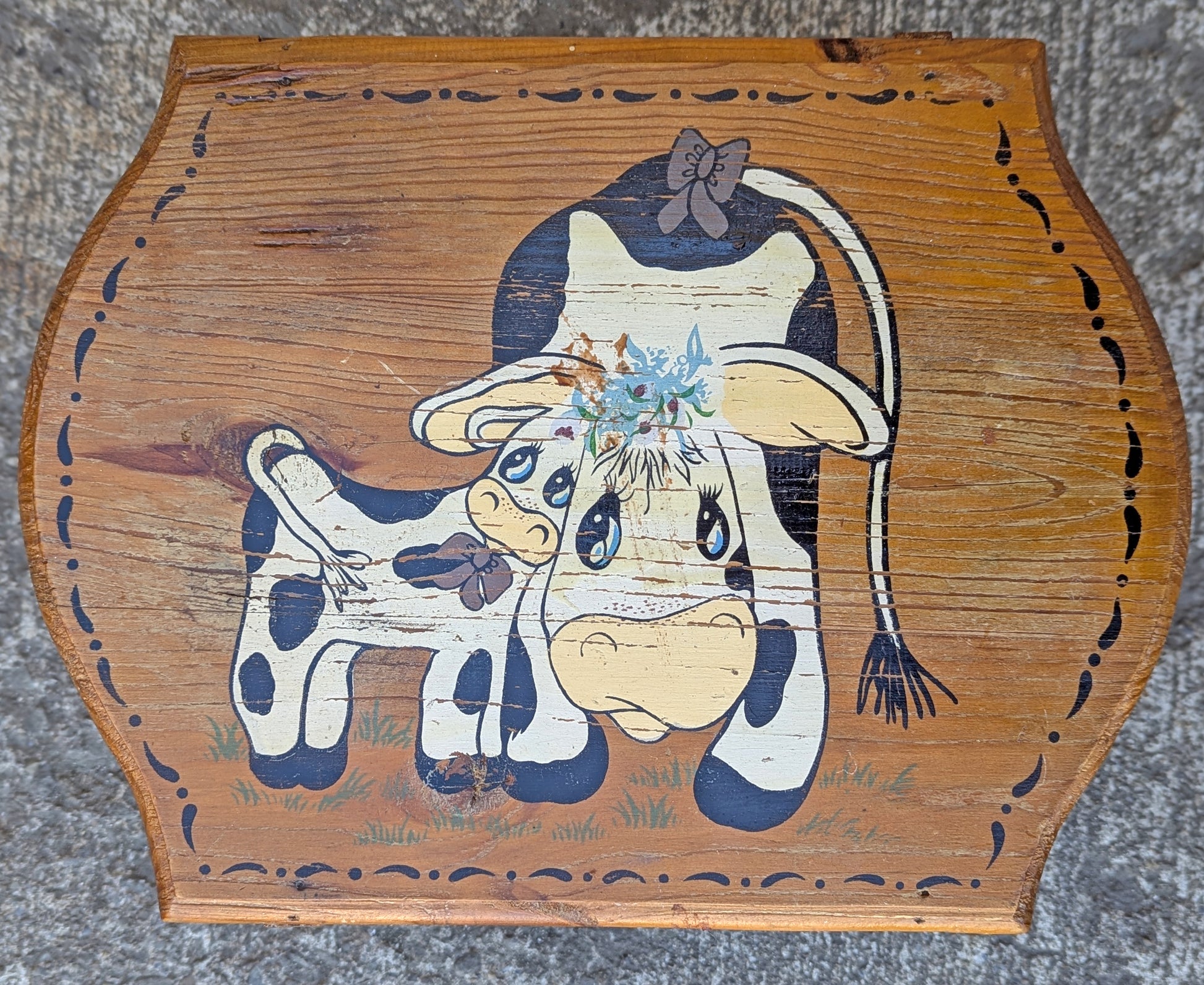 Small Vintage Antique Old Solid Wood Wooden Rectangular Table Foot Step Stool Plant Stand Side Accent Chair Seat Hand Painted Cow