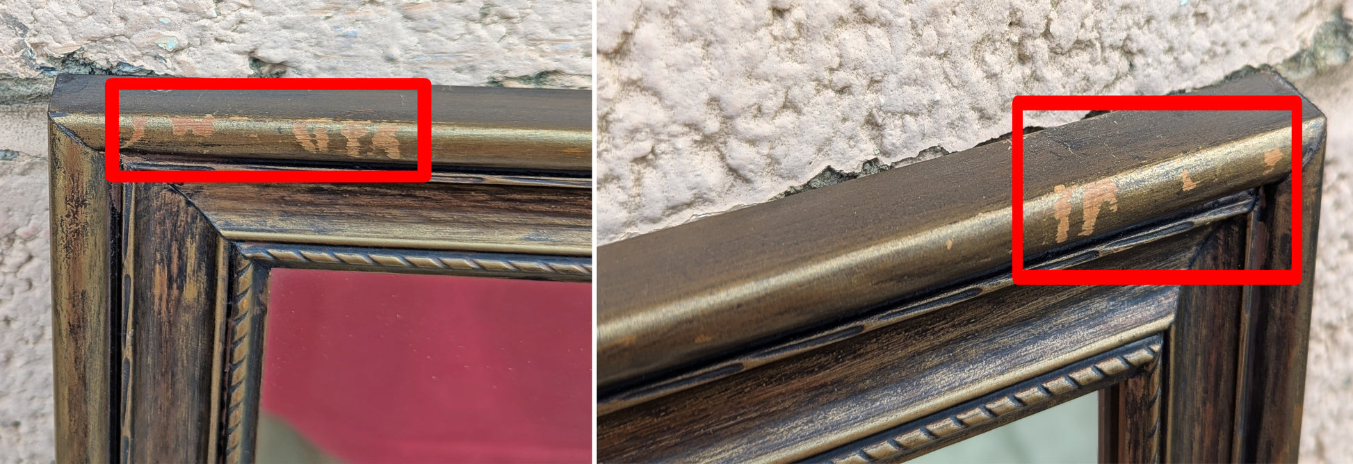 The only "damage" are a few very small scratches in the paint on the top (see last photo). They're hardly notice-able unless you're examining the piece looking for imperfections. Even though they aren't apart of the design, they add to the mirror's distressed look.