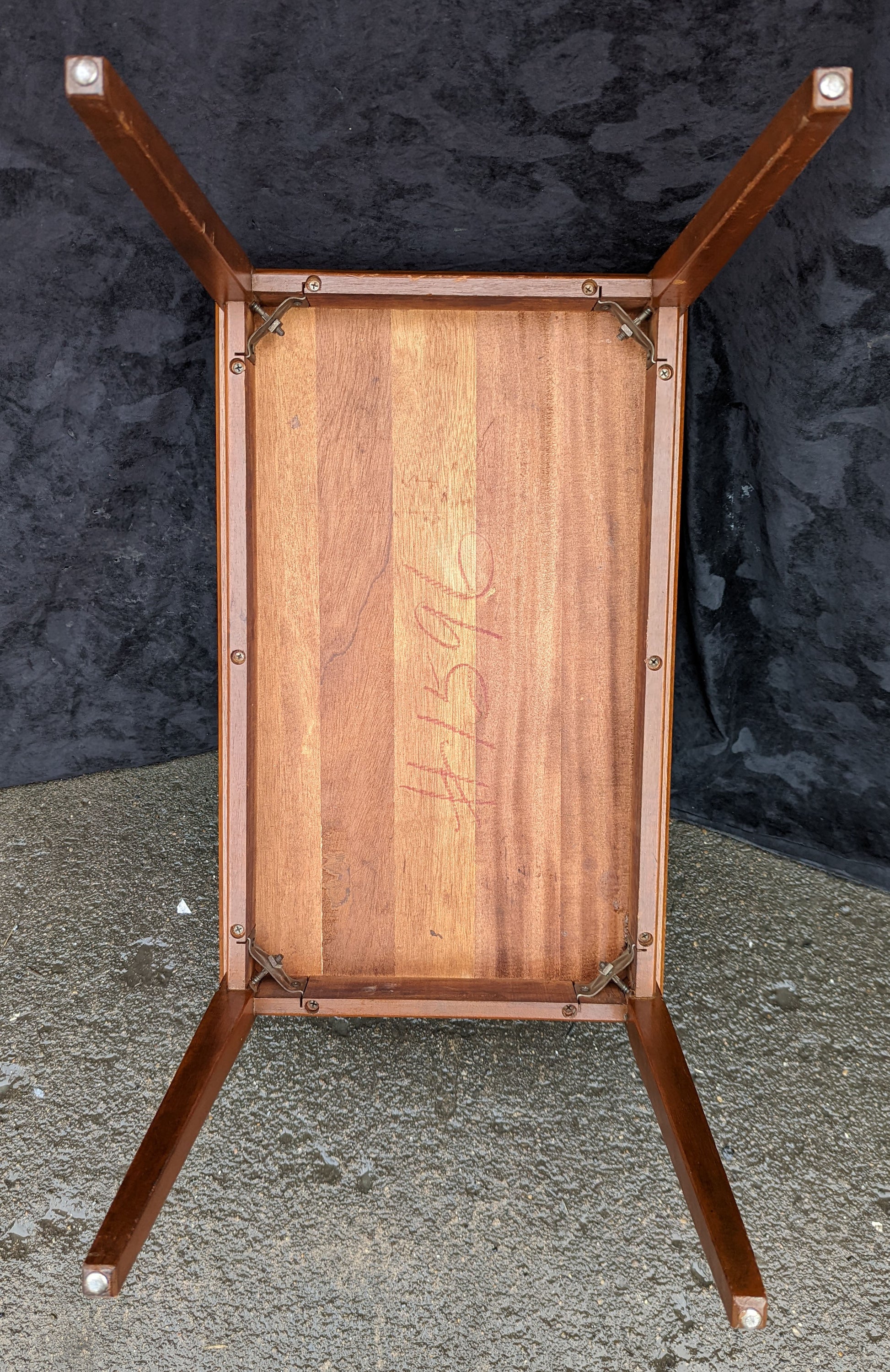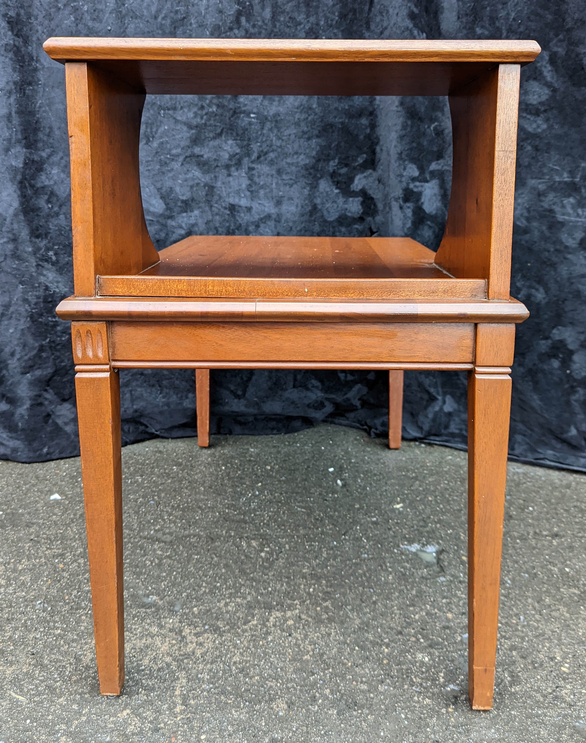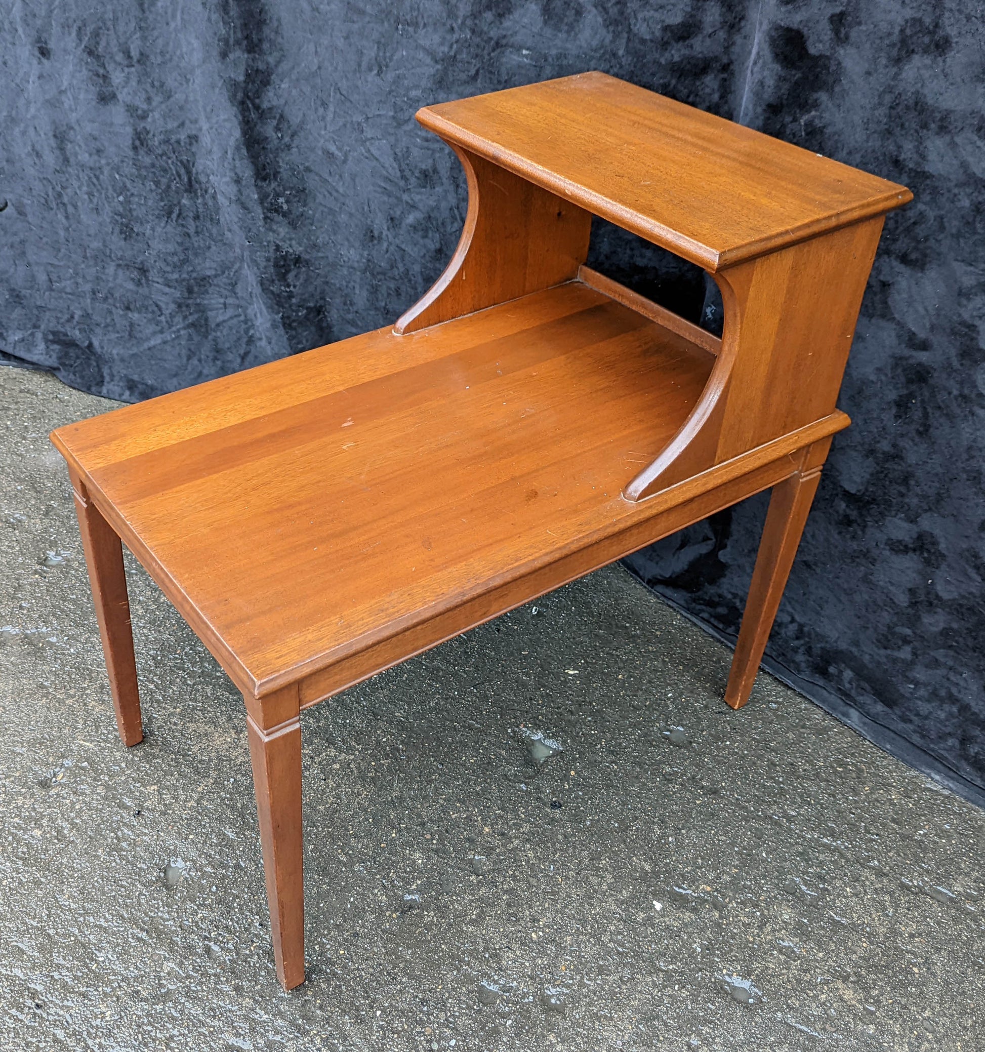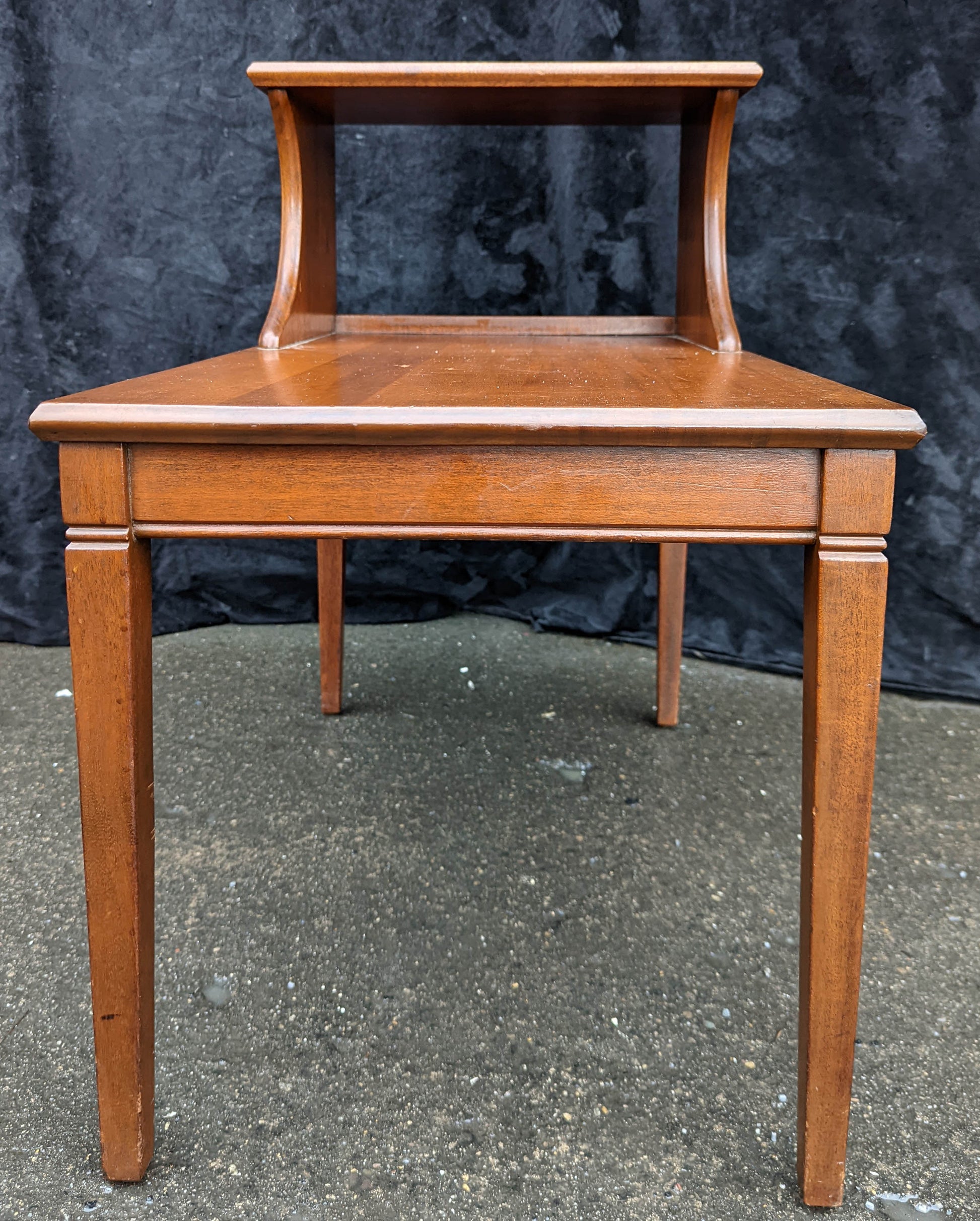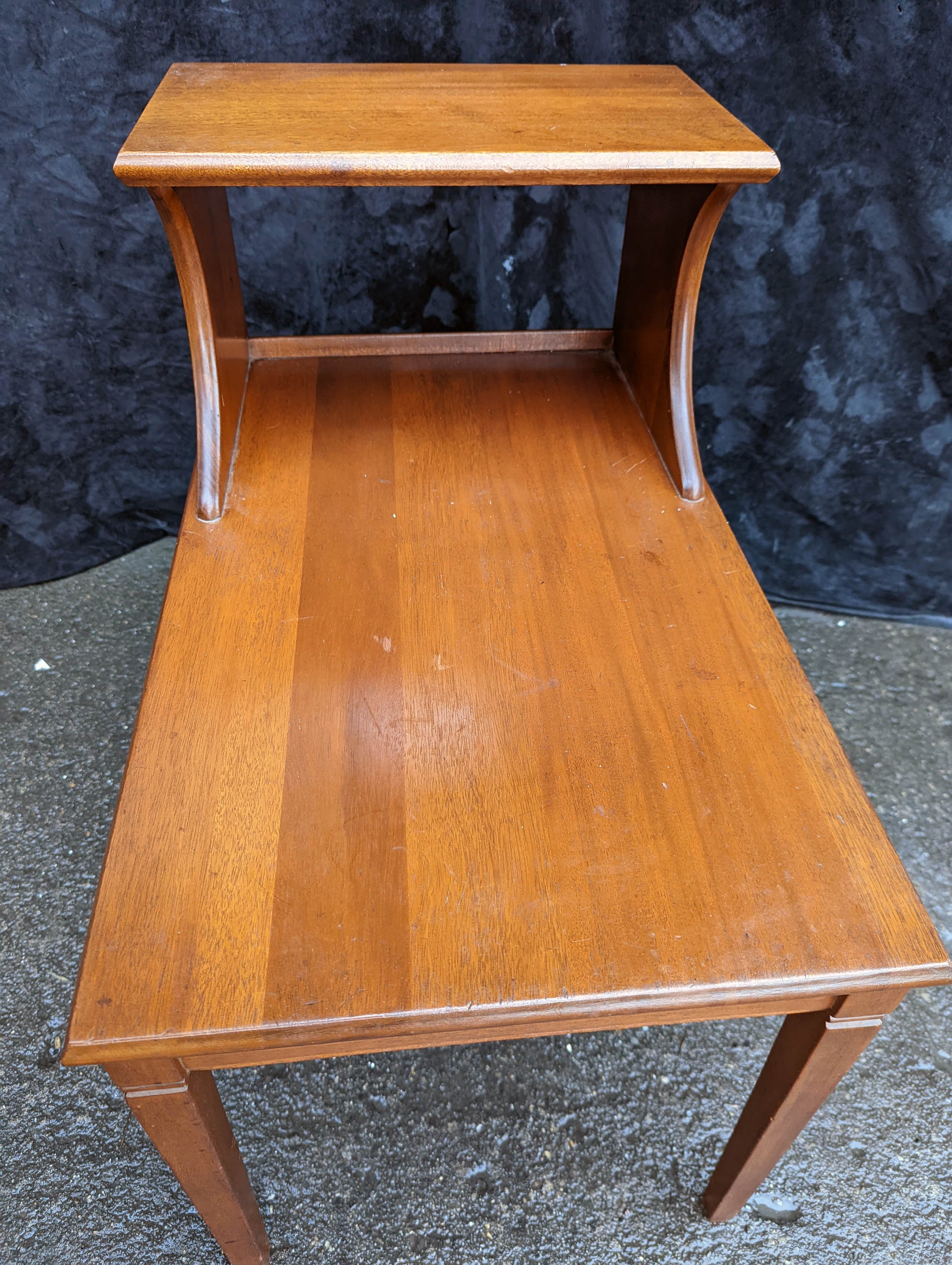 Elegant, Mid Century Modern end or side table salvaged from Northeastern Pennsylvania. It is made of solid mahogany (no particle board or MDF), and has 2 tiers and 4 square tapered legs.