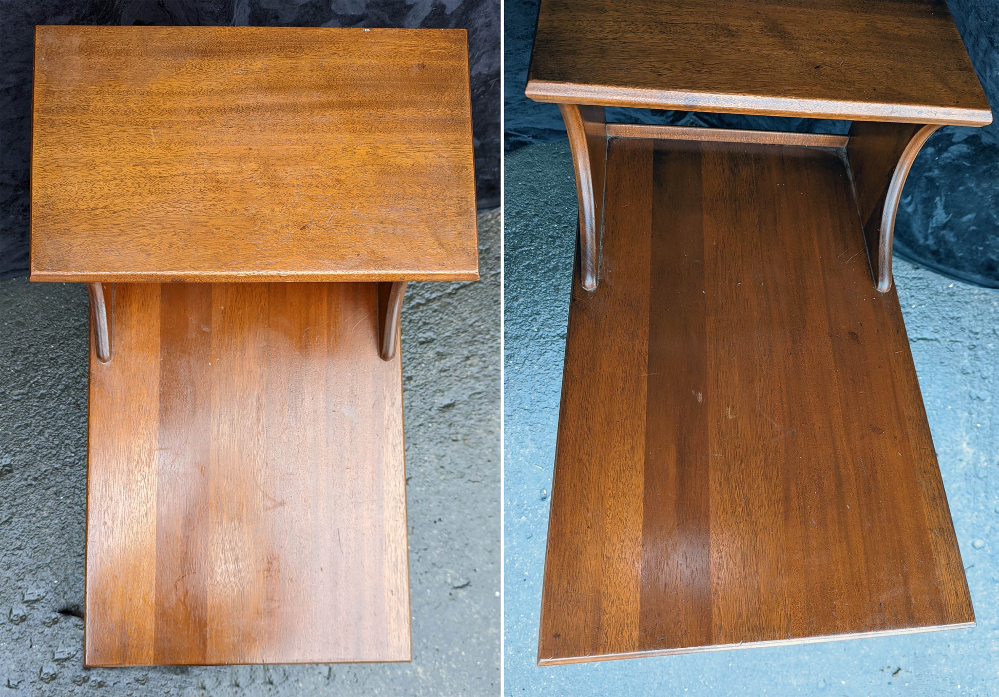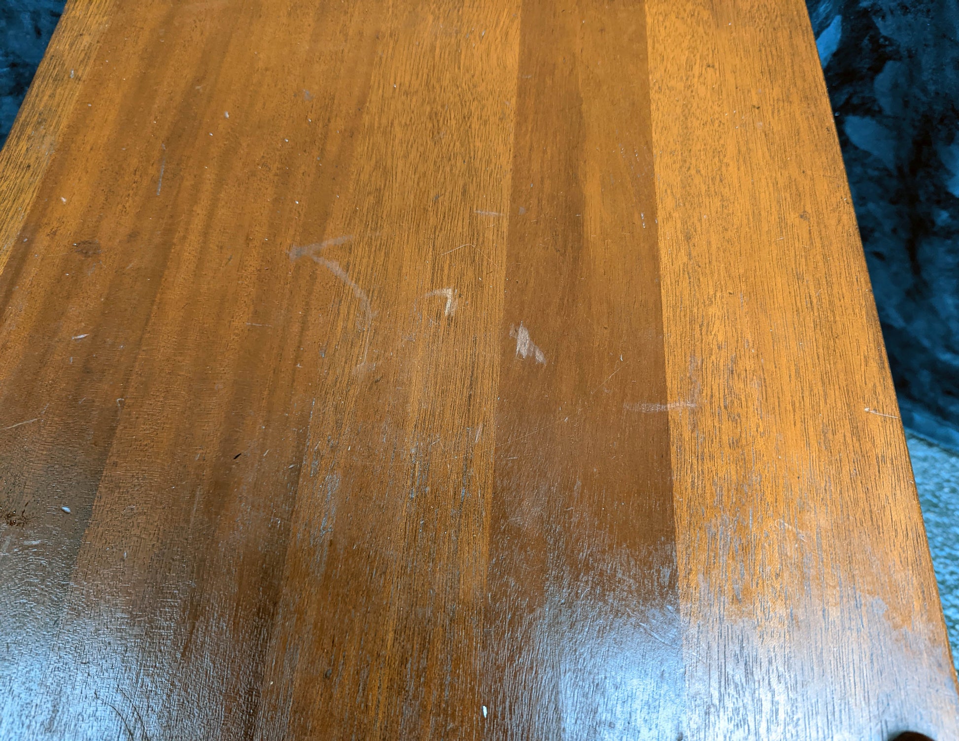 Cosmetically, the table is in good shape and just has nicks, scratches, and spots of worn finish which you would expect to find on an old, used, piece of furniture. The worst blemishes are on the bottom shelf or longer top. There are a few marks, scuffs, and spots of worn finish (see close up photos). However, there are no breaks, cracks, rot, or warp. All of the joints are tight, and overall, the table is strong, sturdy, and ready for another lifetime of service!