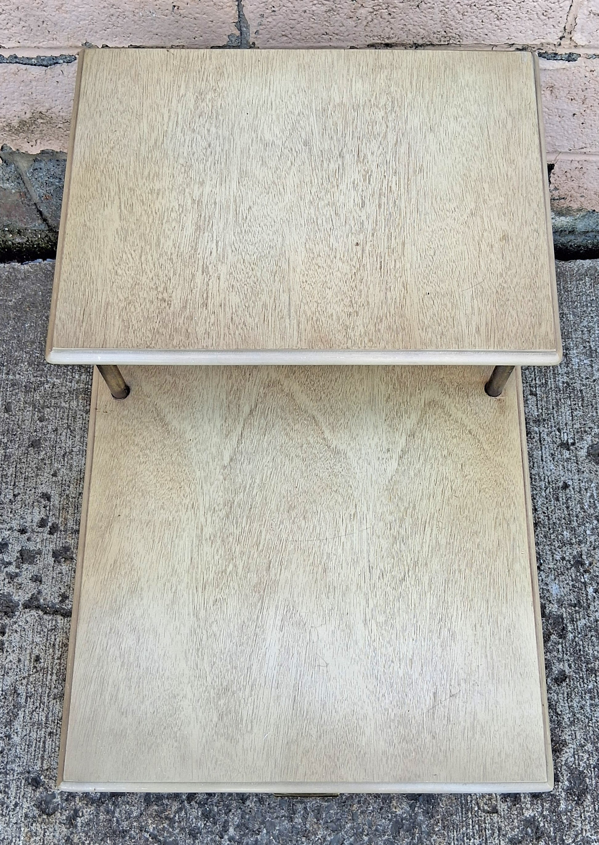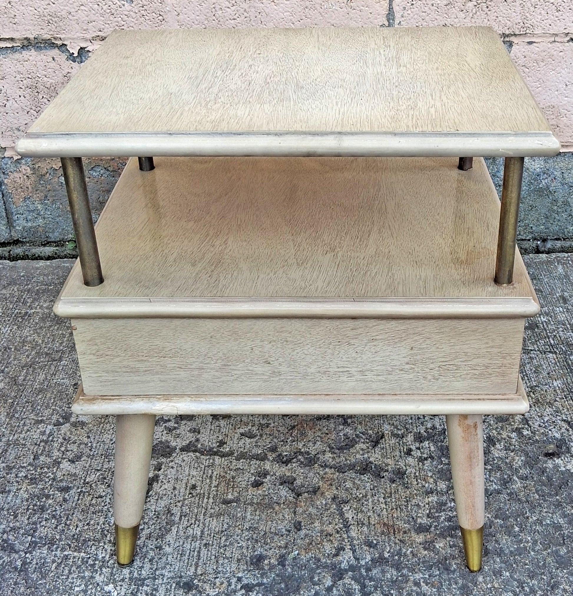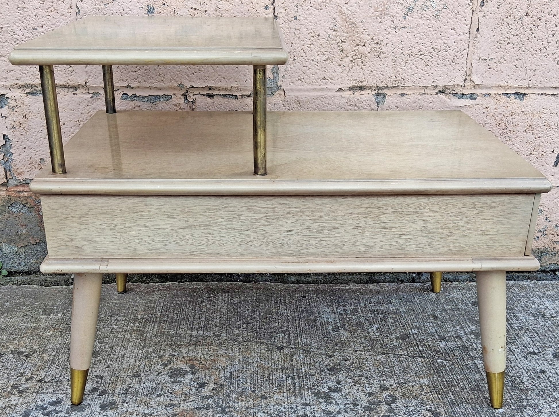 Vintage Antique Old Reclaimed Salvaged Art Deco Mid Century MCM Blonde Mahogany Wooden Brass Metal Tiered End Side Accent Table Nightstand