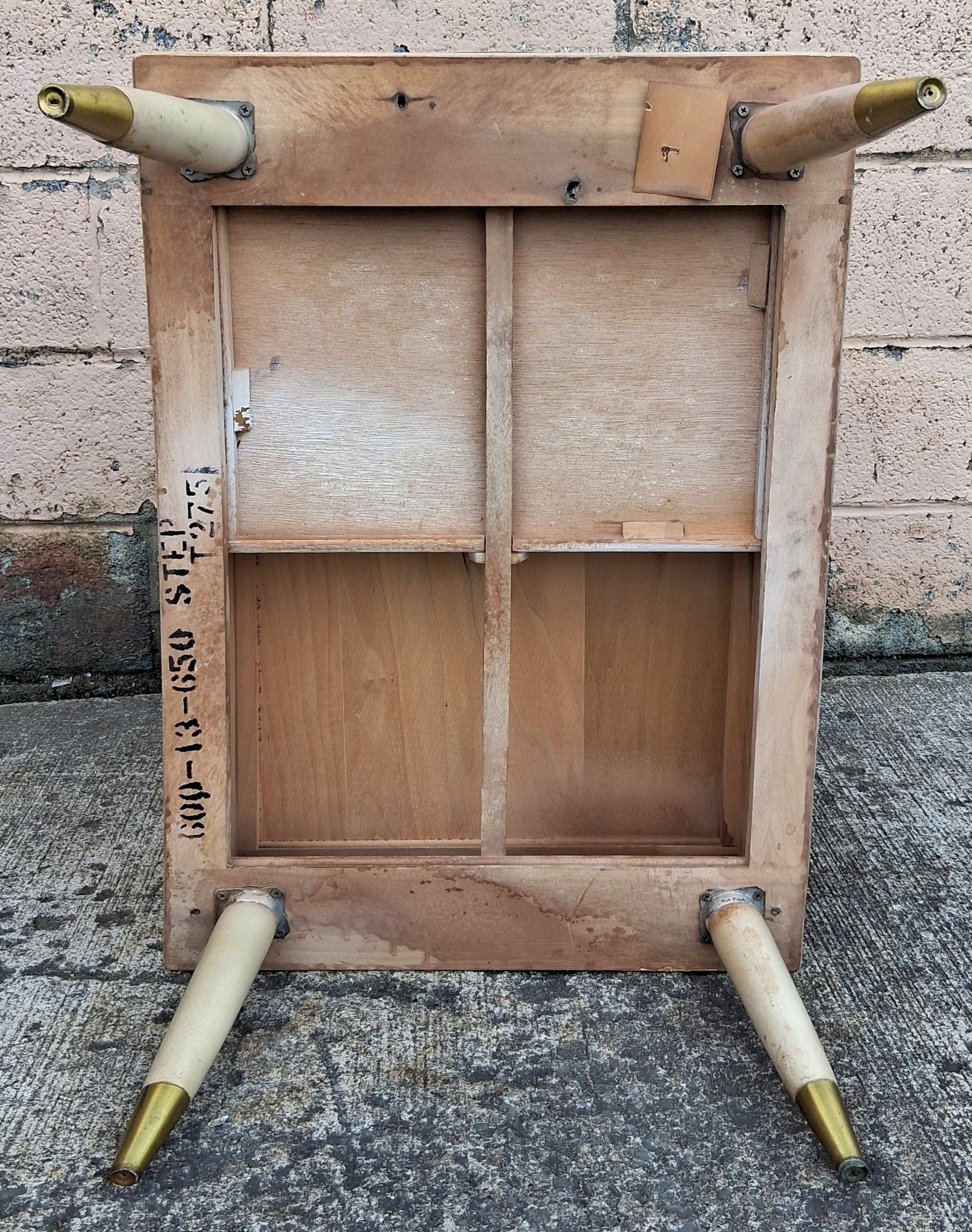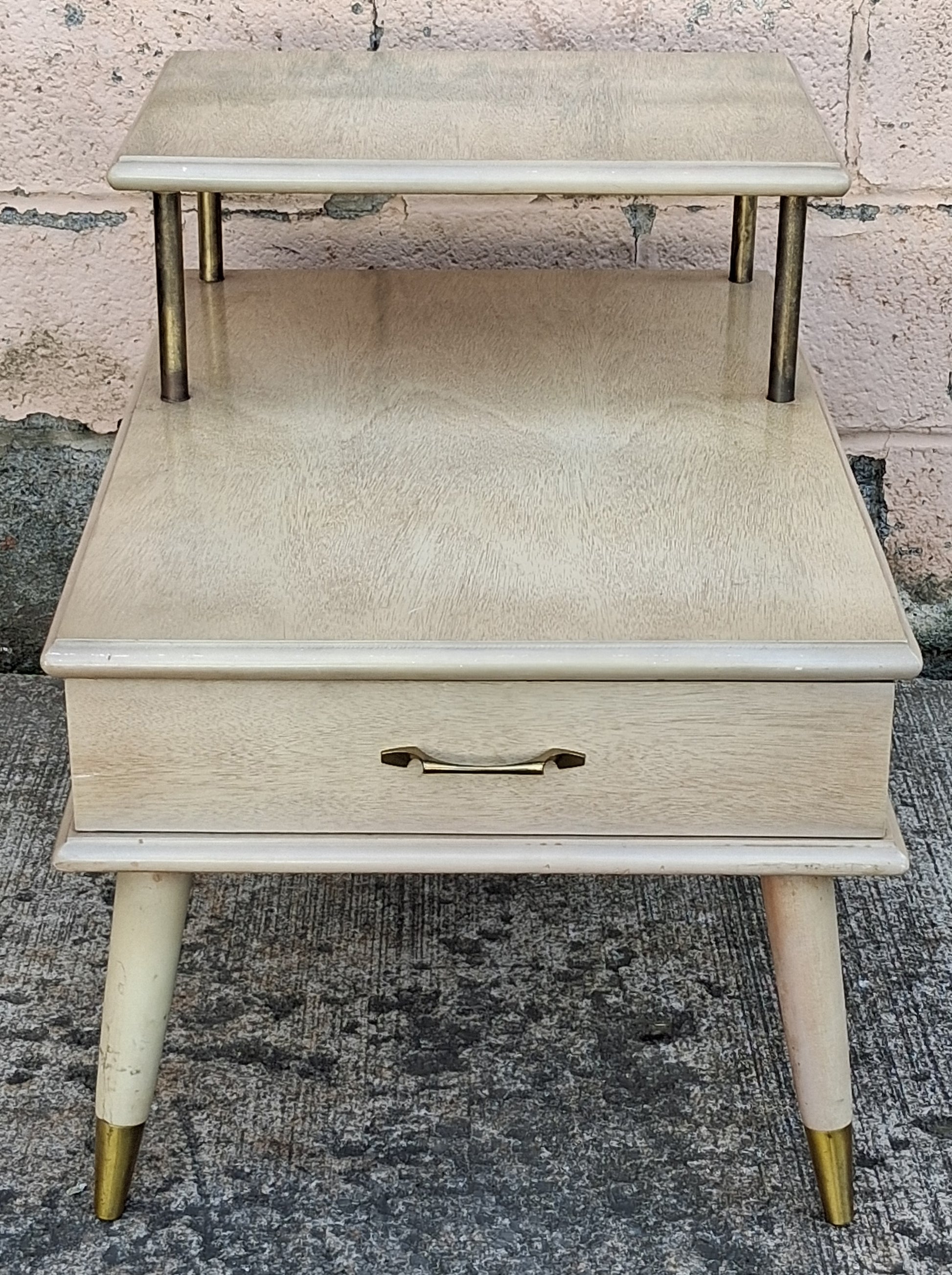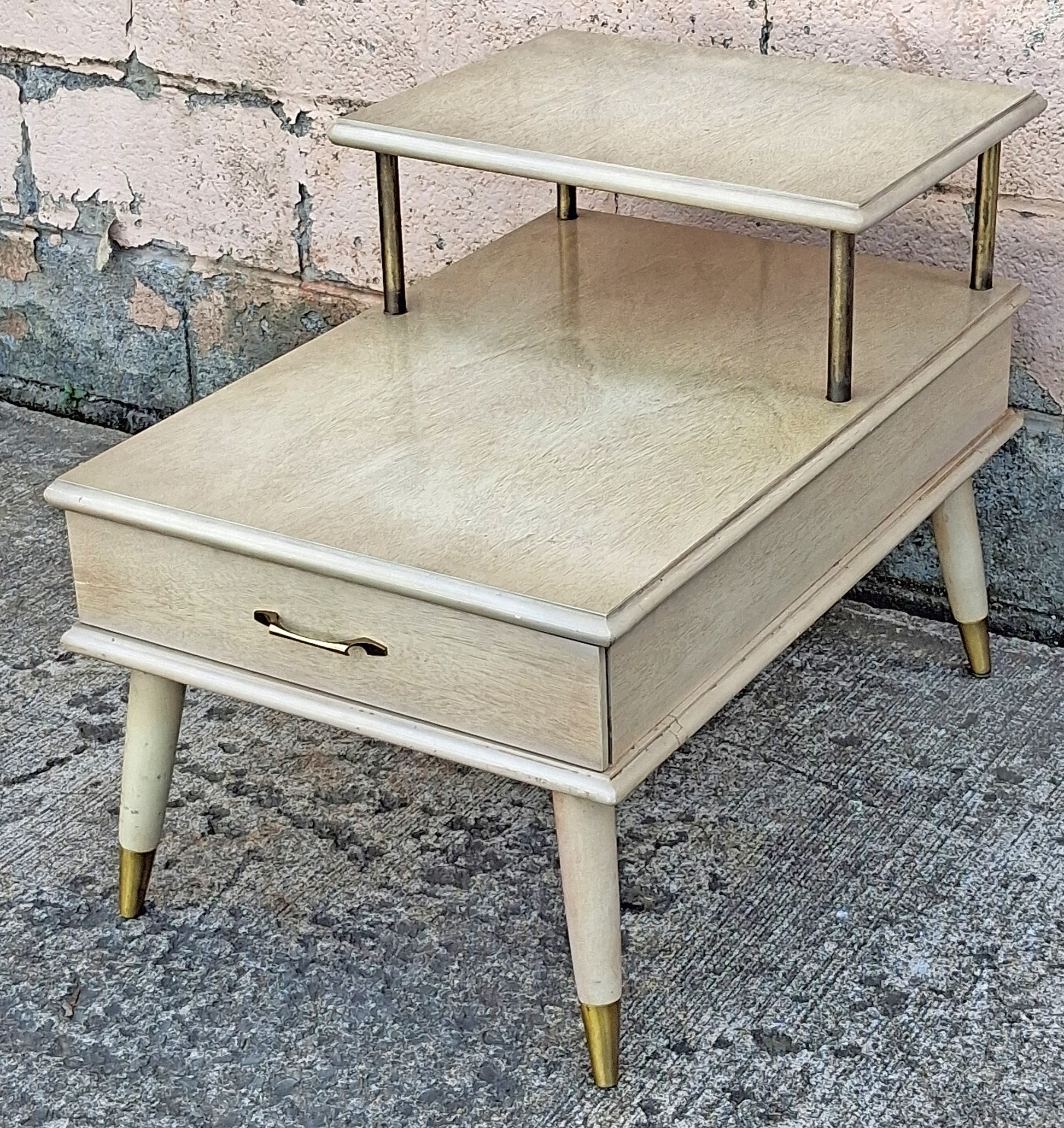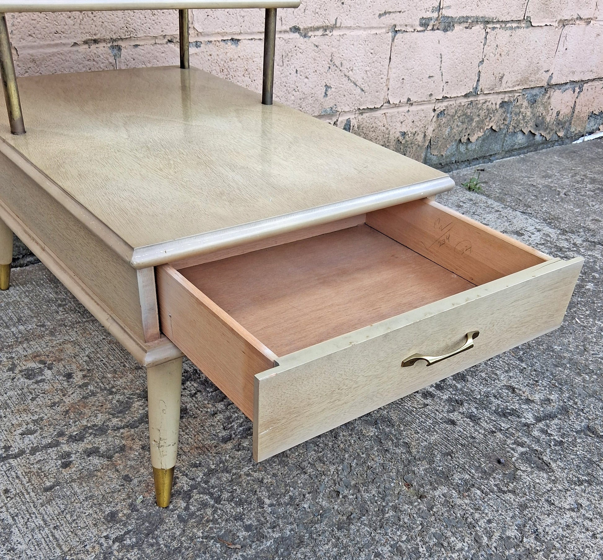Vintage Antique Old Reclaimed Salvaged Art Deco Mid Century MCM Blonde Mahogany Wooden Brass Metal Tiered End Side Accent Table Nightstand