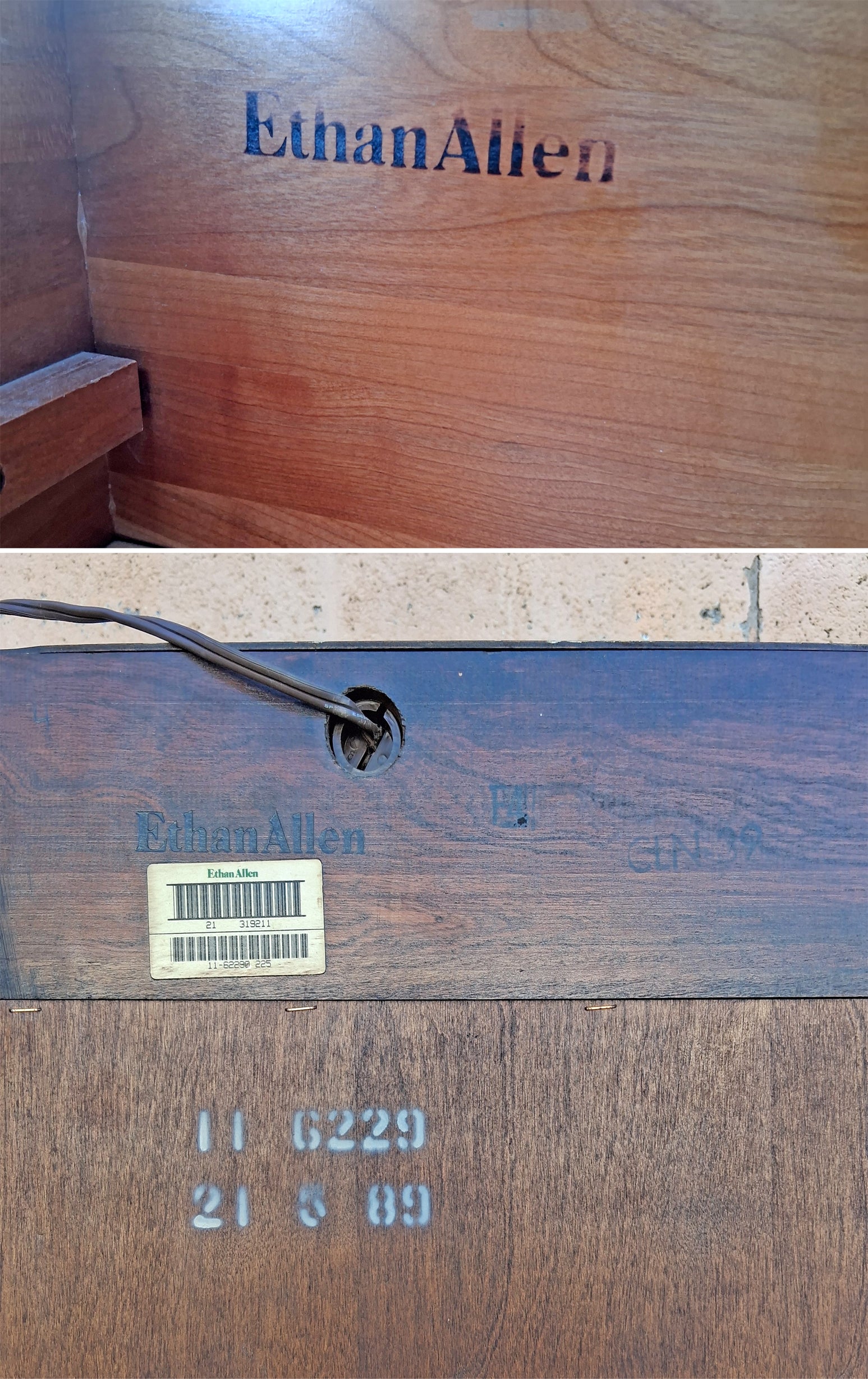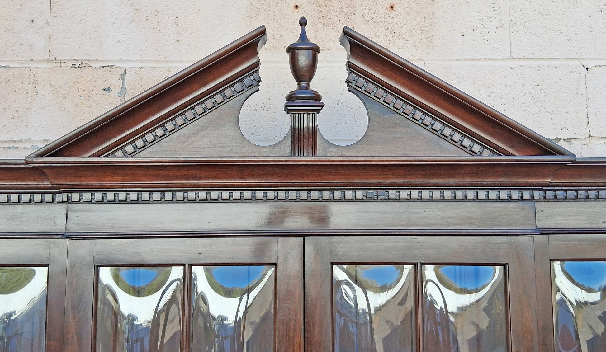 Vintage Antique Old Reclaimed Salvaged Ethan Allen Colonial Chippendale Birch Wooden Bubble Glass Breakfront Display Curio China Cabinet