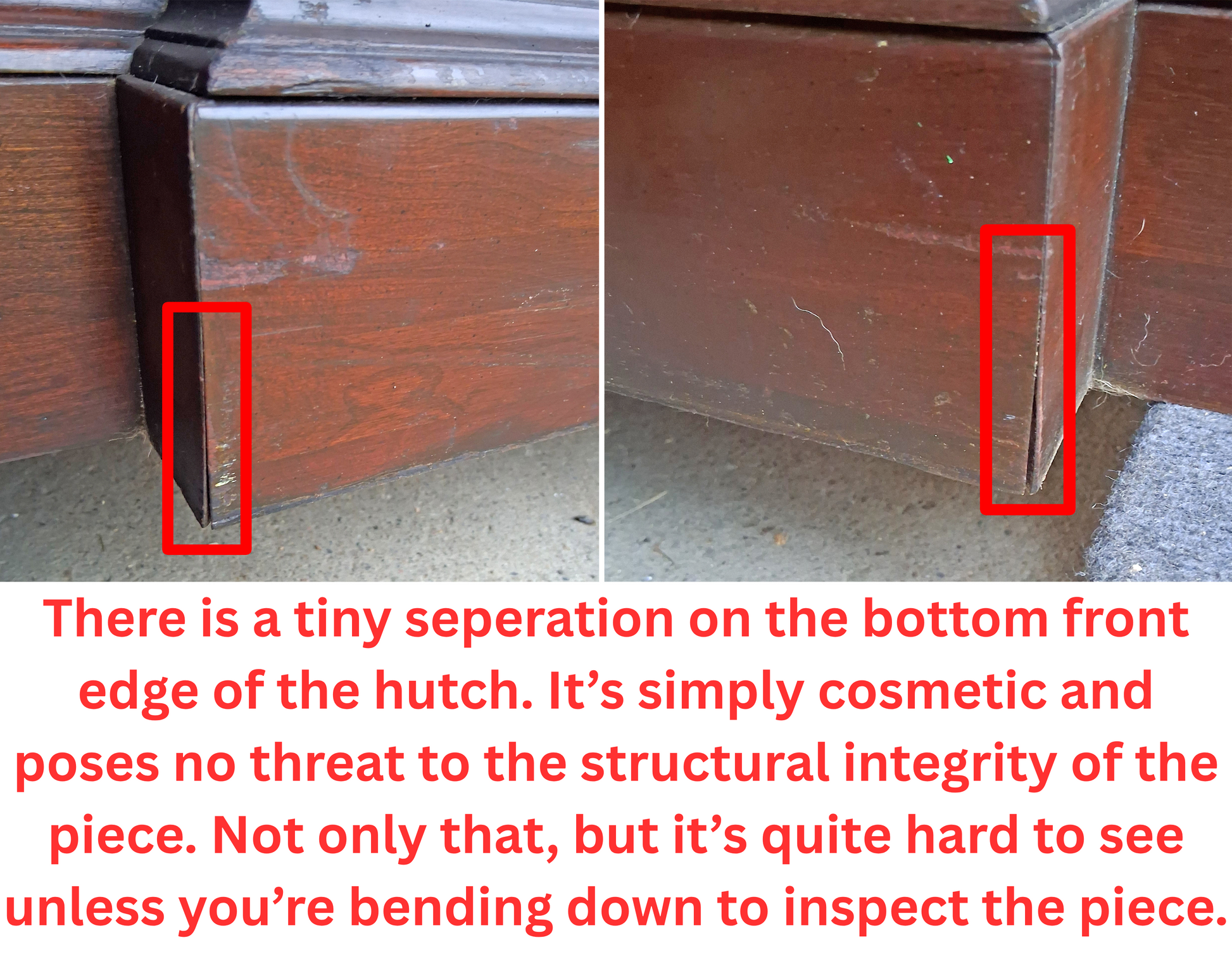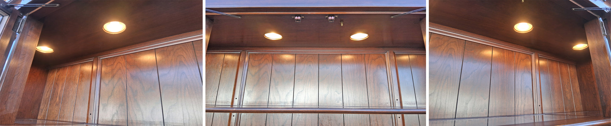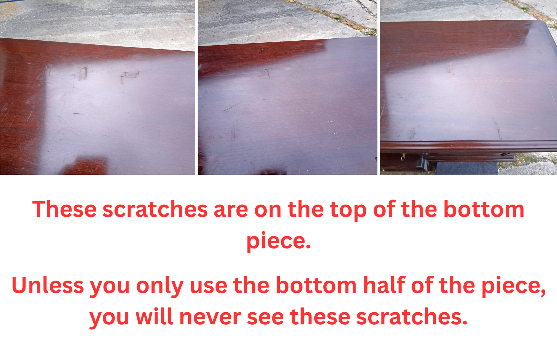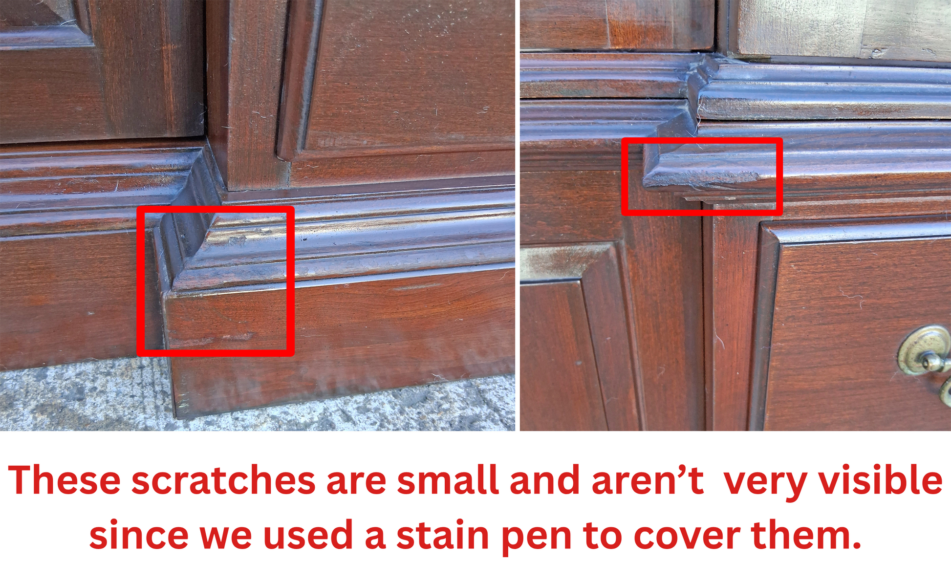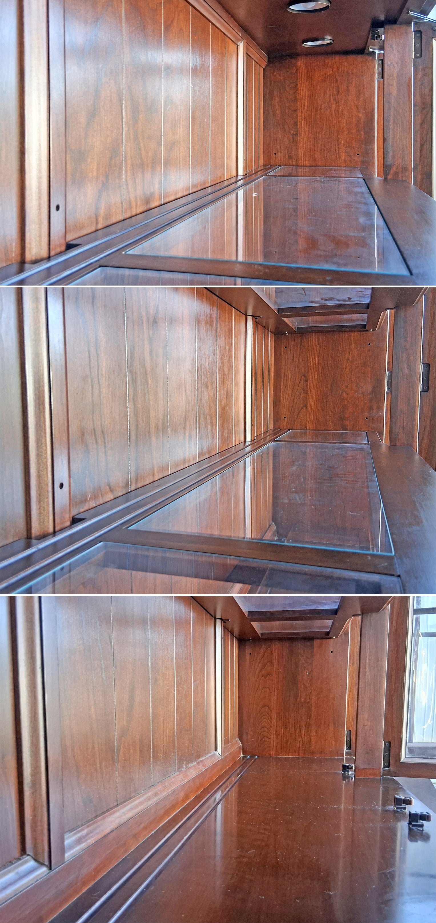 * Shipping prices to the Northeastern states may be significantly lower than the flat rate price we have to ship to all parts of the country. Read the "Shipping" section below for more information. Our carpenter inspected the piece from top to bottom, inside and outside. There wasn't anything for him to repair or reinforce. The piece has the usual small nicks, scratches and small areas of worn finish, but no breaks, cracks, gouges, rot, warp or large scratches. The worst damage is shown in the last 3 photos. The drawers open and close smoothly, The lights in the cabinet work perfectly, the glass is in excellent condition, with no chips or cracks or any large scratches The cabinet is strong, sturdy, and ready for another lifetime of service! Dimensions Overall Cabinet Dimensions: |