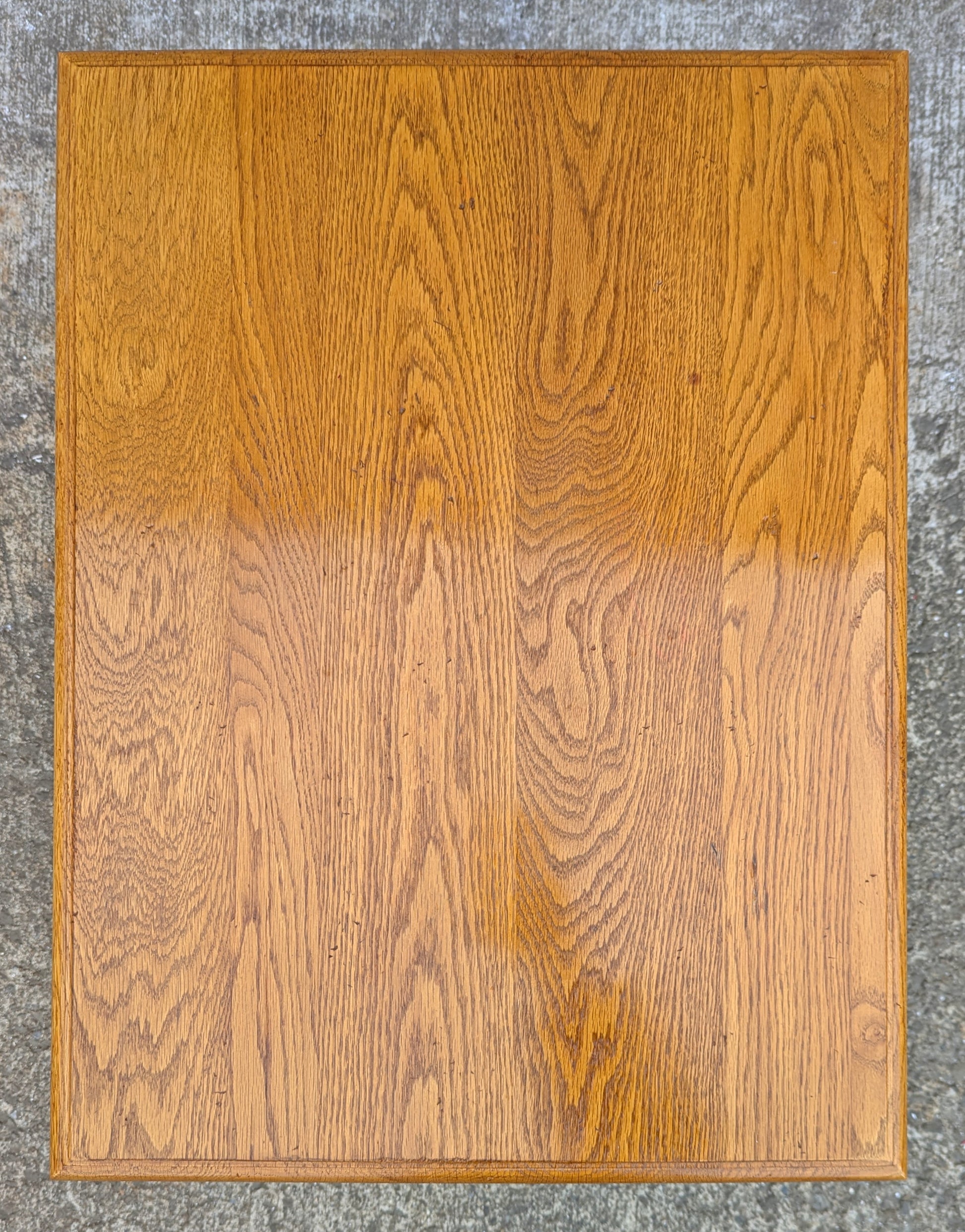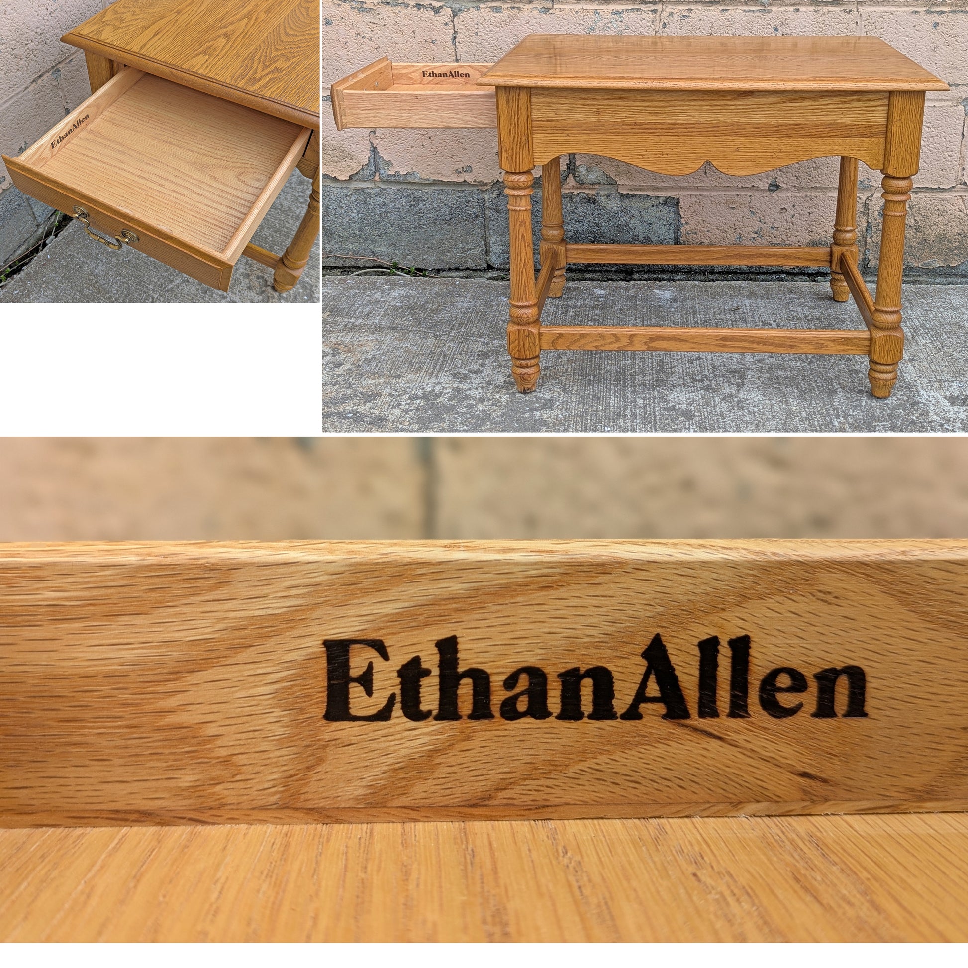 | Handsome nightstand salvaged from Northeastern PA. The piece was made by Ethan Allen, if you aren't familiar with this brand, its one of the most popular furniture brands in the U.S. The entire piece is made of solid Oak. The nightstand sits on 4, turned (carved) legs each of which is connected by a stretcher. Under the tabletop is a lovely drawer with a brass drop-pull. The table is strong, solid, and sturdy, and in excellent condition. There are small nicks & scratches. However, there are no breaks, cracks, gouges, rot, or warp. Our carpenter thoroughly inspected the table and found no repairs to make nor anything to reinforce. The legs and top are tight and sturdy, and the drawer slides in and out with ease. It's ready for another lifetime of service! Dimensions Overall: