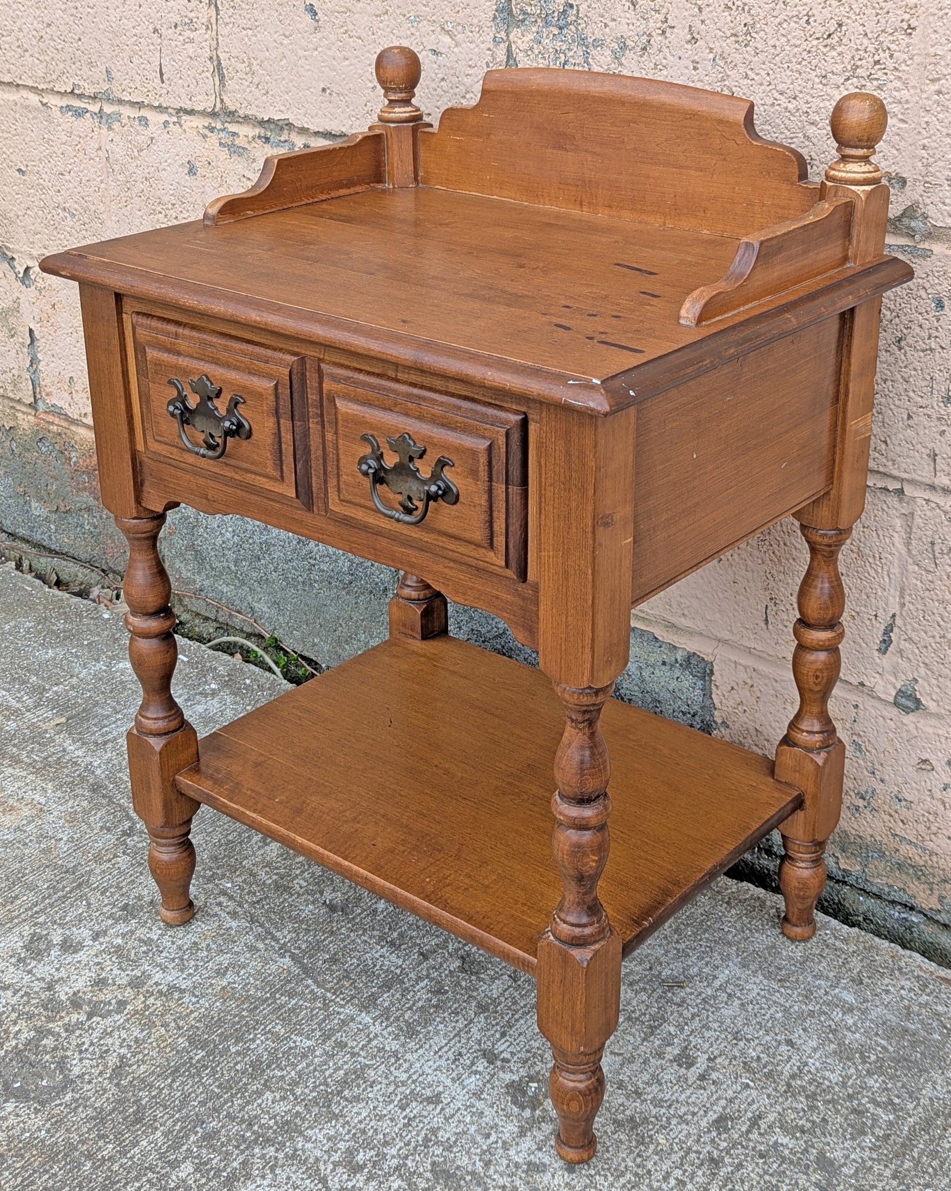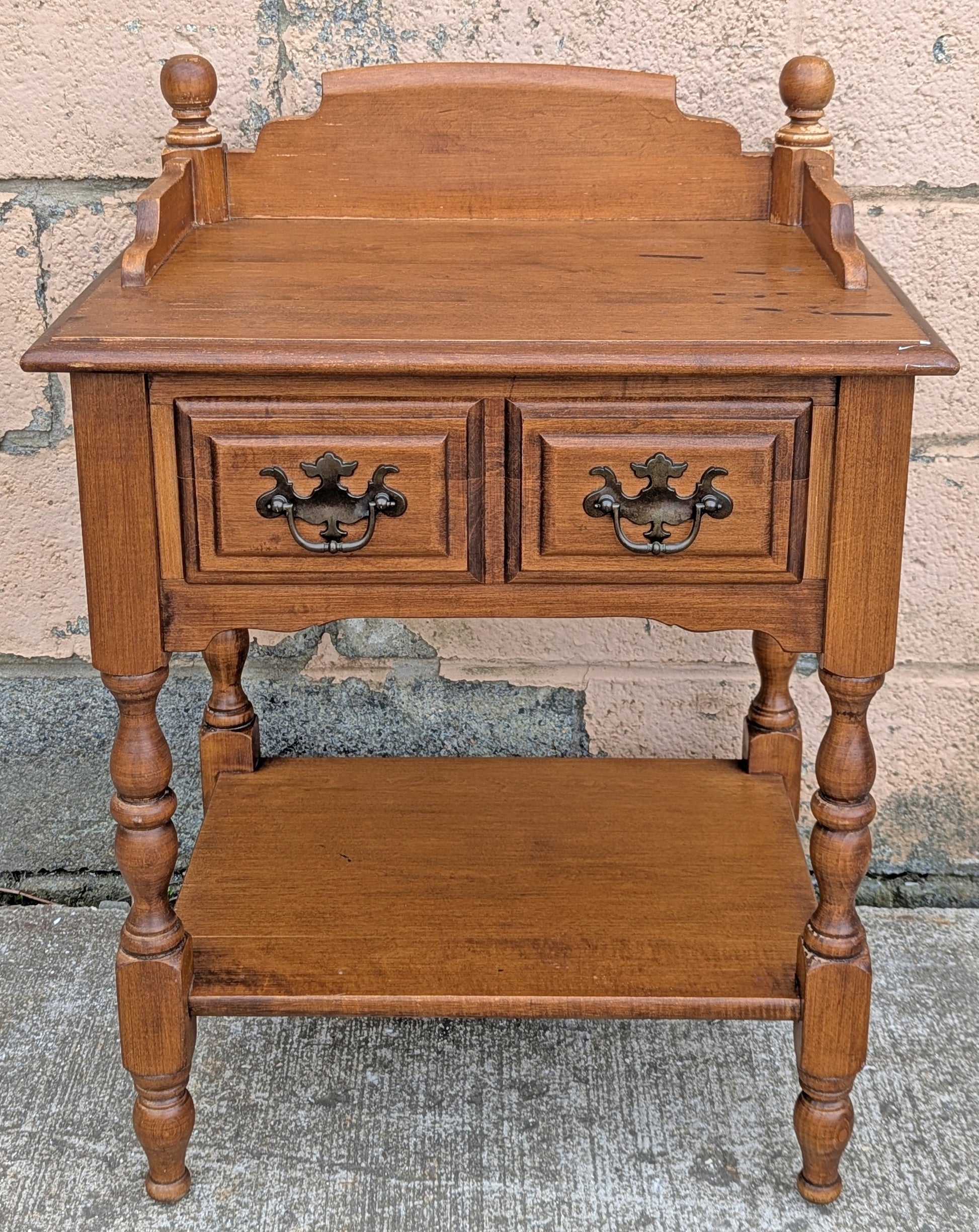 Lovely, vintage end table or nightstand salvaged from Northeastern PA. This piece is made of solid Maple wood (no MDF or particle board) and is has a medium-brown stain.