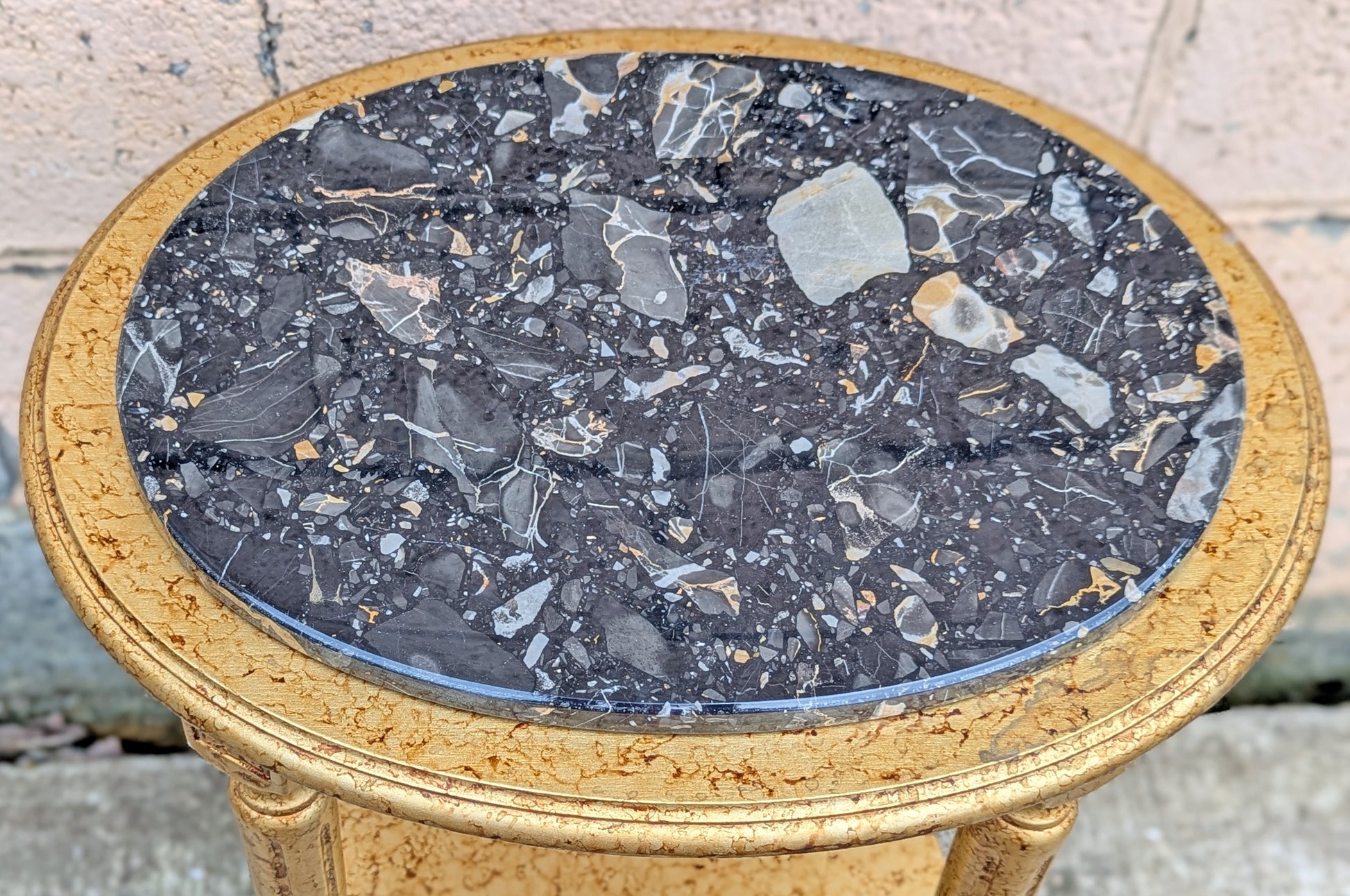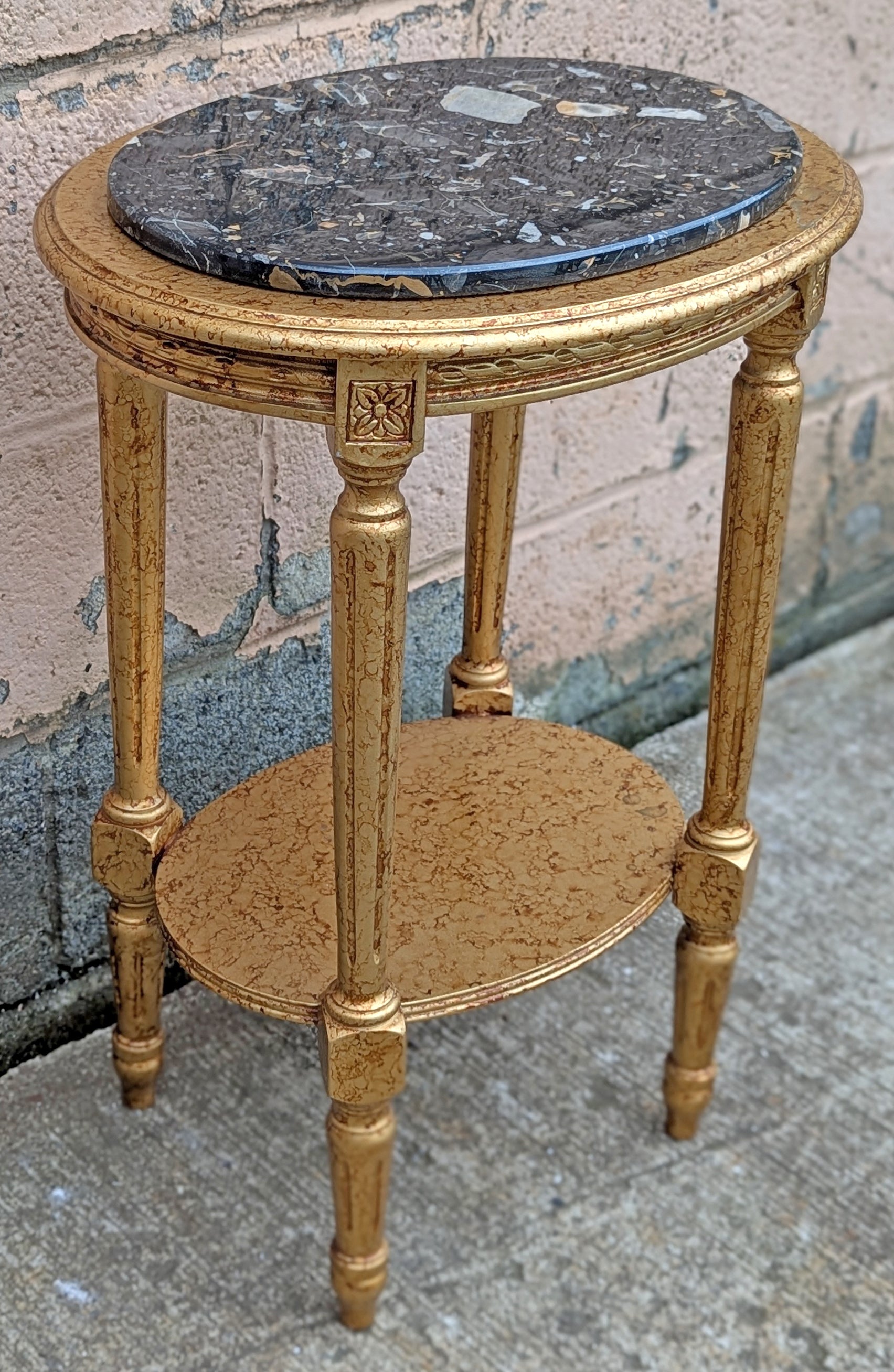 Gorgeous, marble-top table salvaged from Northeastern PA. The table is made of a solid wood covered in a gold paint.