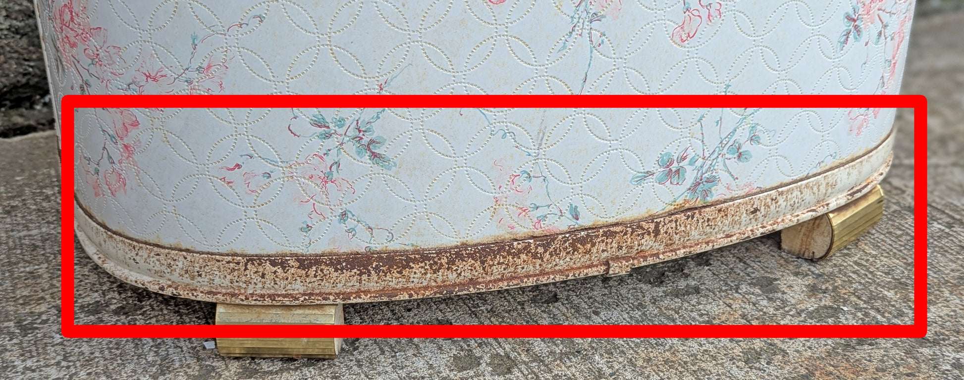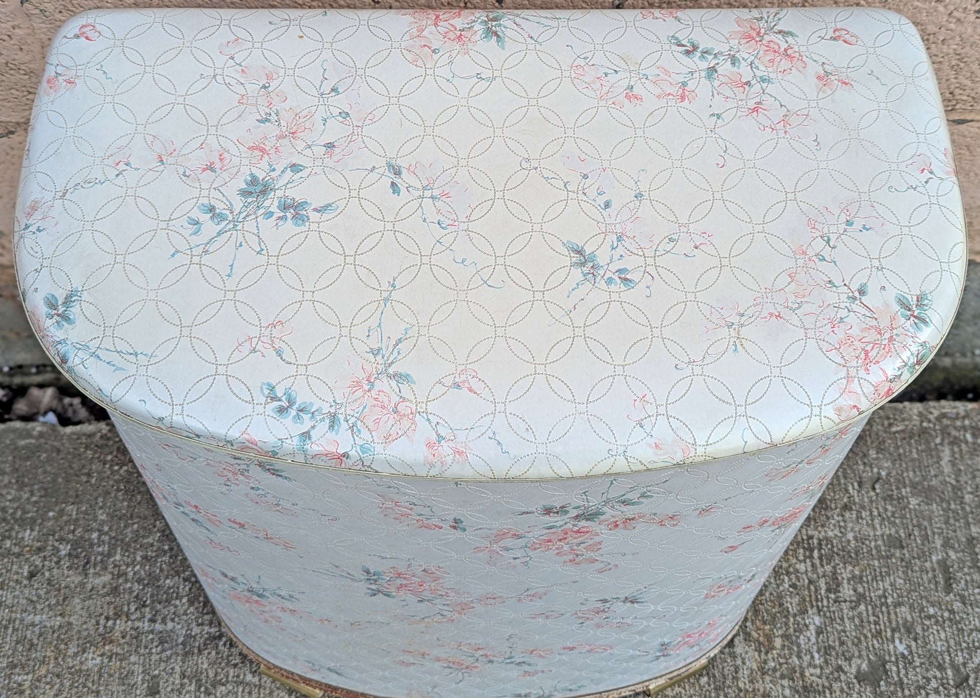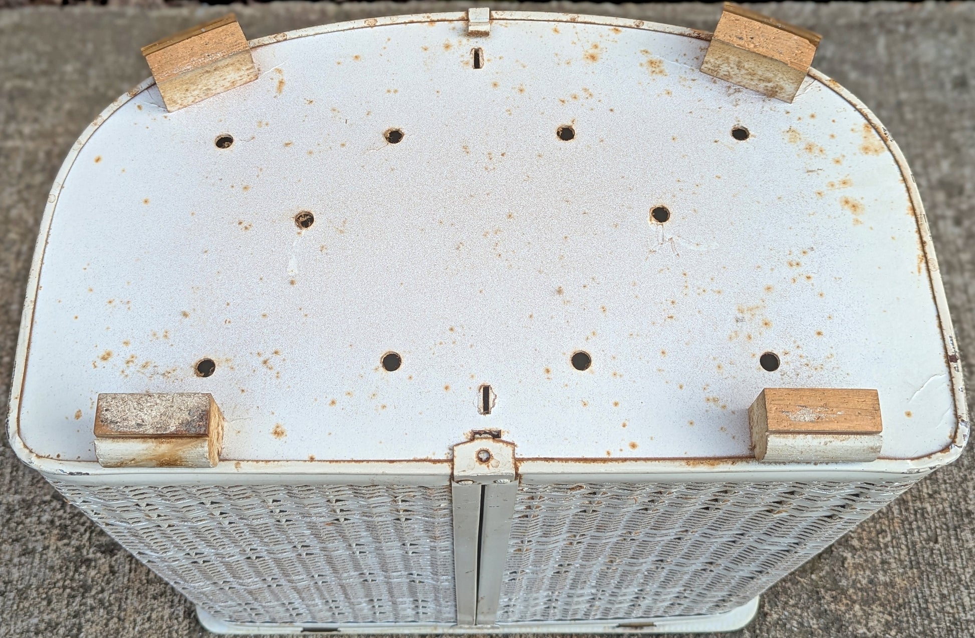 For it's age, it's in amazing condition! Even the vinyl is in good shape. There are a few small scratches on the metal and vinyl, which is to be expected for a piece this old. However, there are no rips, deep scratches or chips. The worst and only significant damage is rust on the bottom edge of the hamper (see last photo). However, simply scrubbing it with steel wool, and applying some Brasso will do the trick. The piece is ready for another lifetime of service!