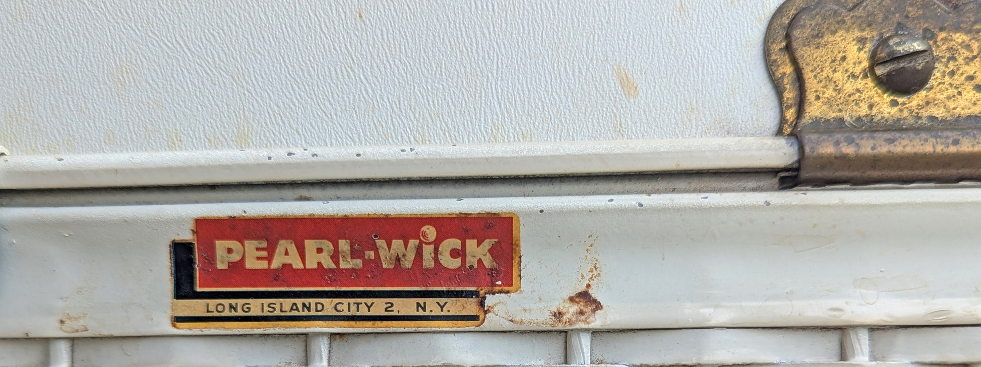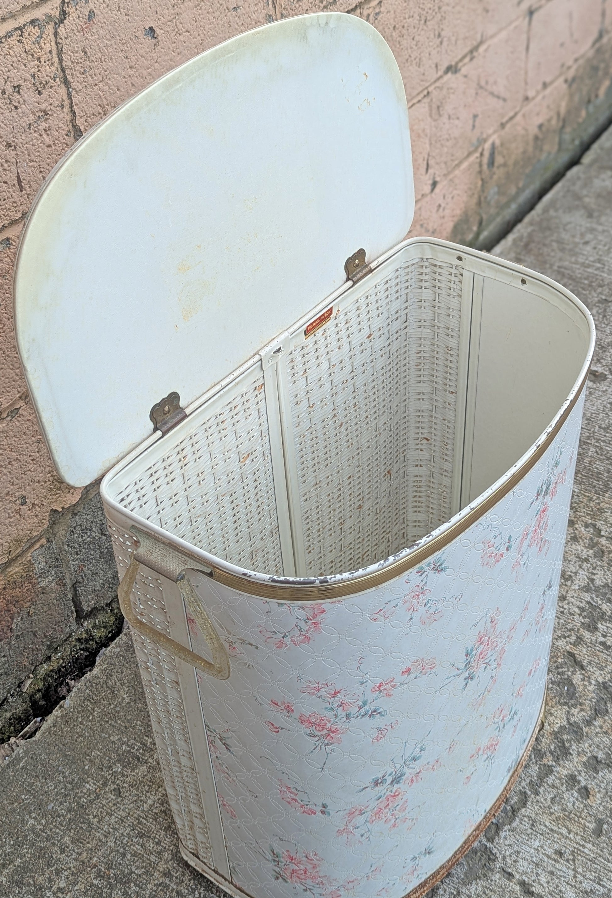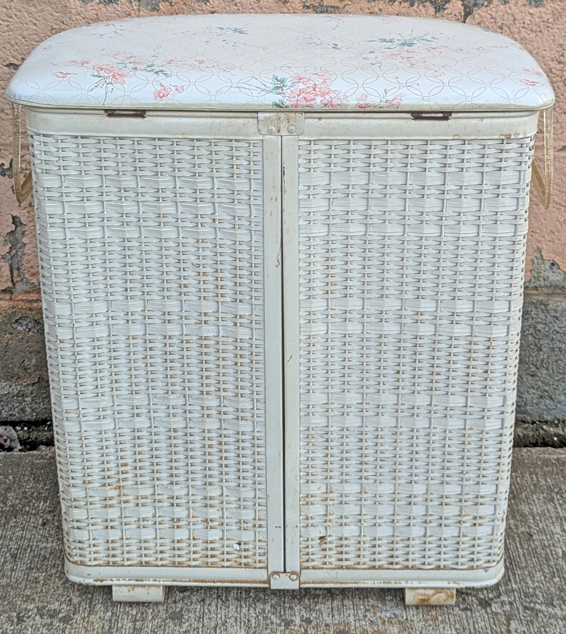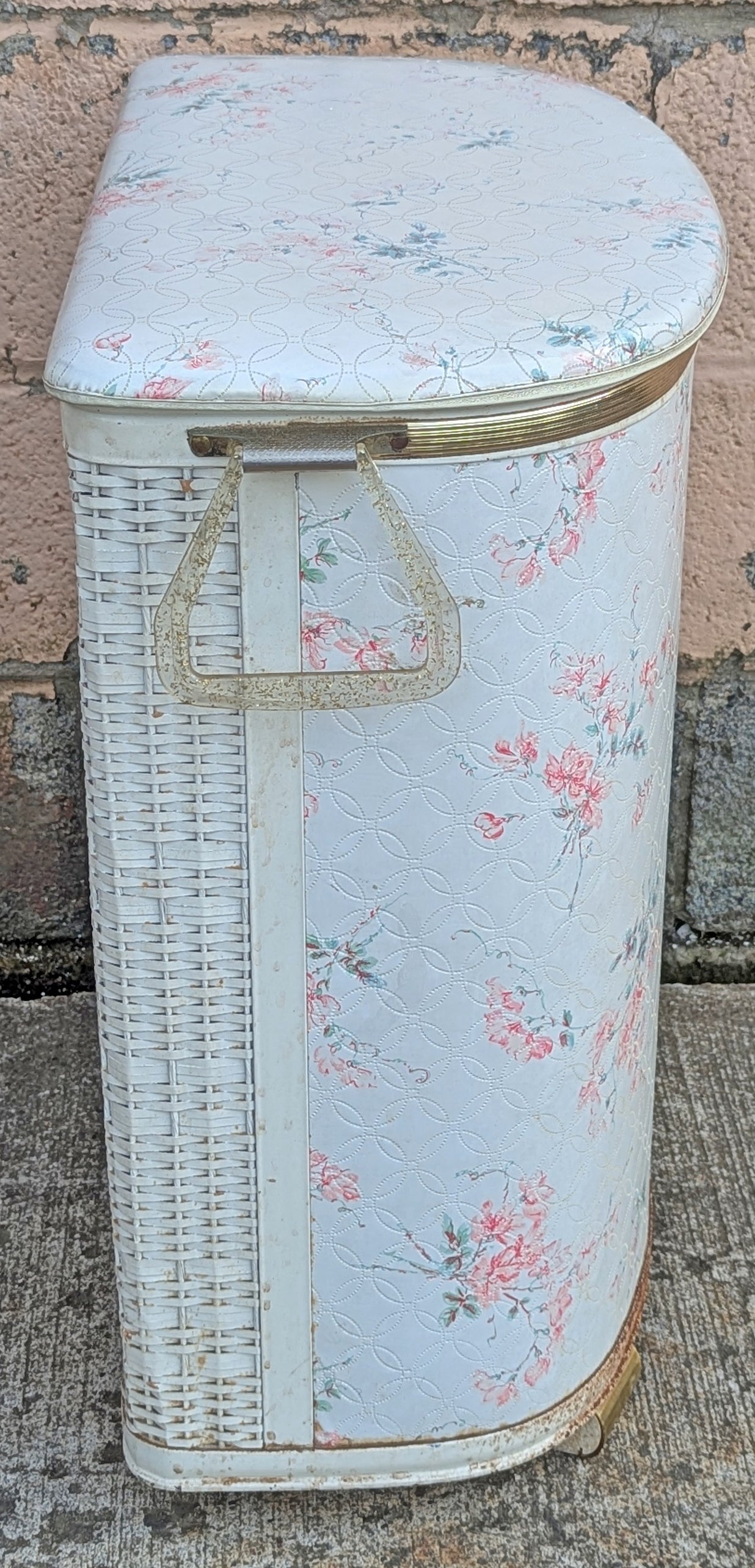 Cute, vintage hamper salvaged from an old home in Northeastern Pennsylvania. It was made about 70 - 80 years ago by the "Pearl Wick" brand out of New York. It has a solid metal frame. and is covered in vinyl on all sides except the back and bottom. It has hinged lid  which lifts up and down, and sits on 4, wooden, cylindrical legs.