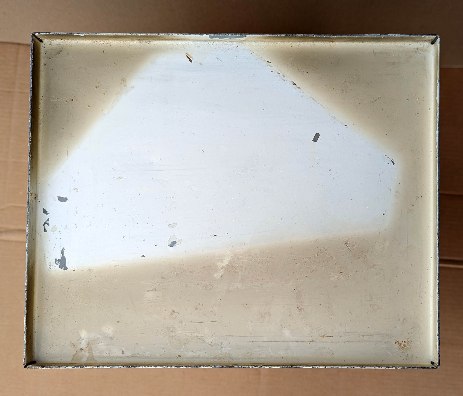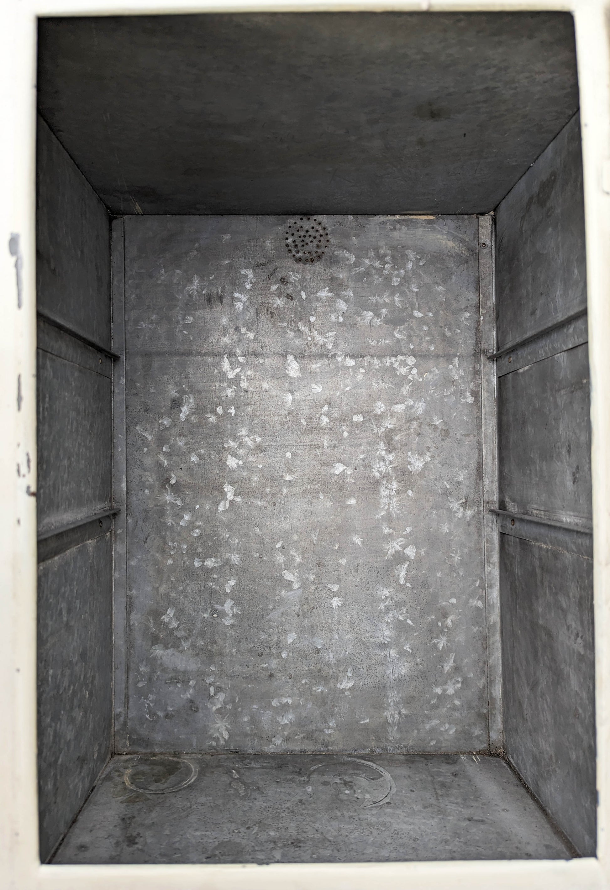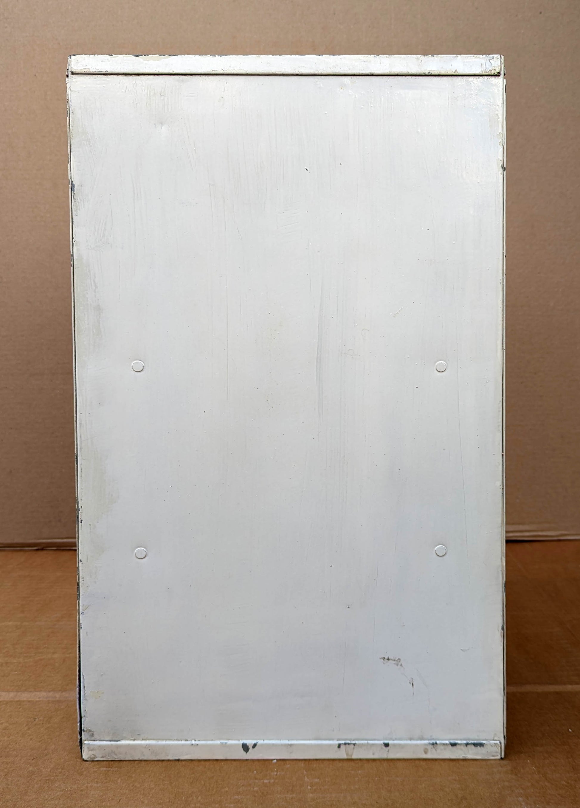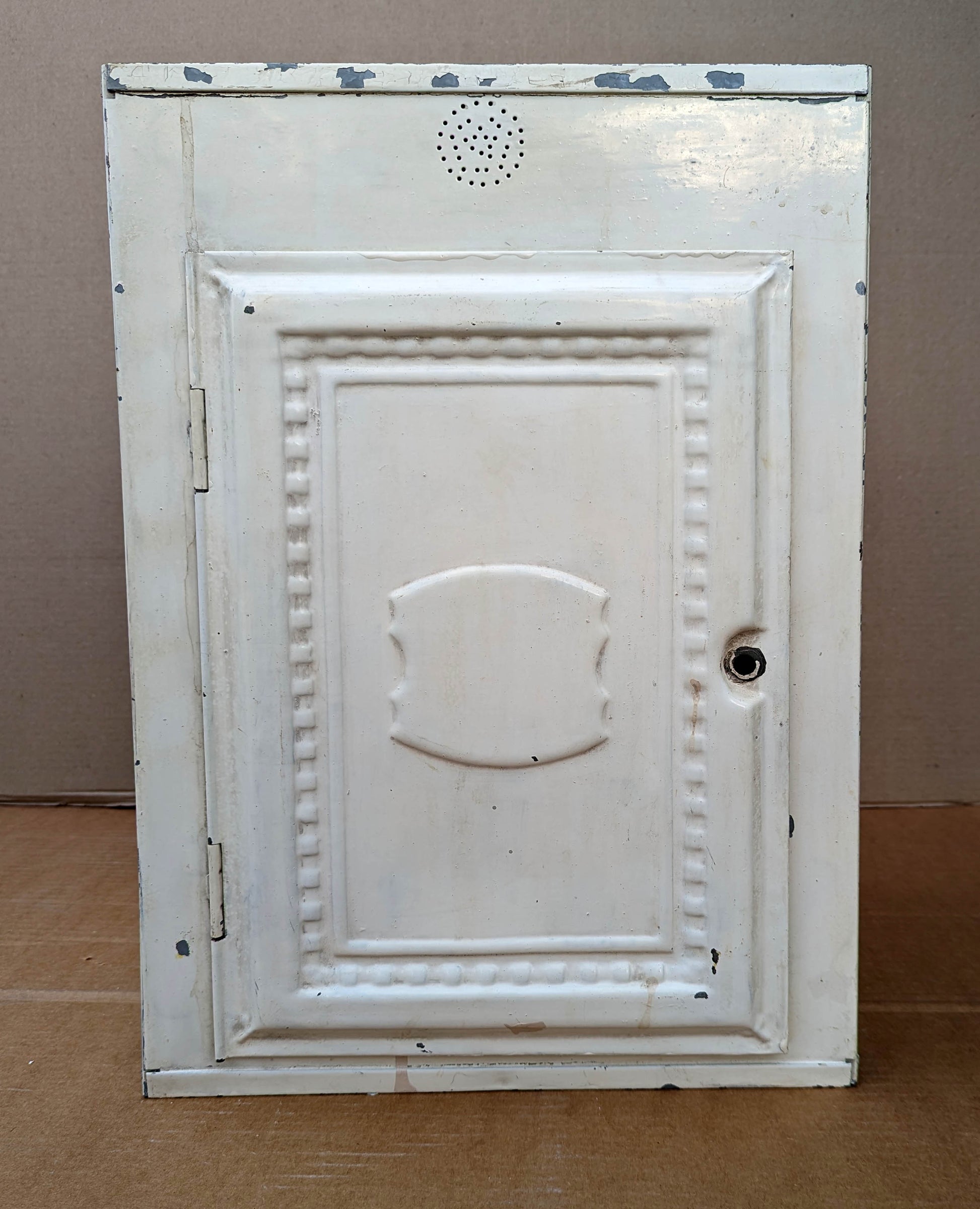 Wonderful, vintage pie safe salvaged from Northeastern PA. It is made of solid galvanized steel and is completely painted white on the outside. Inside, it's unpainted and has 2 removable shelves. I'm estimating that it was made in the 1960's or 70's.