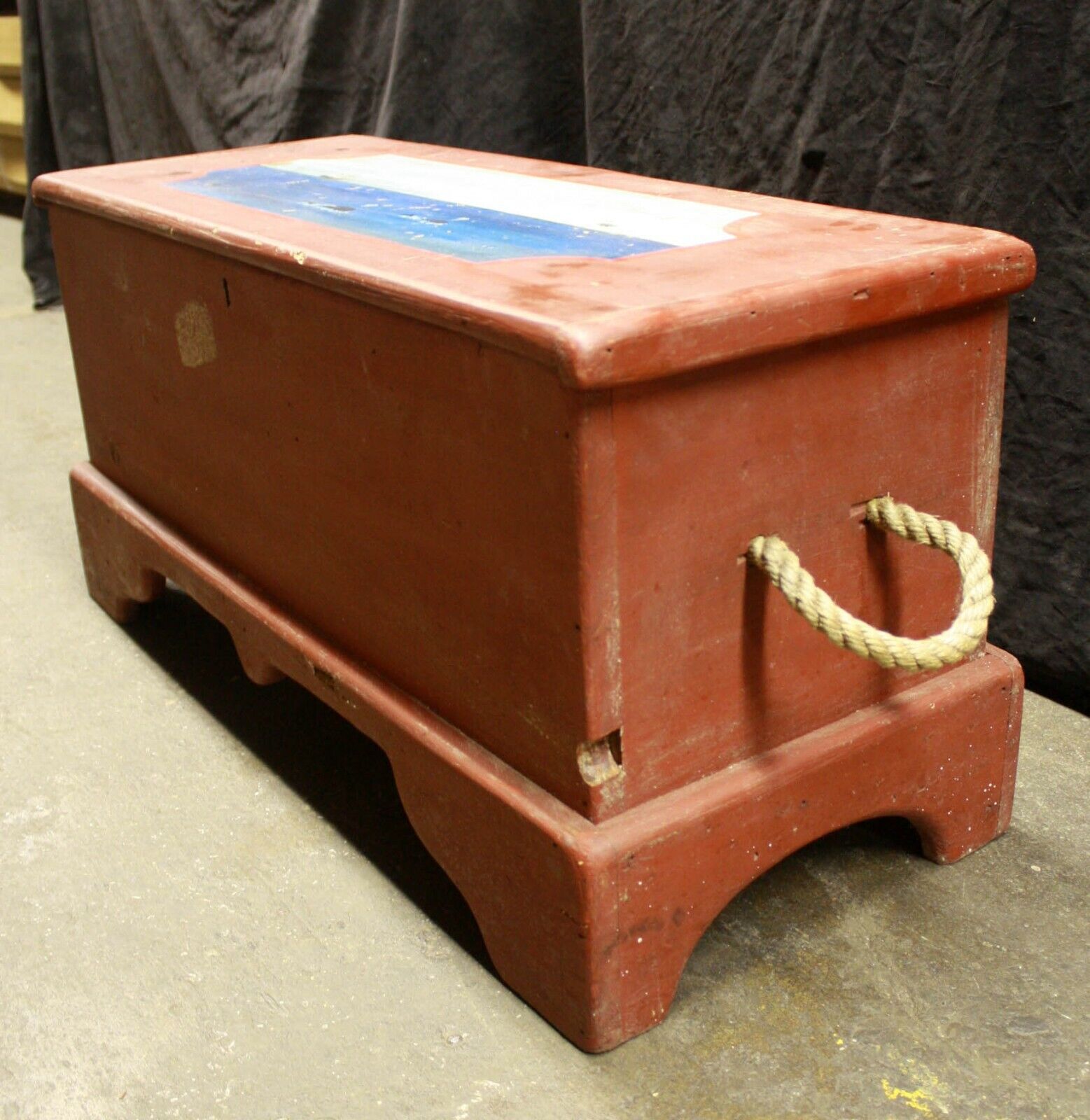 Charming, vintage, homemade storage chest salvaged from Central Connecticut. It is made of solid, old pine and is painted red. The top/lid has a hand-painted nautical scene with an old ship and 2 whales spraying water from their blow holes. It has 2, thick, rope handles on both left and right sides. This piece was most likely made during the 1960's.