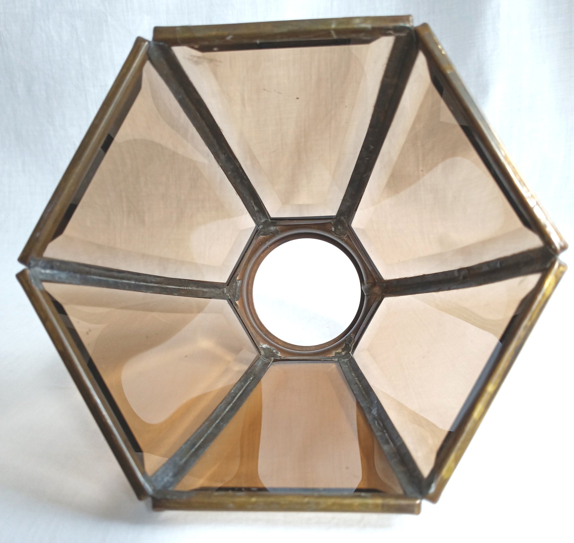 This sale is for a vintage Mid Century lamp shade/light cover featuring a unique design, prism shape, with beveled tinted smoky glass panels held within a leaded brass frame. It is heavy and sturdy build.
