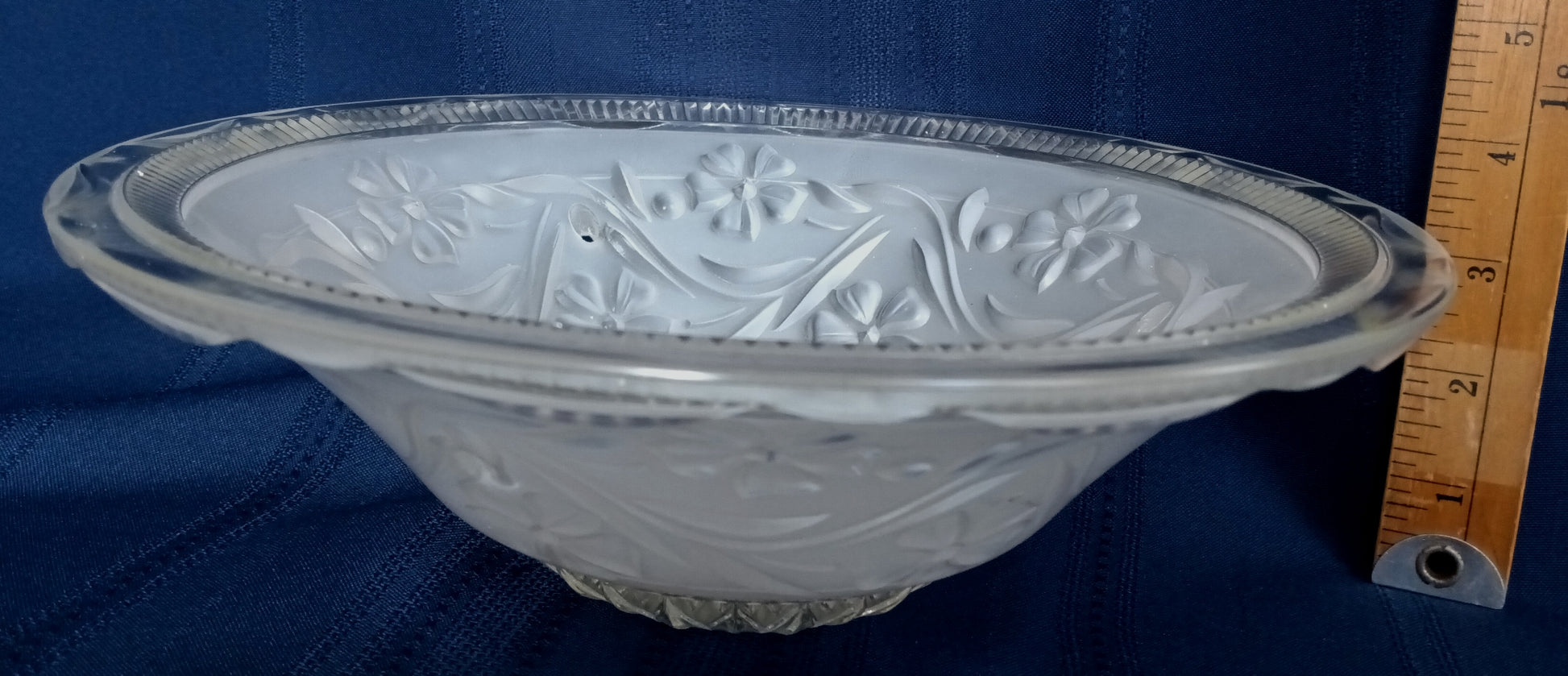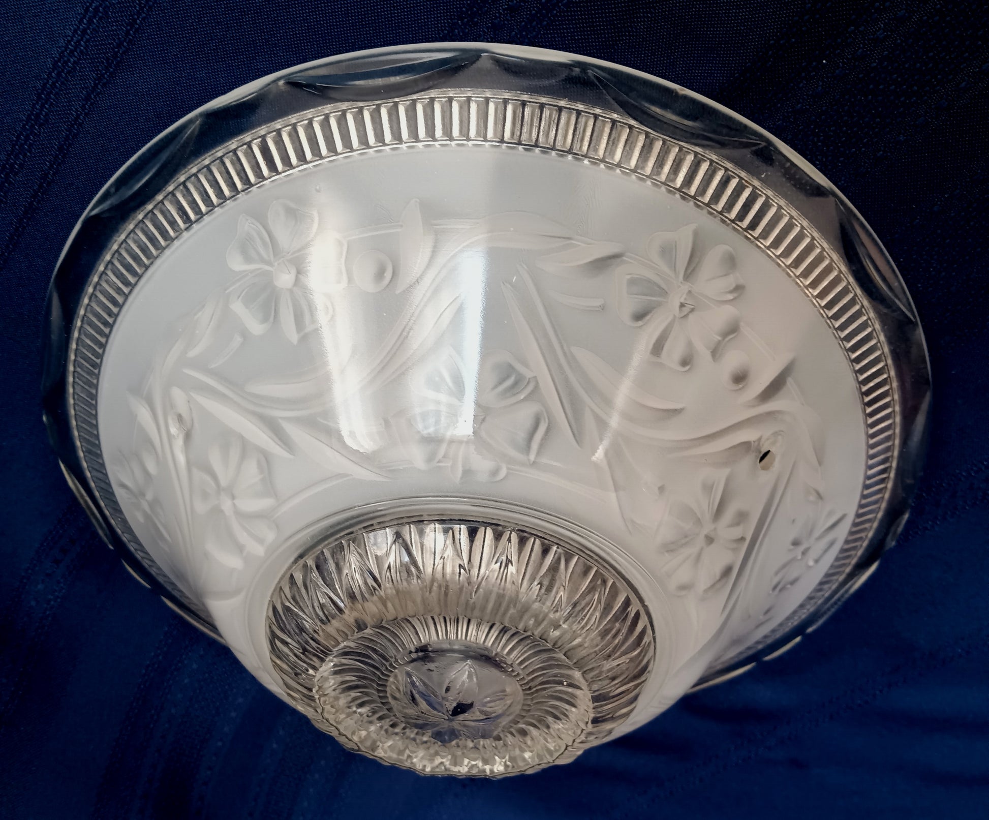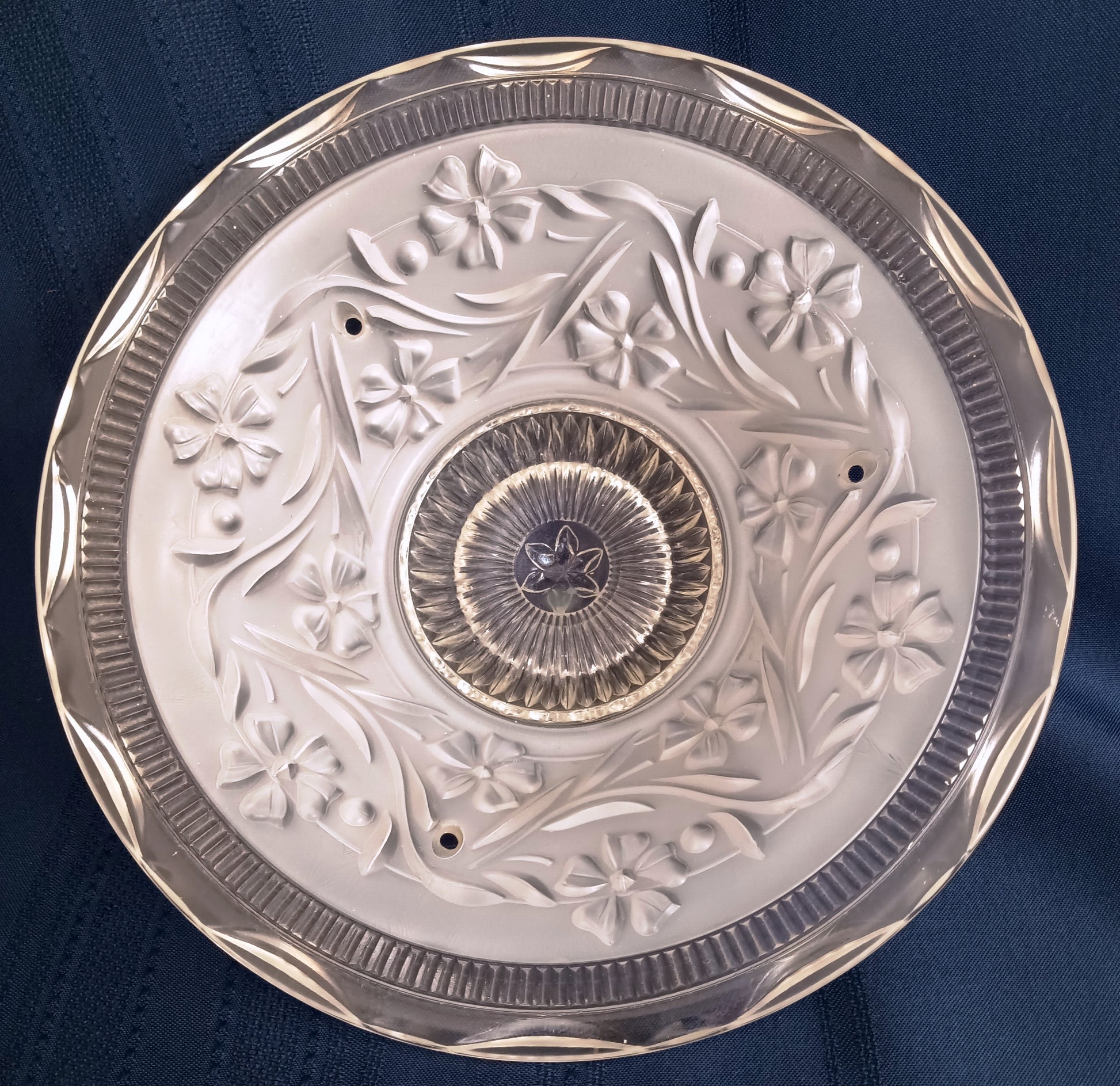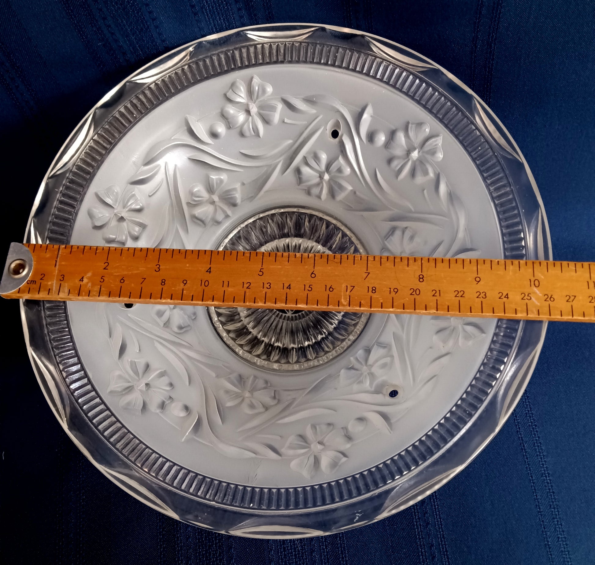 Vintage Art Deco Lampshade White Raised Floral Design and Clear Glass Round Shade Ceiling Pendant Light 3 Holes Scalloped Rim 10 1/2” D