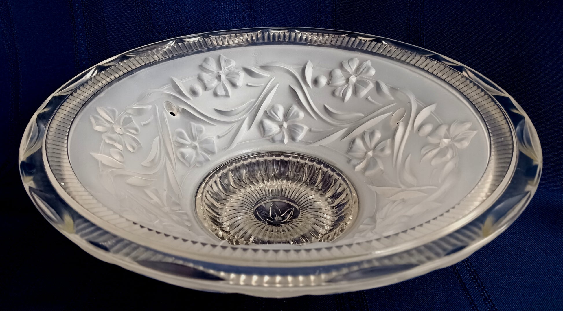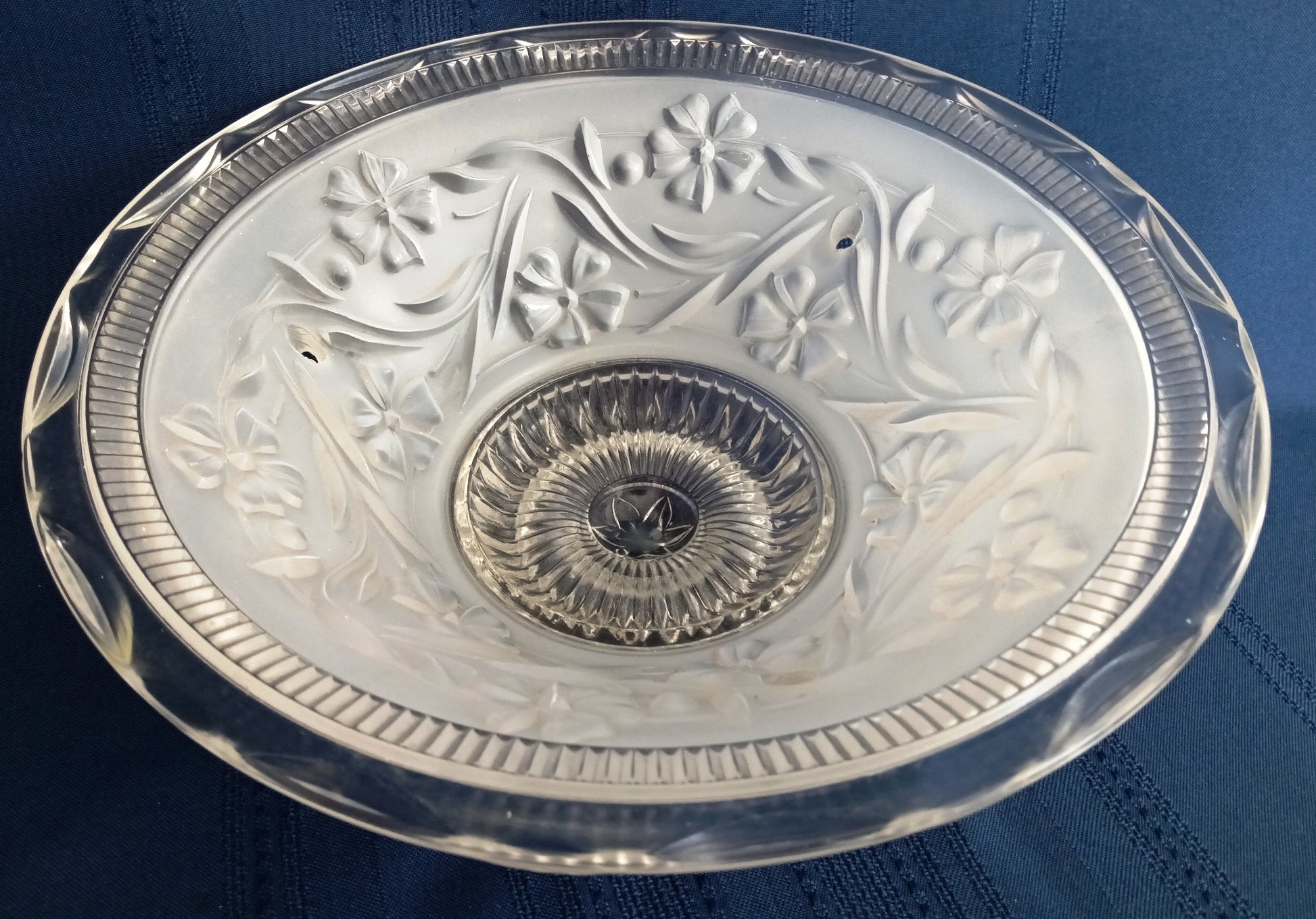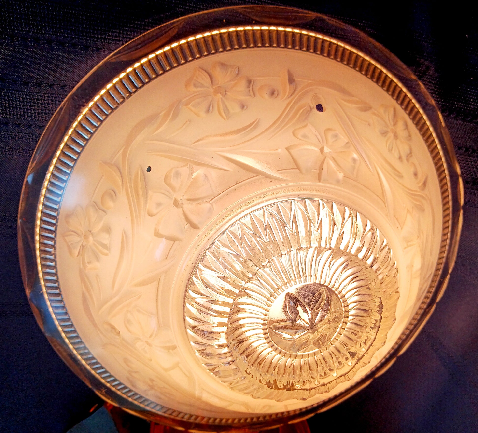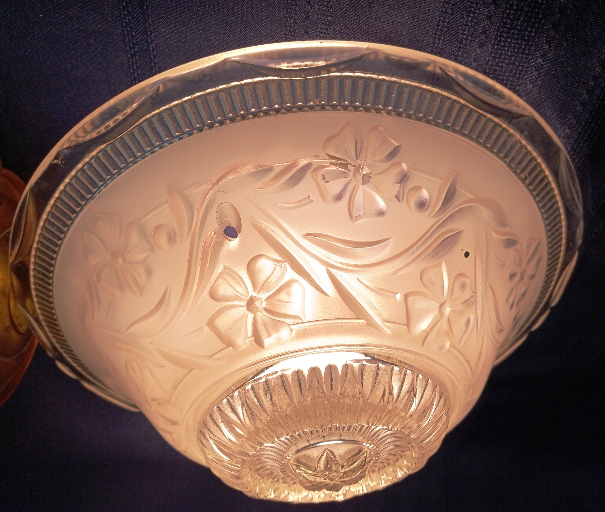 Vintage Art Deco Lampshade White Raised Floral Design and Clear Glass Round Shade Ceiling Pendant Light 3 Holes Scalloped Rim 10 1/2” D