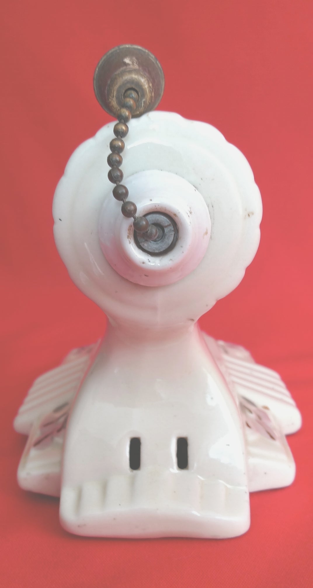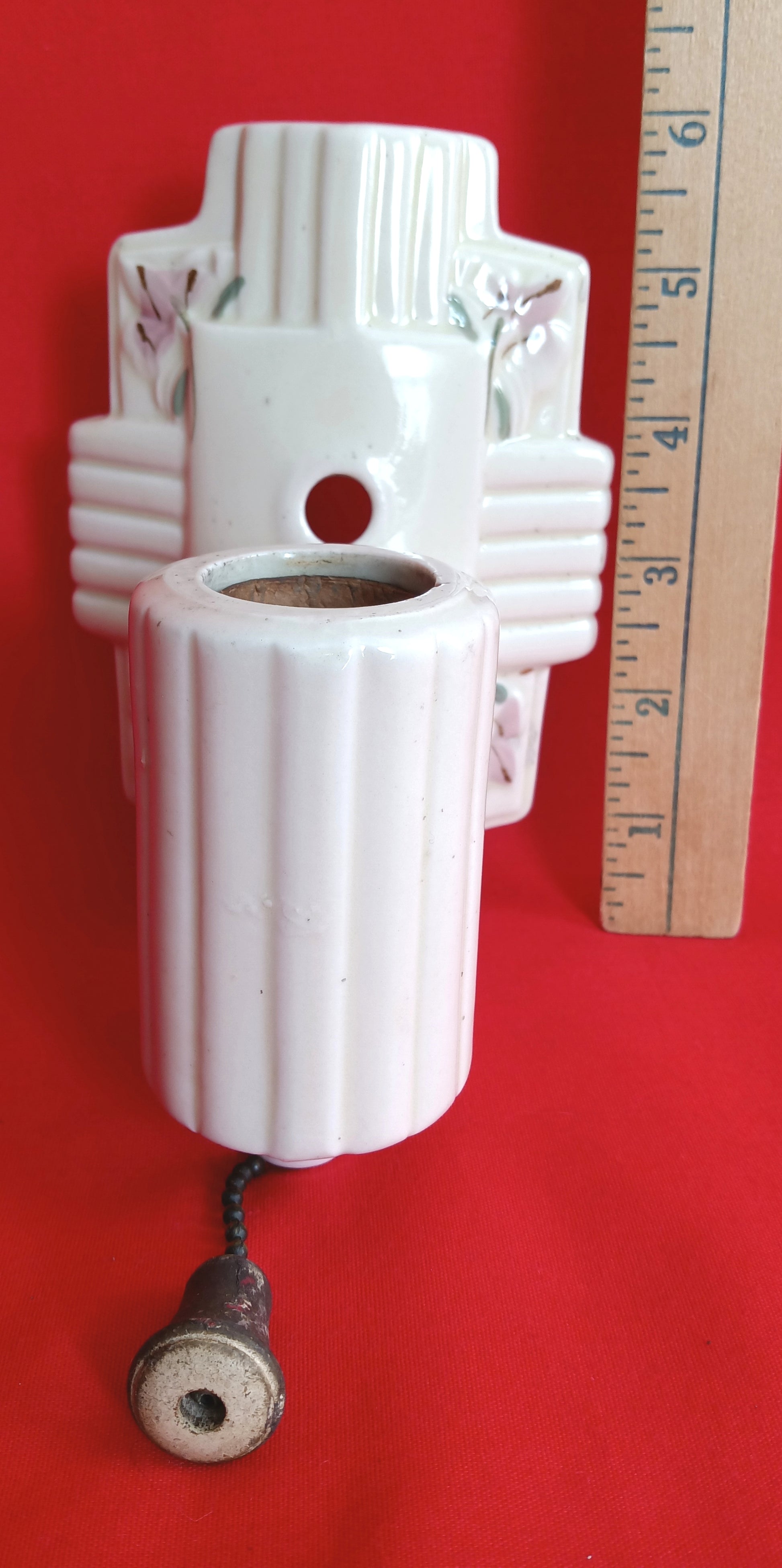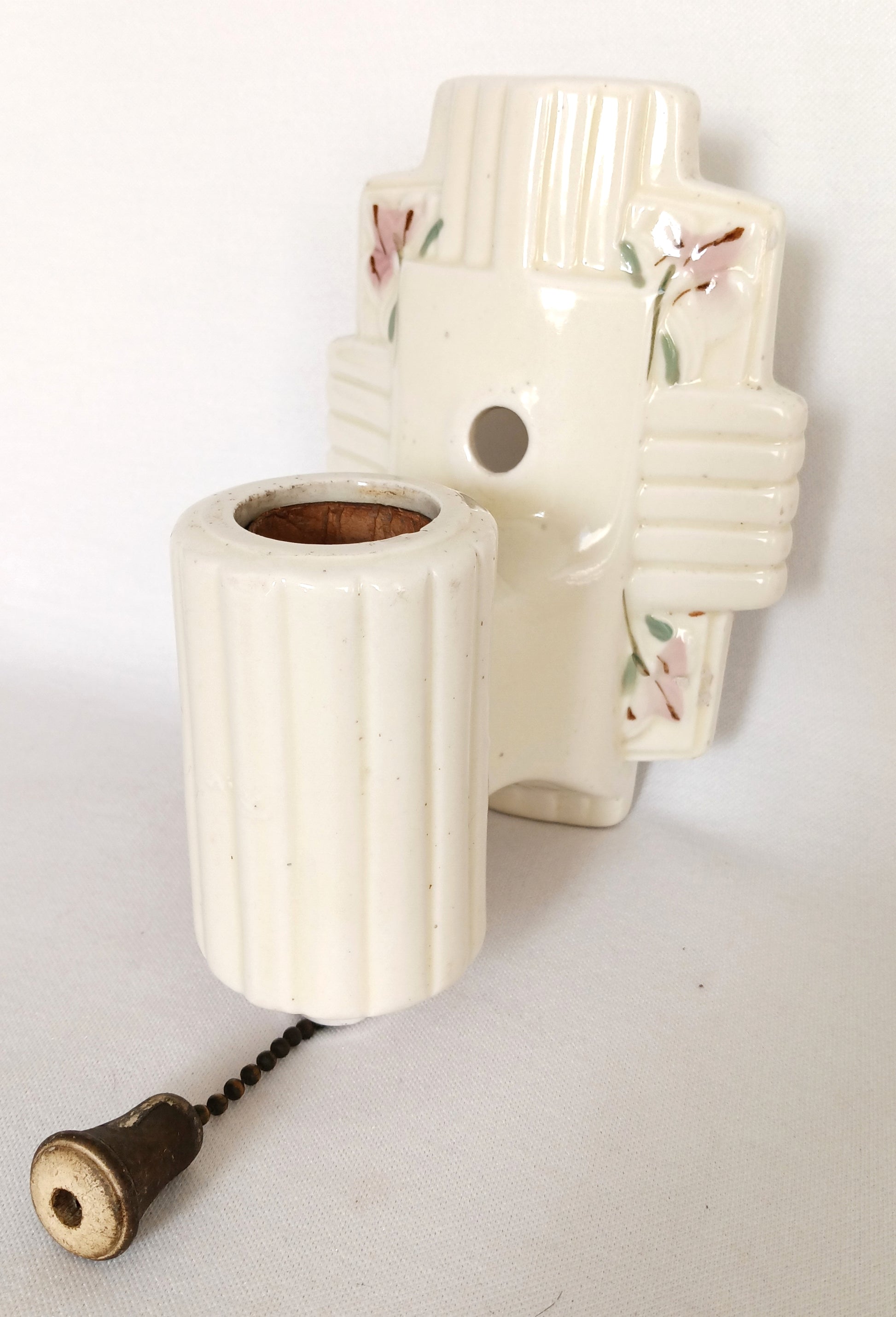 This listing is for a vintage off white ceramic porcelain bathroom wall mount sconce with single arm, back plate and socket holder. Ornate back plate features a pale pink/lavender floral design and an outlet plug at the bottom. Socket operates with a brass beaded chain with pull (bell shape). Porcelain is heavy, durable with original glazed ceramic finish. Switch is in working condition and goes smoothly on and off. All parts are original to the item. It has been tested and it is in working order, but for safety reasons it has to be hard wired. No mounting hardware included.