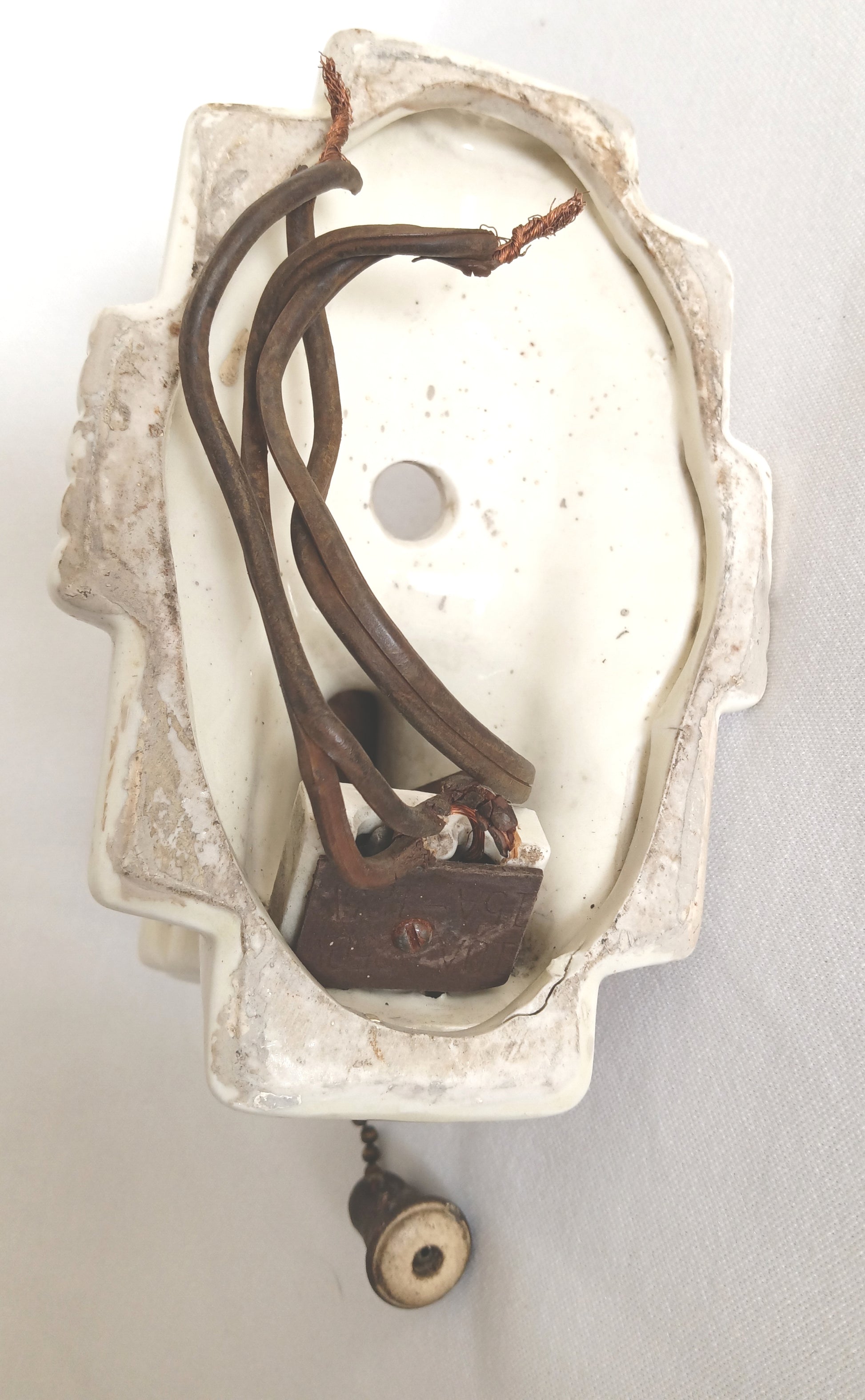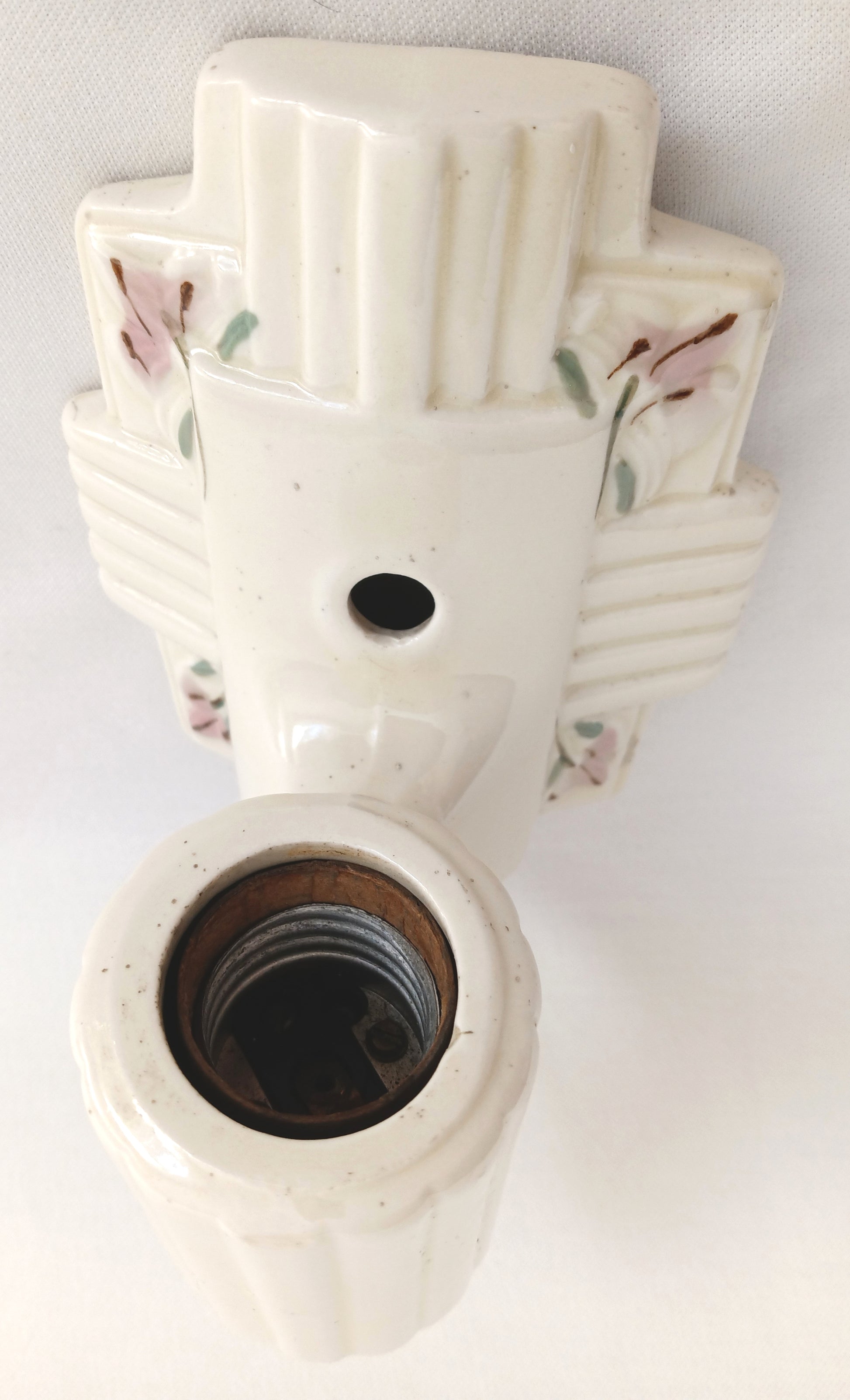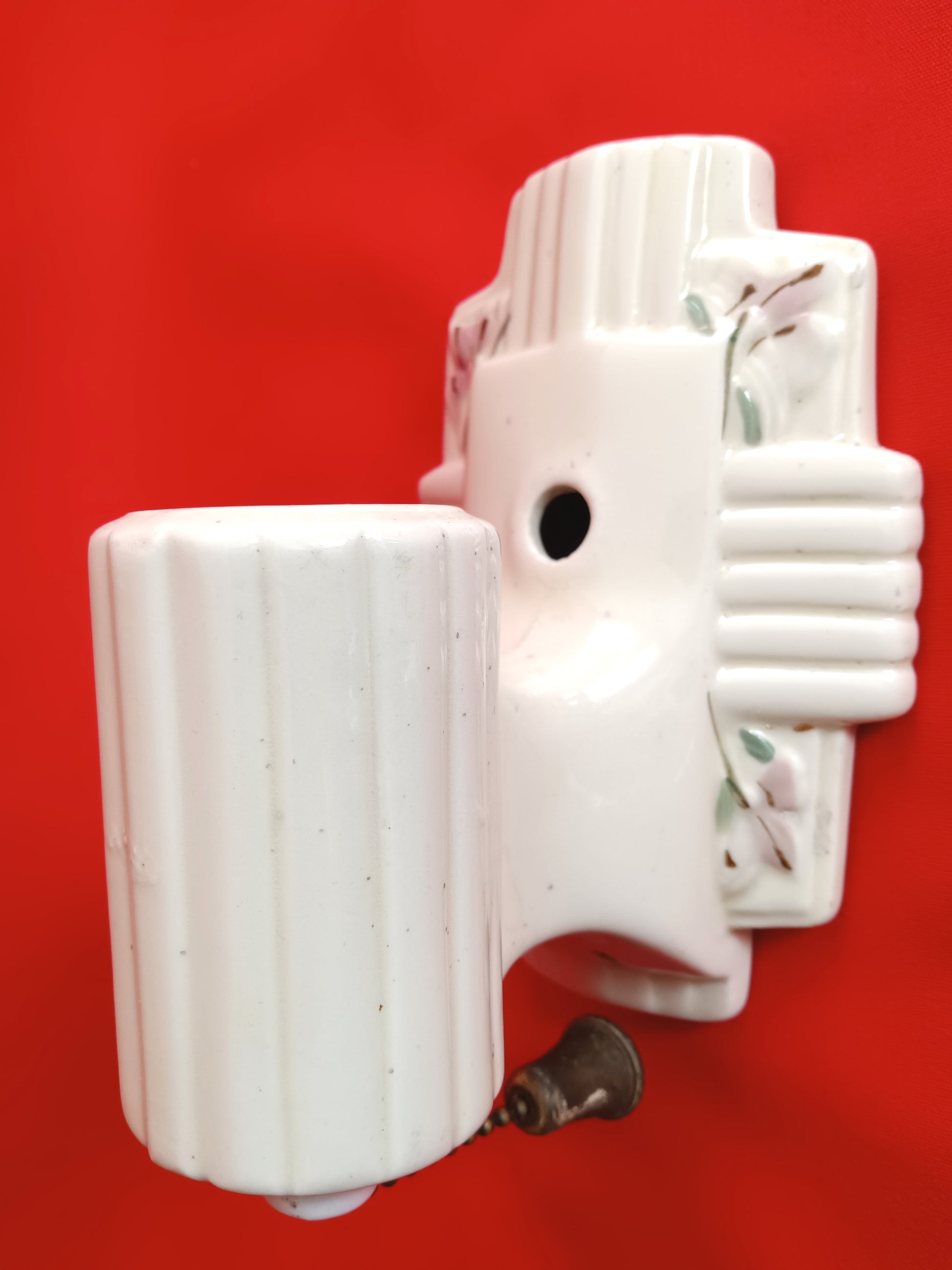 This listing is for a vintage off white ceramic porcelain bathroom wall mount sconce with single arm, back plate and socket holder. Ornate back plate features a pale pink/lavender floral design and an outlet plug at the bottom. Socket operates with a brass beaded chain with pull (bell shape). Porcelain is heavy, durable with original glazed ceramic finish. Switch is in working condition and goes smoothly on and off. All parts are original to the item. It has been tested and it is in working order, but for safety reasons it has to be hard wired. No mounting hardware included.