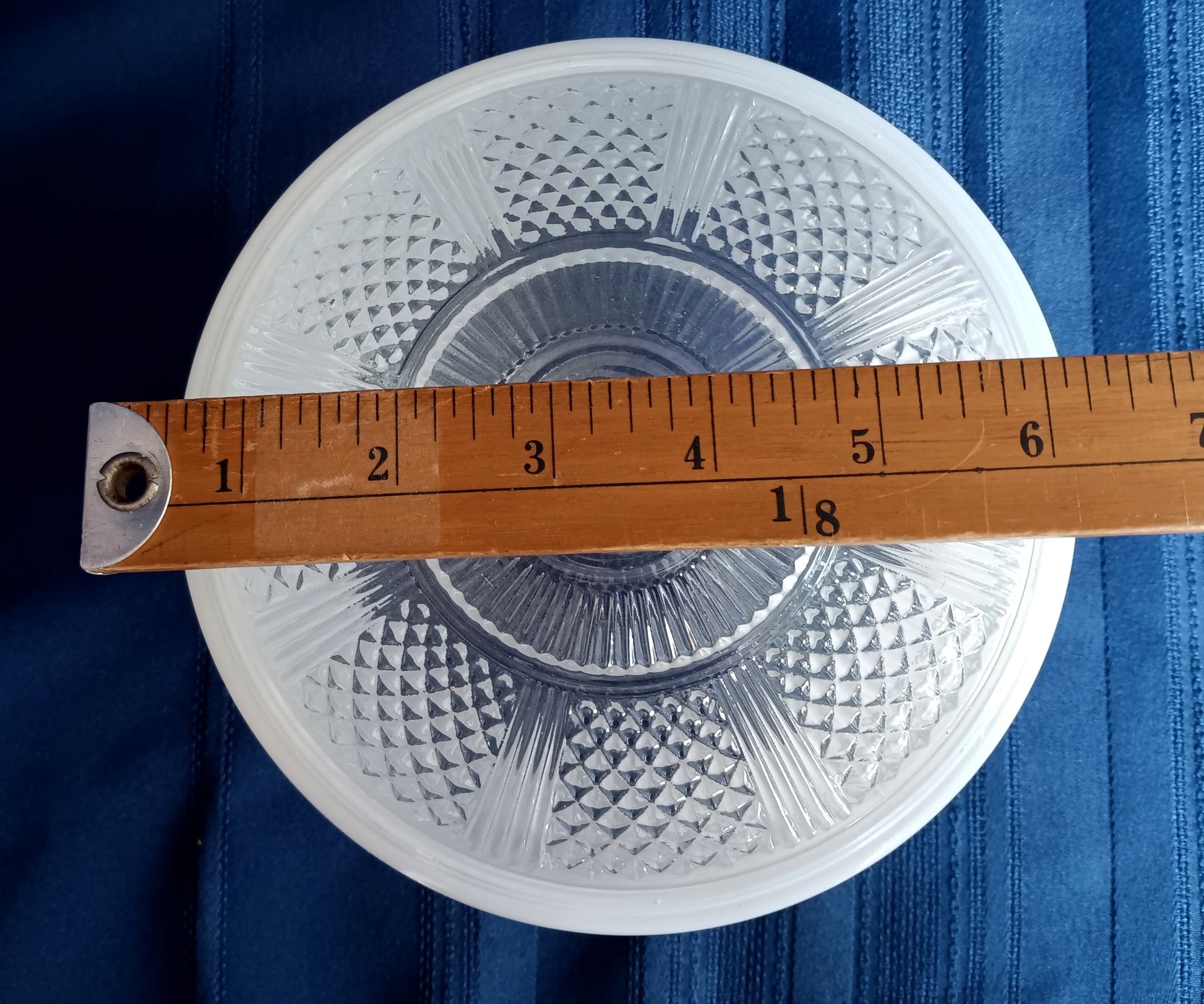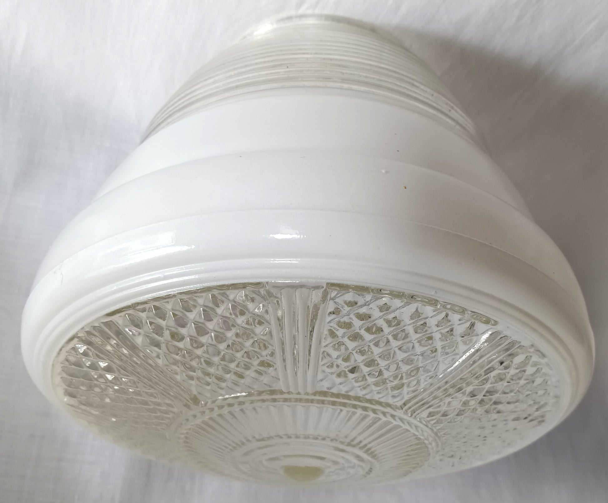 This sale is for an Art Deco style vintage light cover/globe/lampshade for flush mount ceiling /bathroom wall fixture. High quality pressed glass globe has truncated cone shape and features clear glass bullseye with ribbed design top and concentric circle design on the bottom. White/milk glass between top and base.