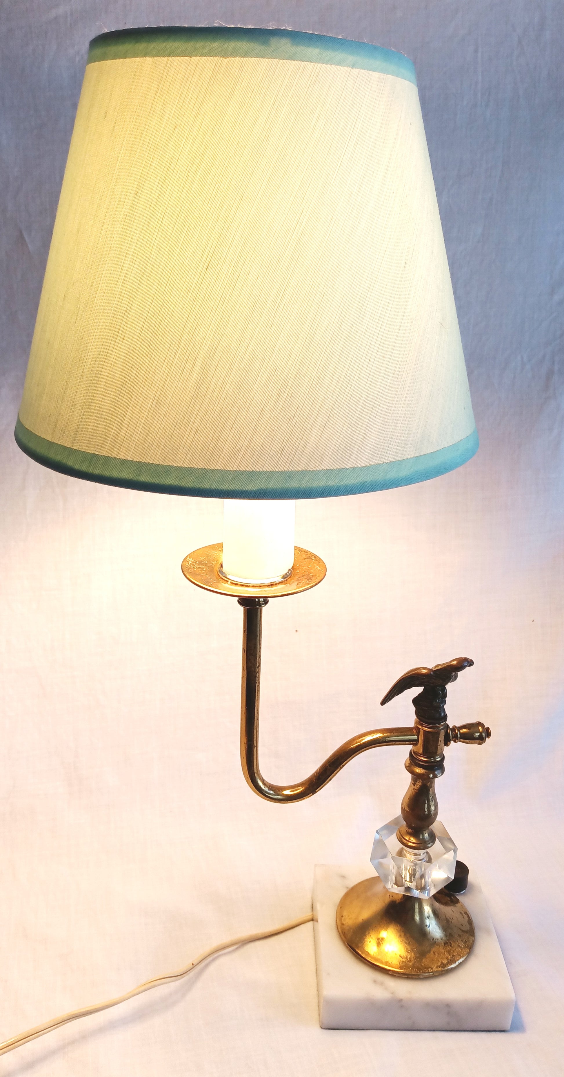 For sale is vintage American classic/Federal style table/desk lamp. It features marble base, brass column with decorative clear pressed glass insert, eagle figurine, and brass plated metal candlestick arm. Felt under the base. The lamp takes one E 26 standard bulb 40-Watt max or equivalent light and operates with rotary on/off switch, locate on the marble base. All electrical parts are original to the lamp, and they are in good working condition. Bulb and lampshade are not included. Circa 1960’s.