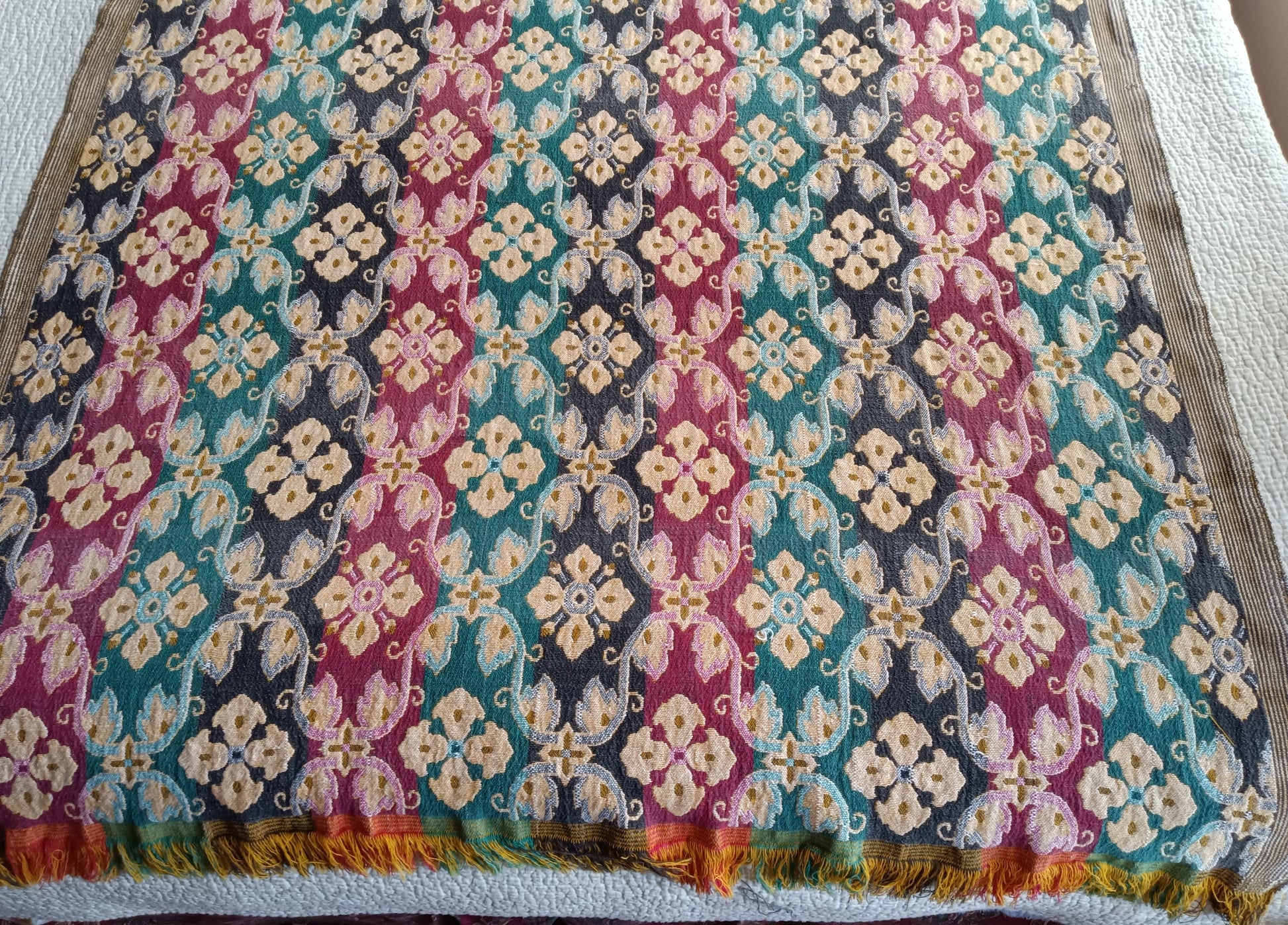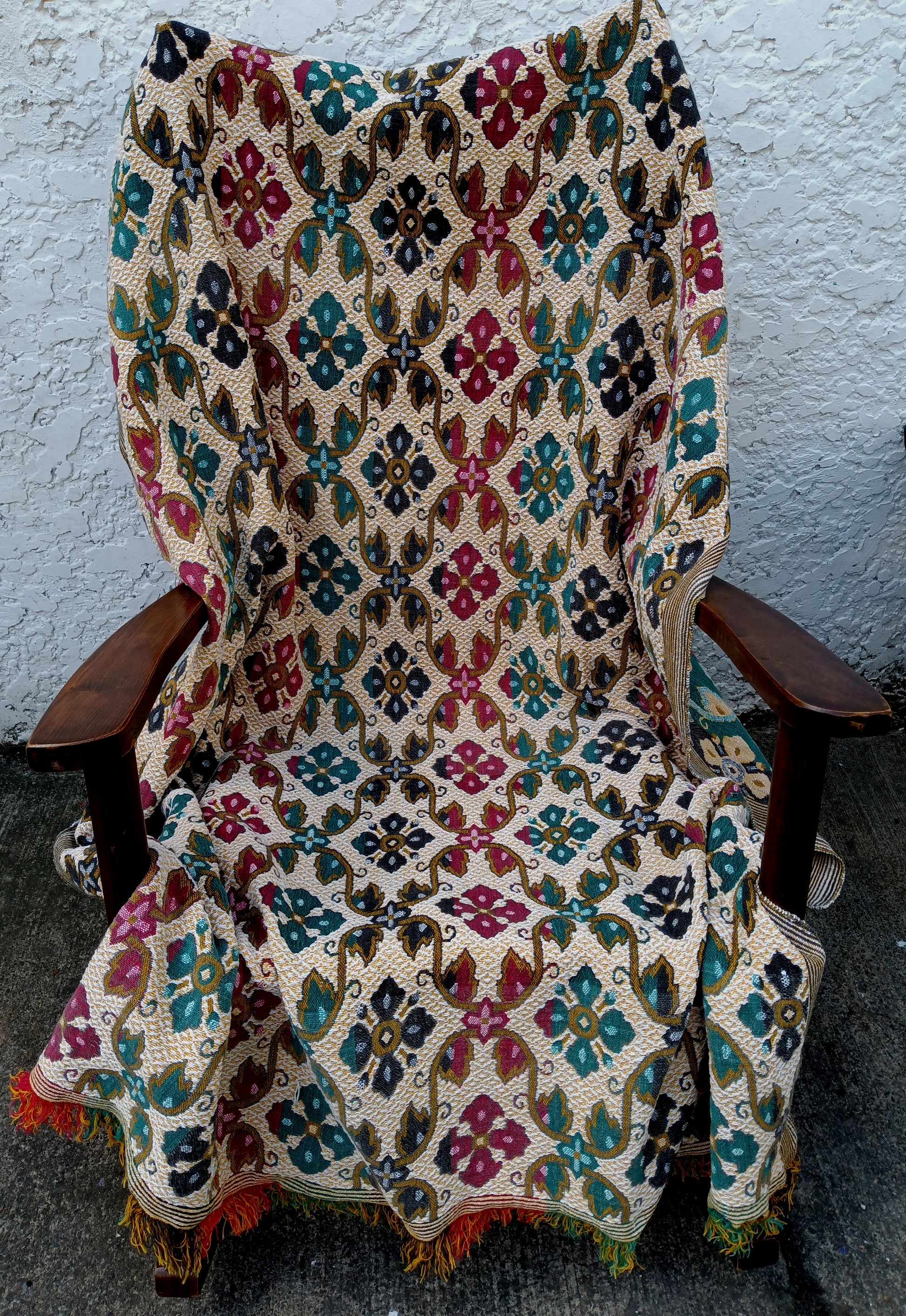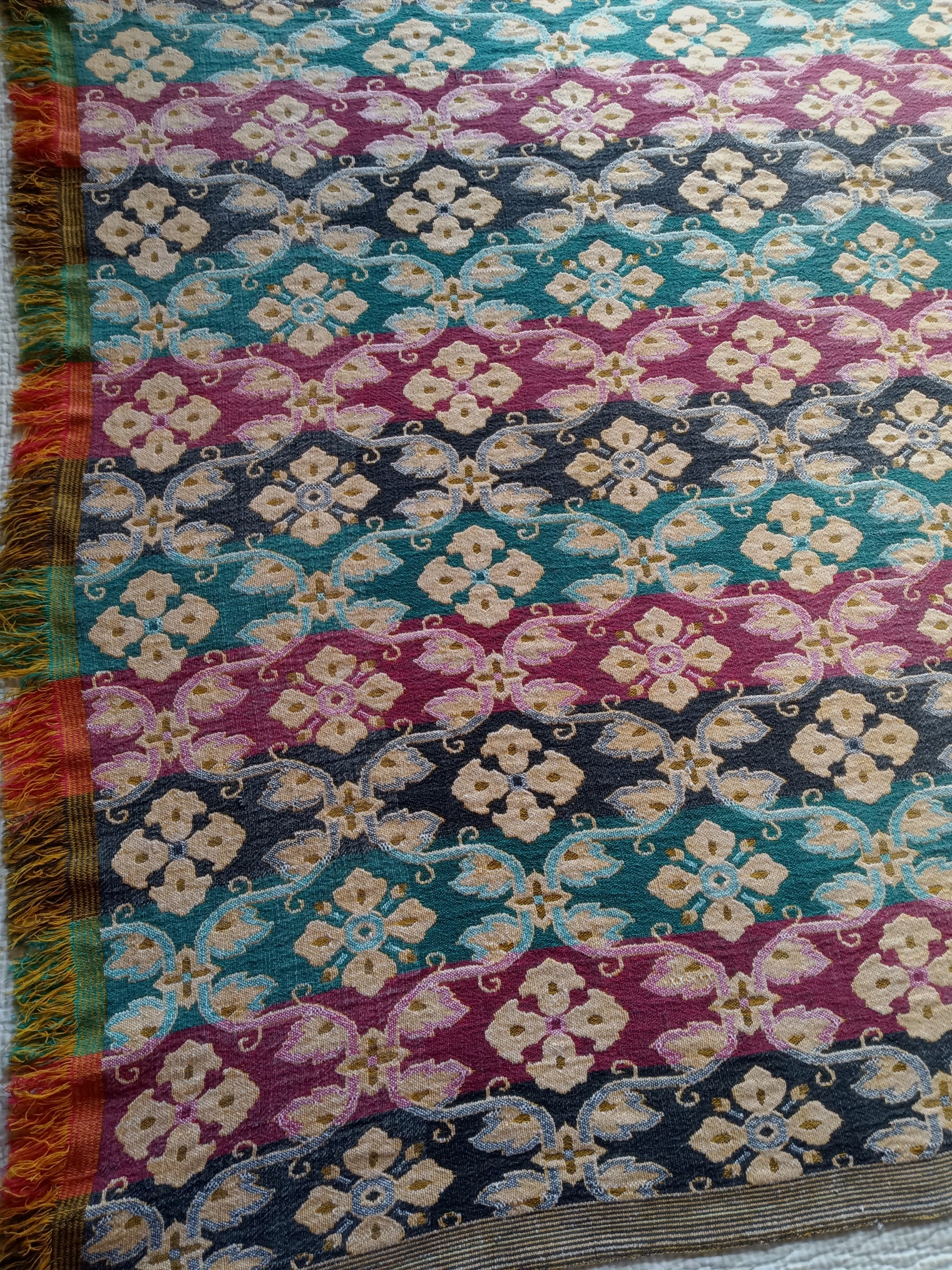 This sale is for a vintage 100% cotton throw/lightweight blanket for bed, sofa, couch, or recliner. It features elaborate ornamentation, rich, flowing patterns, and elegant scrolling motifs in burgundy, orange, green, blue, black, and beige colors. Reversible side offers a slightly different look. 2 sided fringes. It looks like an antique tapestry.