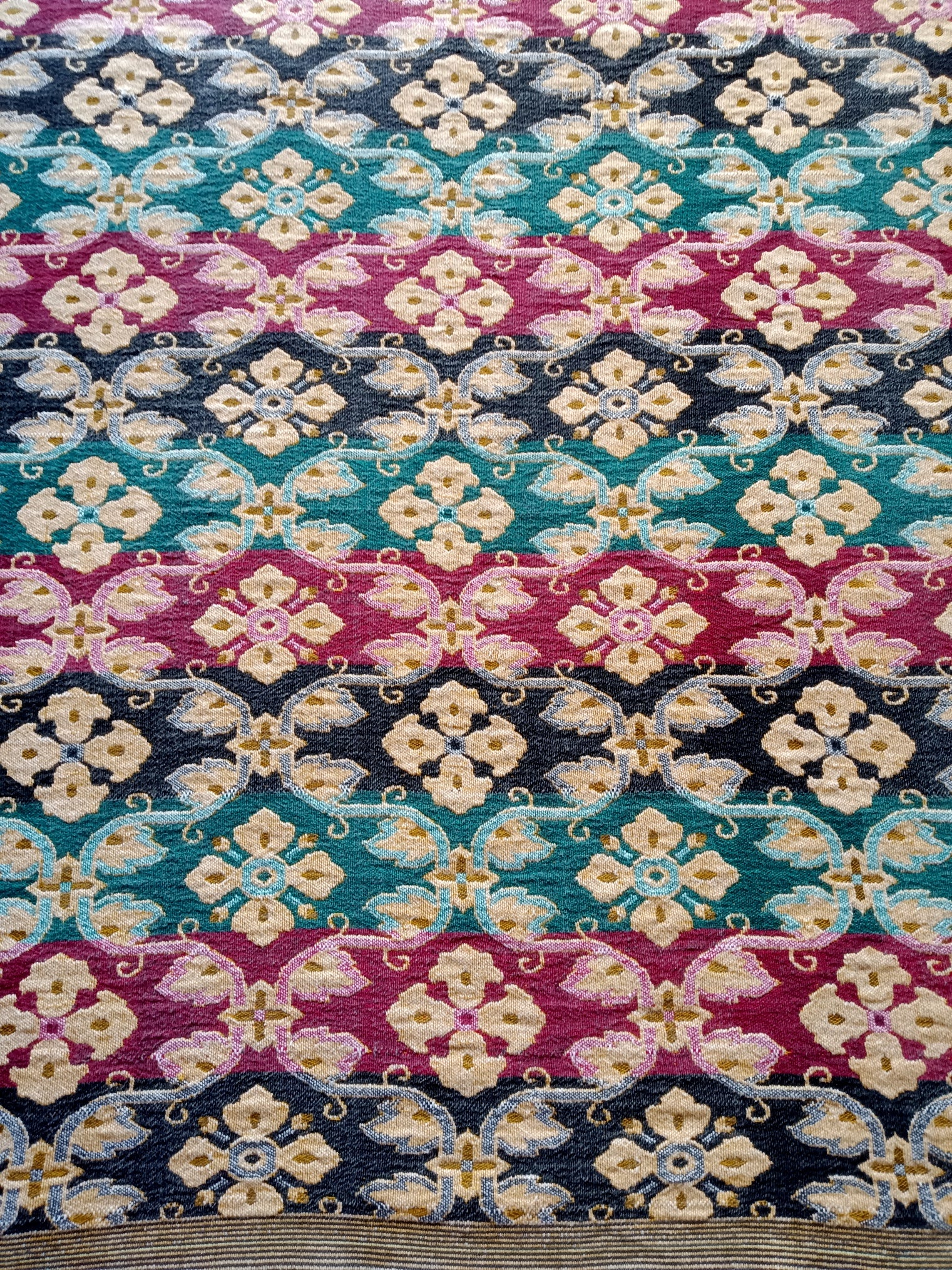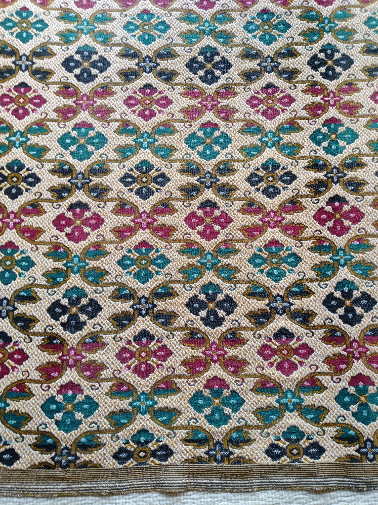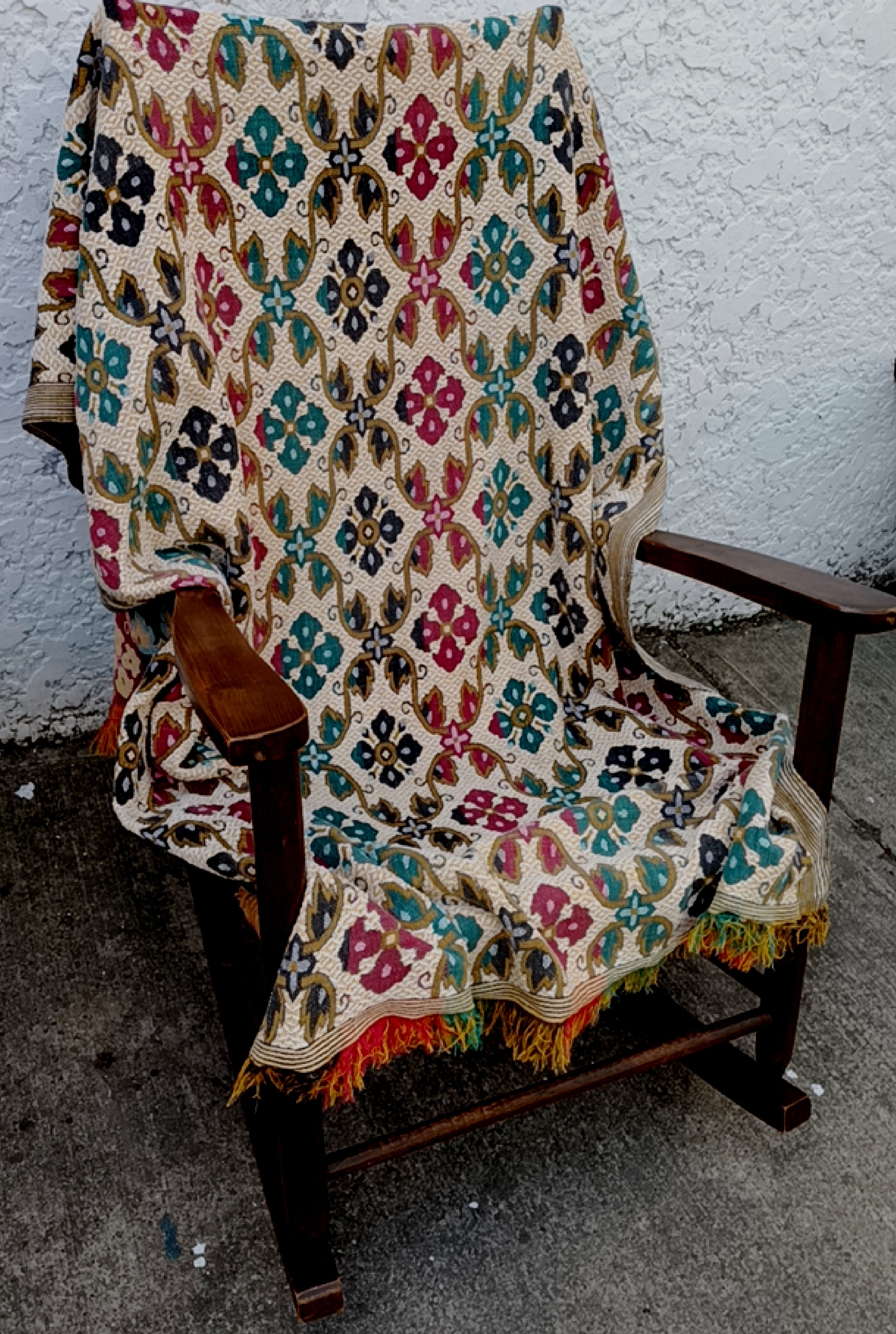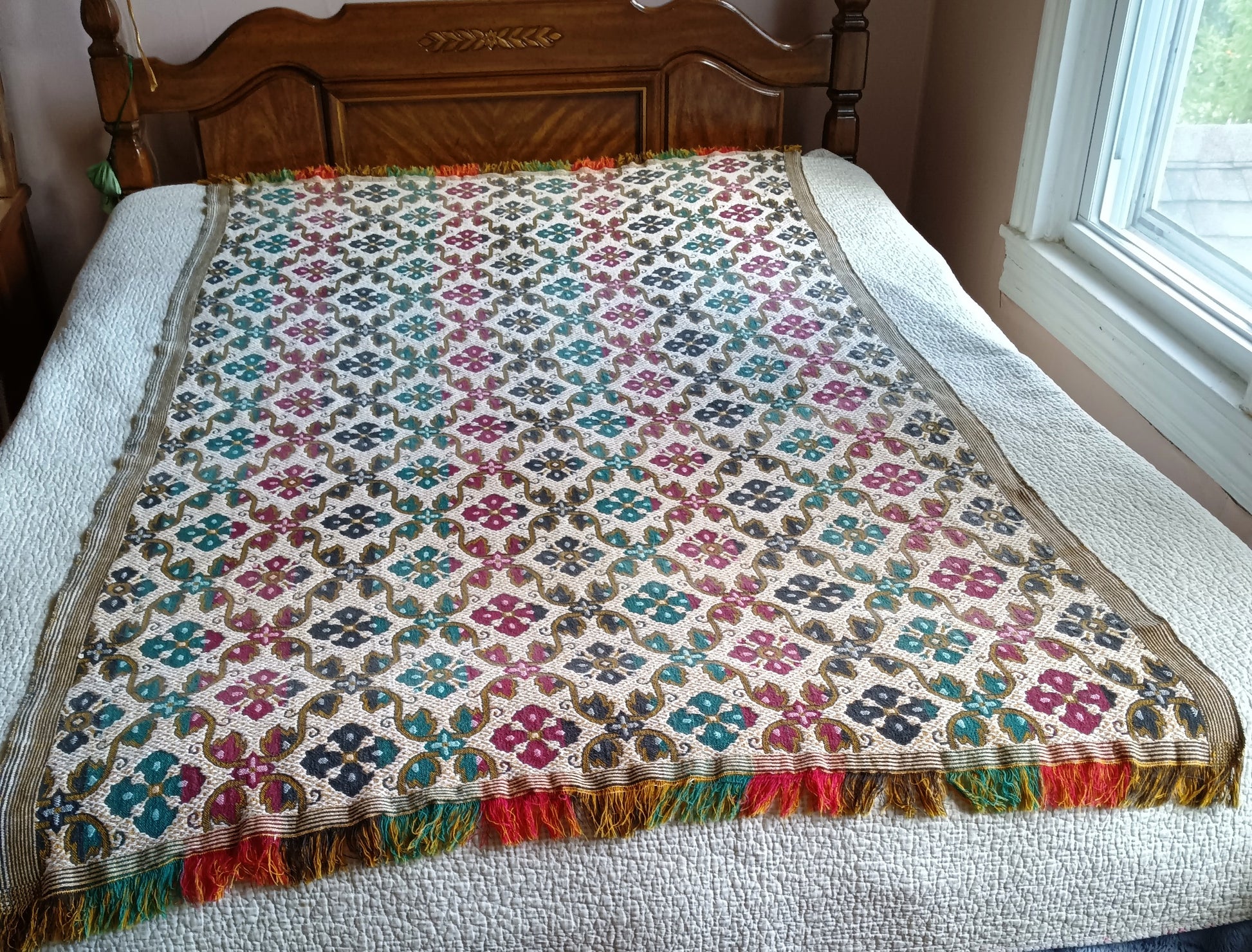 This sale is for a vintage 100% cotton throw/lightweight blanket for bed, sofa, couch, or recliner. It features elaborate ornamentation, rich, flowing patterns, and elegant scrolling motifs in burgundy, orange, green, blue, black, and beige colors. Reversible side offers a slightly different look. 2 sided fringes. It looks like an antique tapestry.
