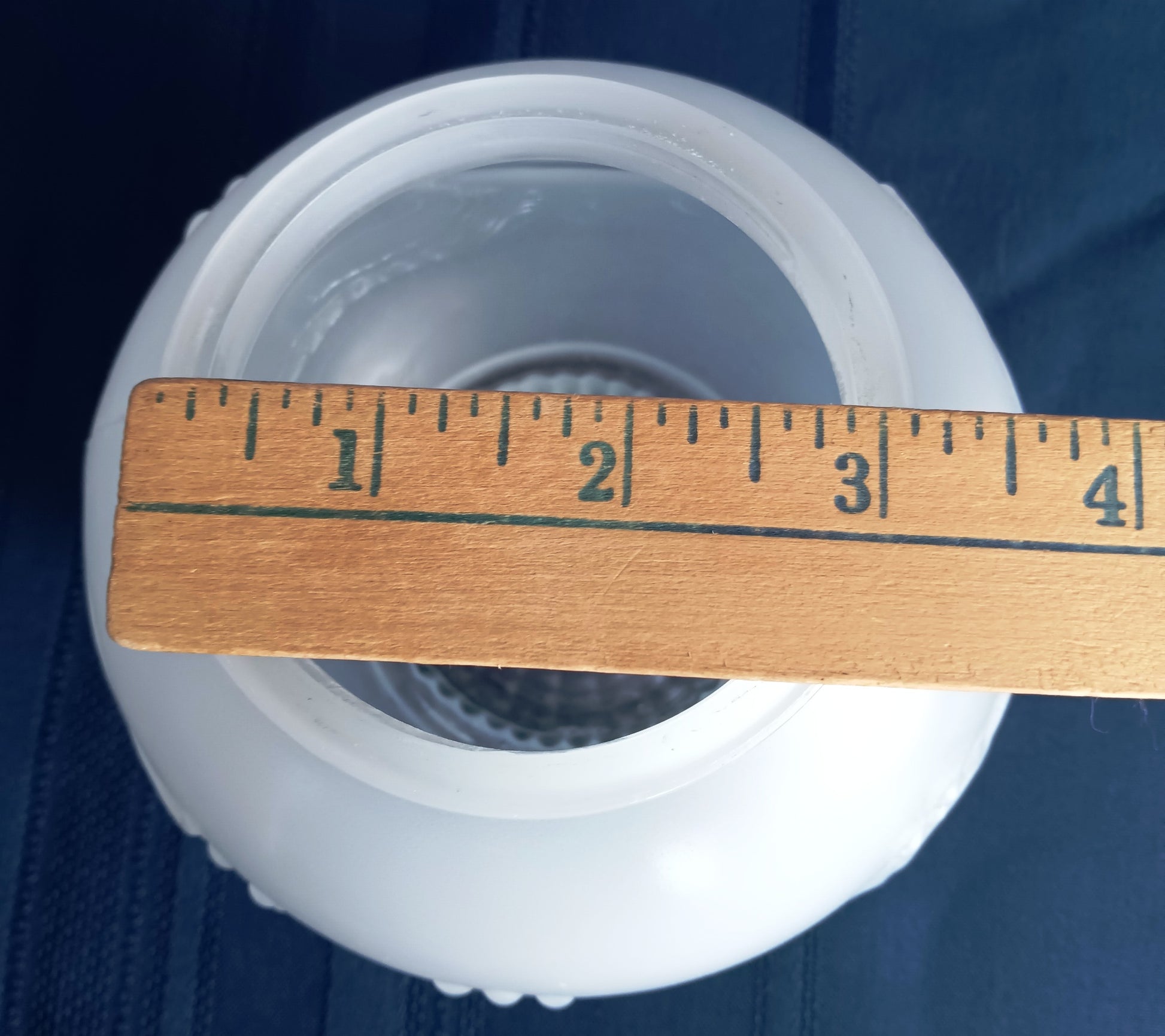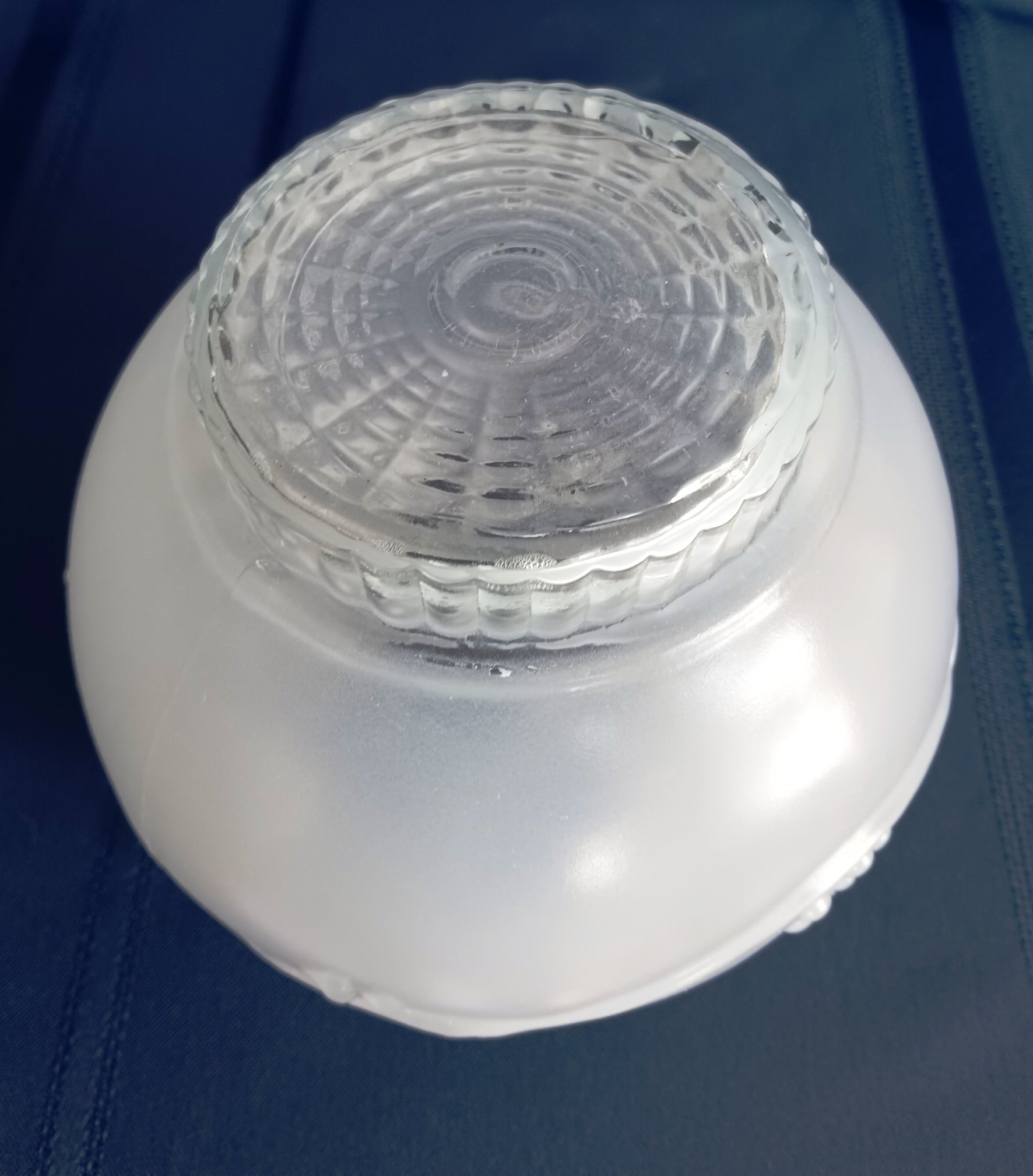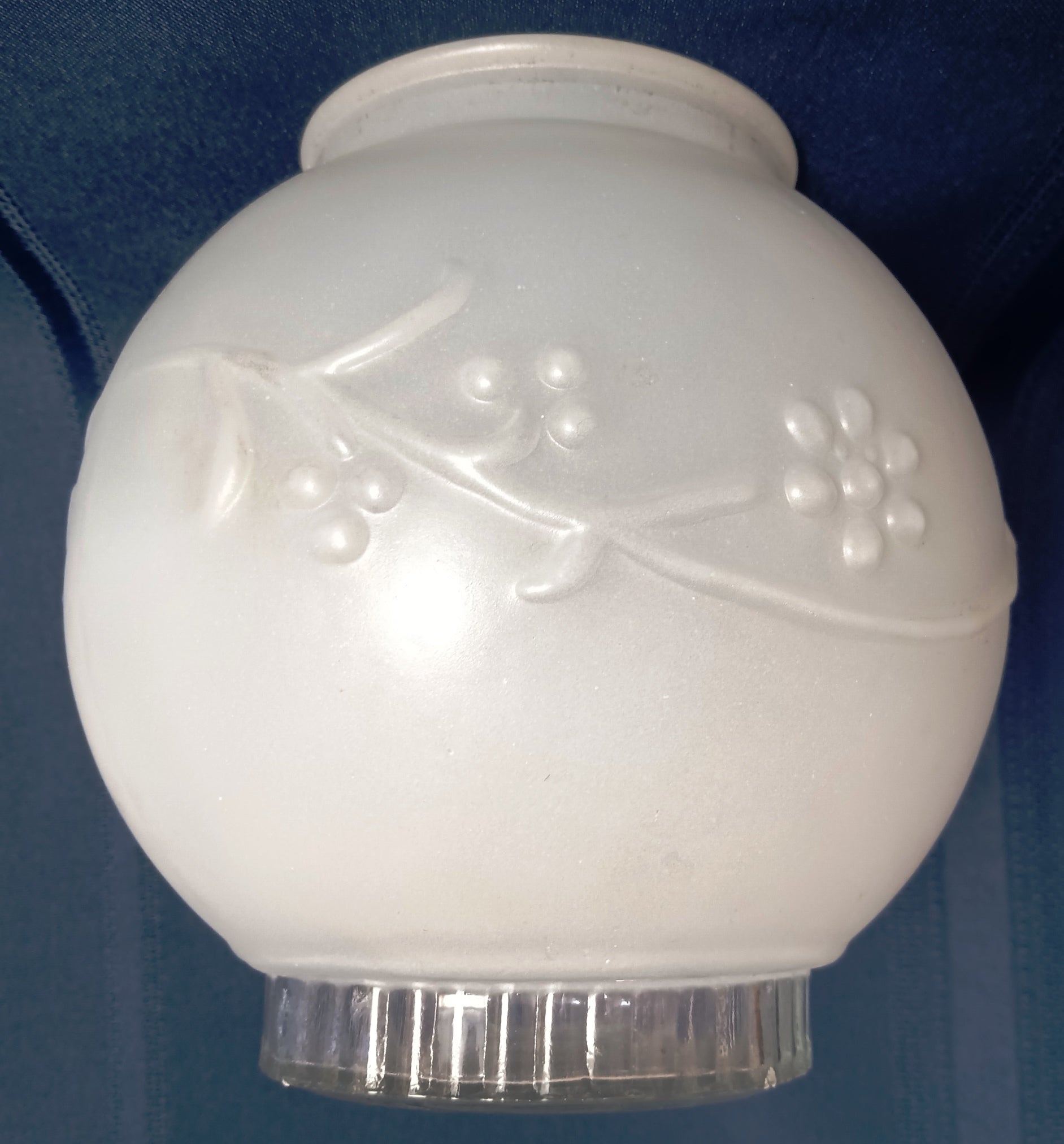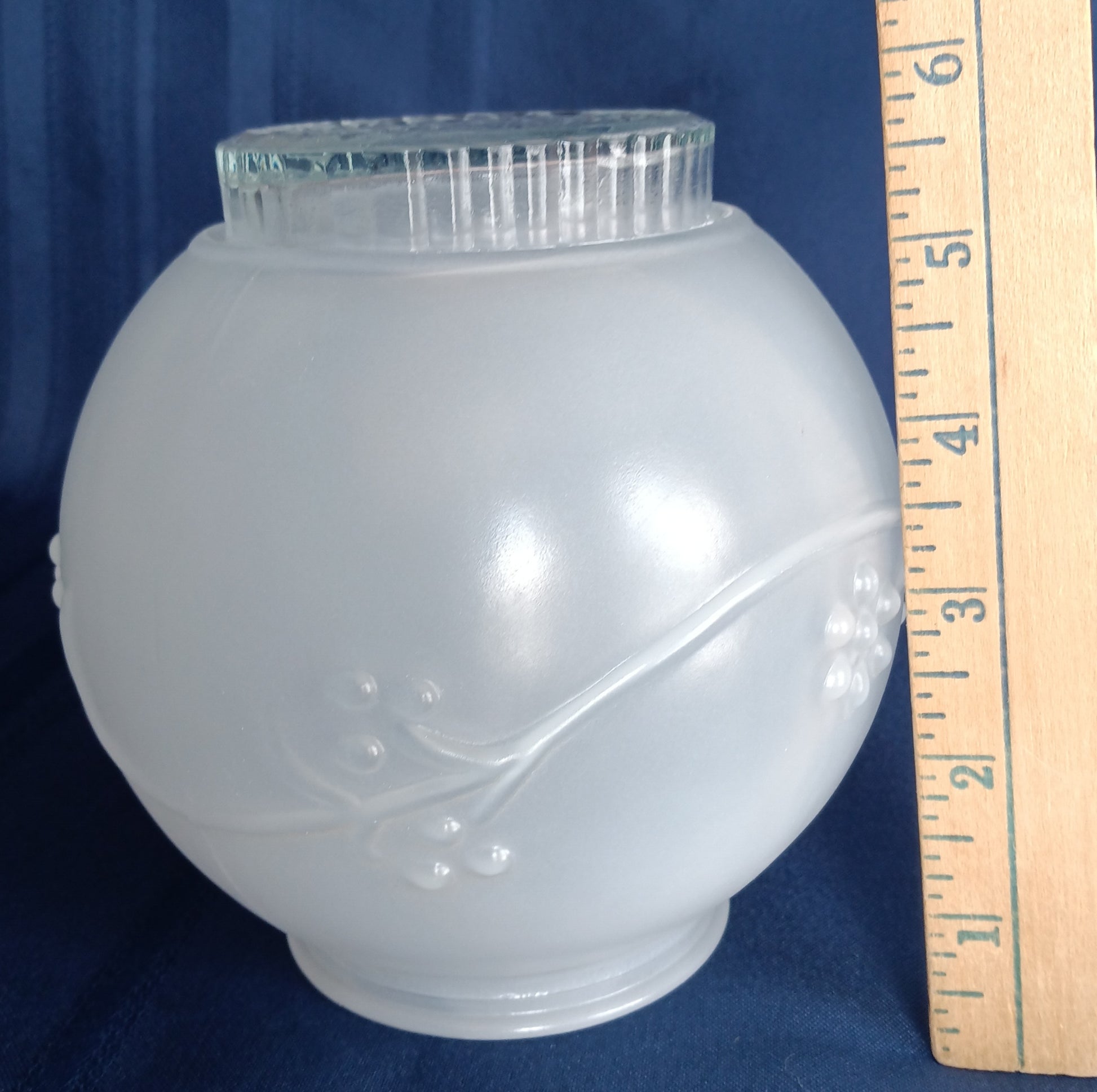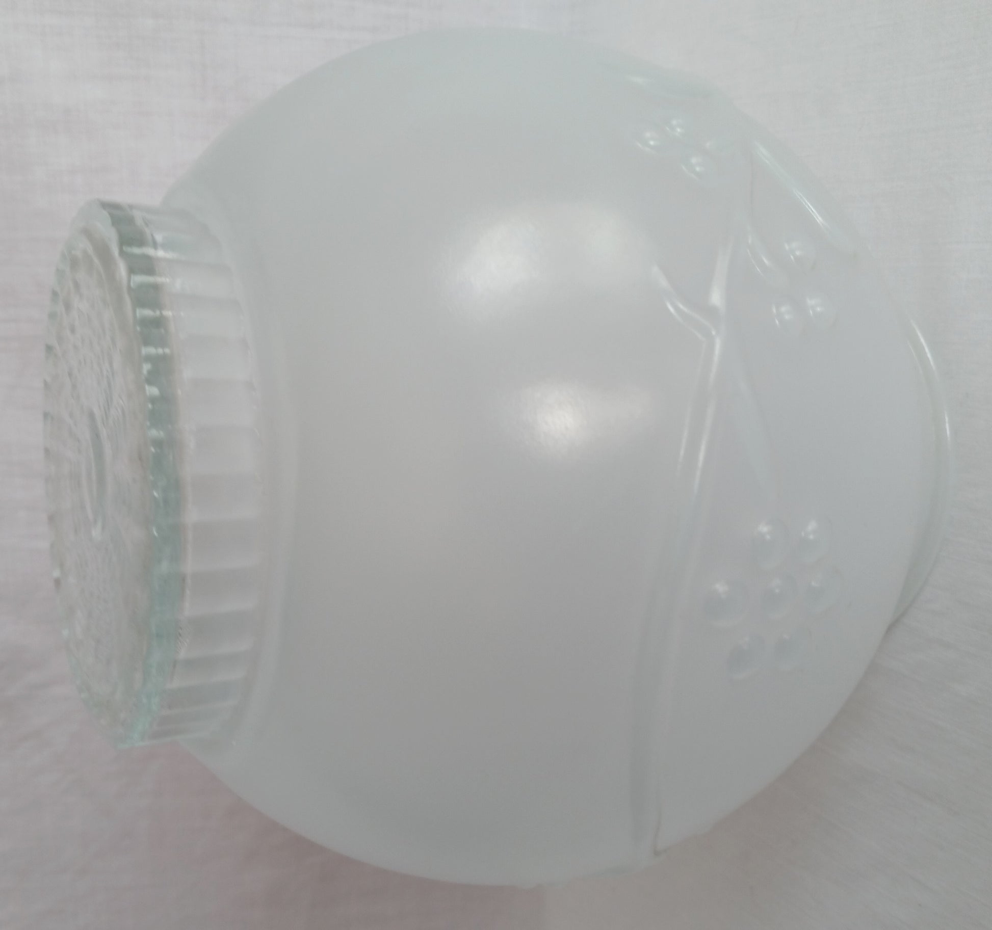 This listing is for a frosted and clear glass round small lamp shade /cover/globe for ceiling or wall light fixture. It features raised floral pattern around the frosted side and a clear ridged top. Heavy glass with a light bluish hue. Lampshade was removed from a wall sconce of a Victorian house, outskirts of Philadelphia.