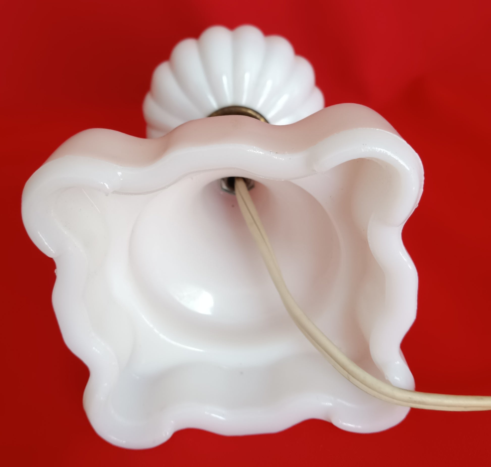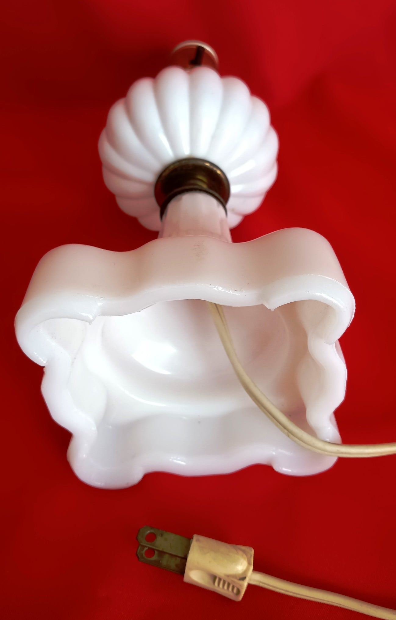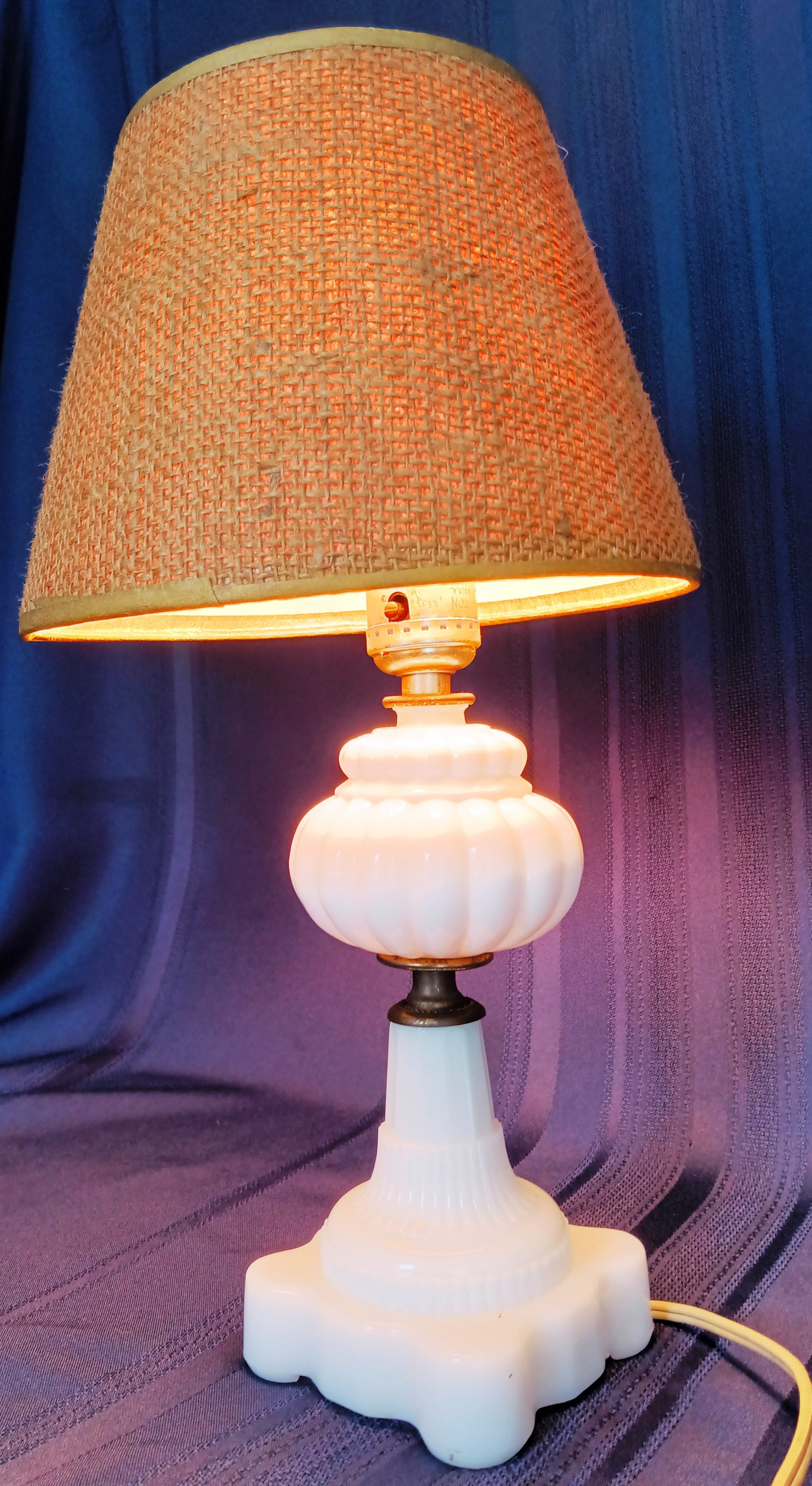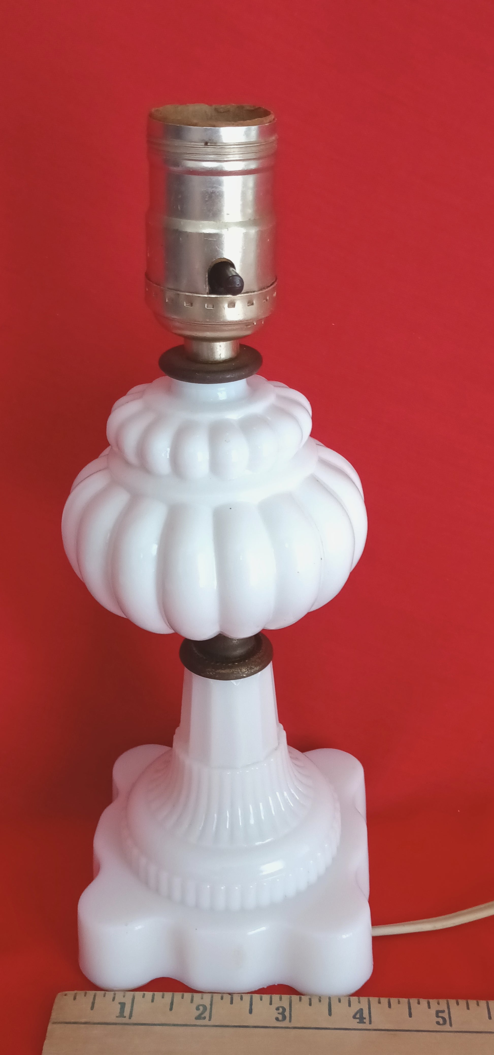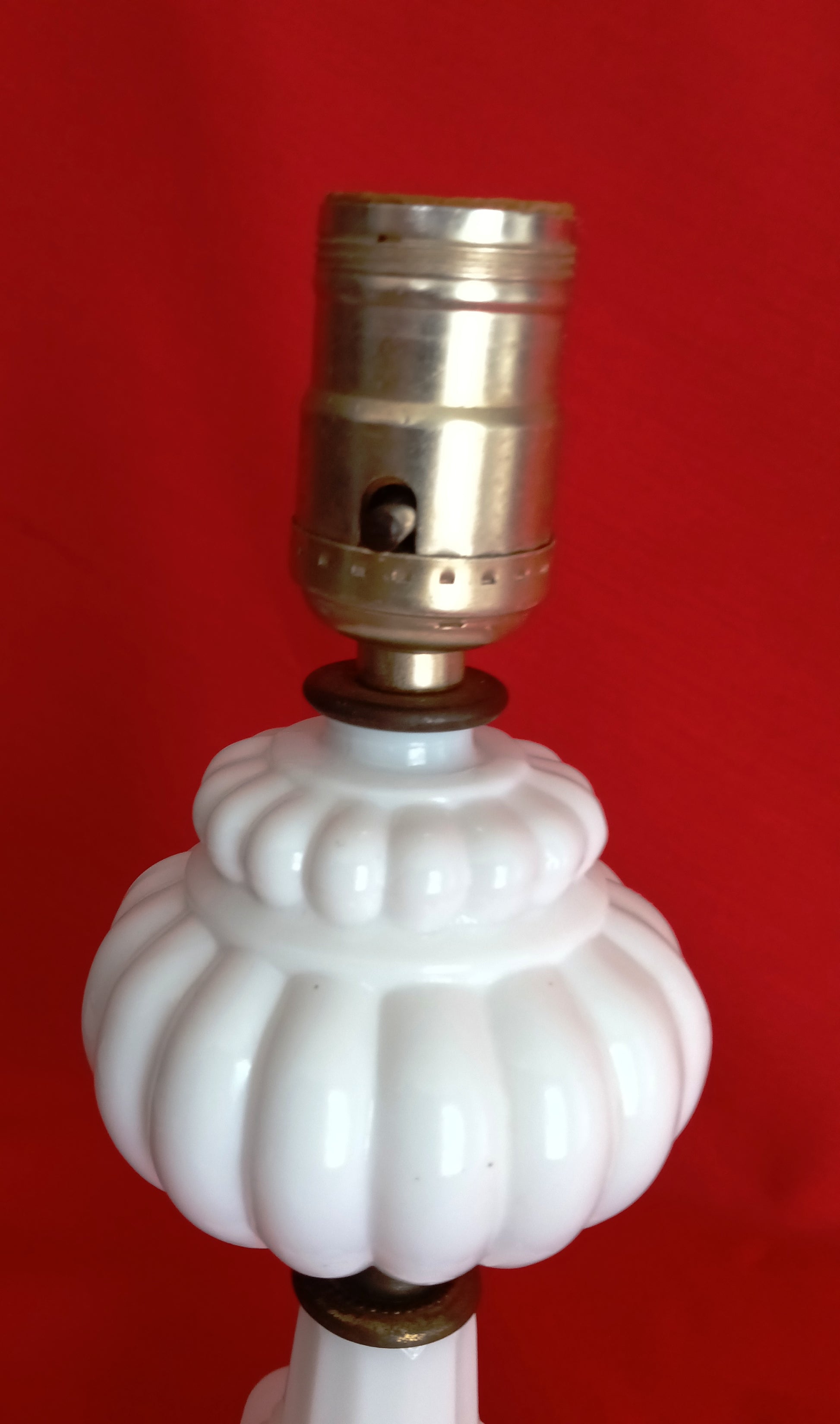 This listing is for a mid-century table lamp. It is made of milk glass, a type of opaque white glass. It features ribbed swirl pattern on its body and a plate style base. There is metal inner hardware between glass parts. Bulb socket is made by Leviton with press on and off switch and 660W - 250V UL stamped on it. This lamp uses one bulb E26/E27 base 40-Watt maximum. All parts are in good working condition. Bulb and shade are not included.