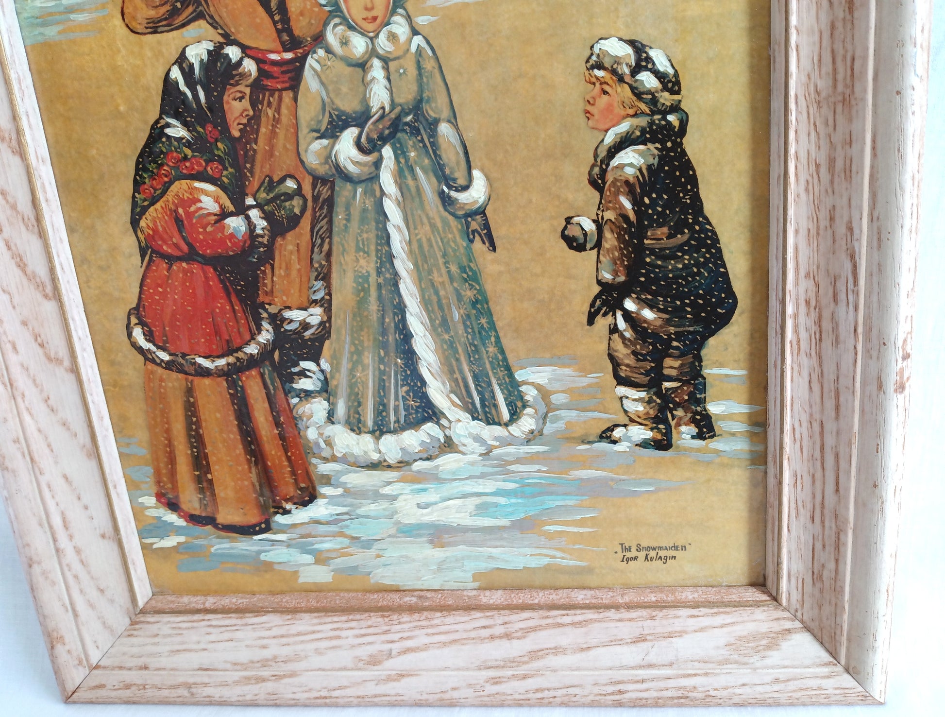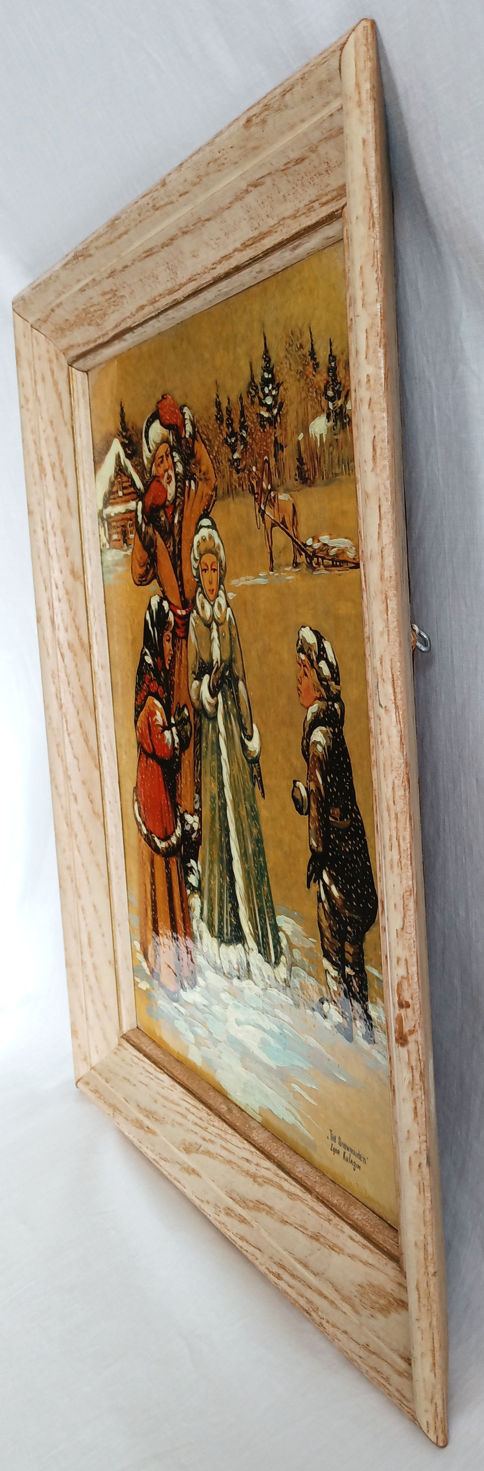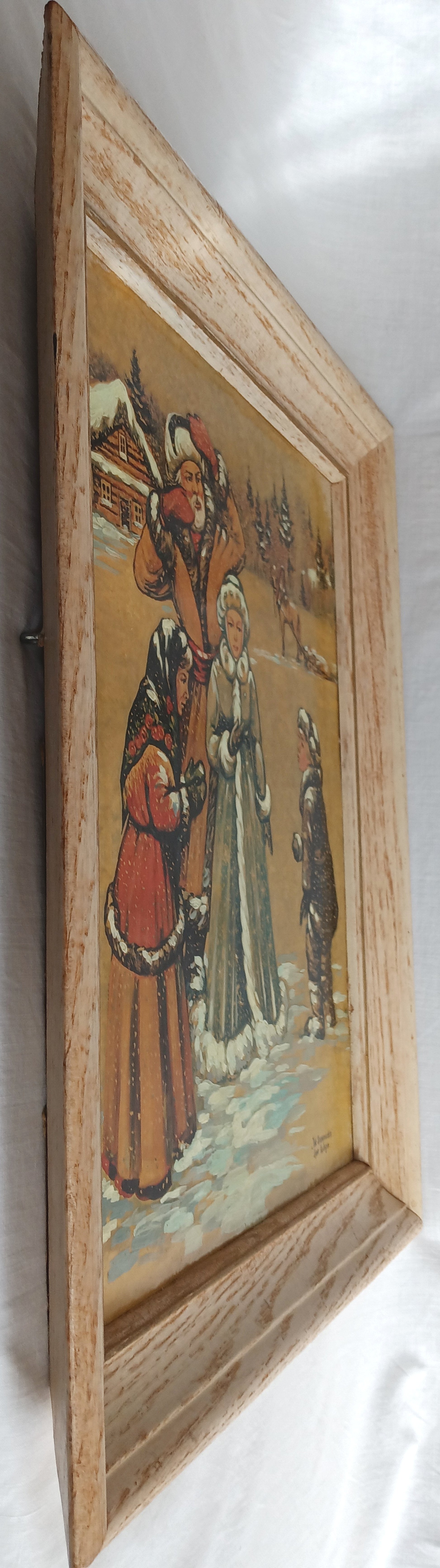Wonderful hand painted oil on board of a Russian older couple, Snegurochka, a young boy, log cabin, trees, and a horse with sledge. Few layers of enamel paint cover the oil painting. The artist's signature and the title of the painting can be found in the lower right-hand corner. It is framed with a sturdy, hard wood distressed frame. Painting is ready to hang with a string, attached to the back of the frame.