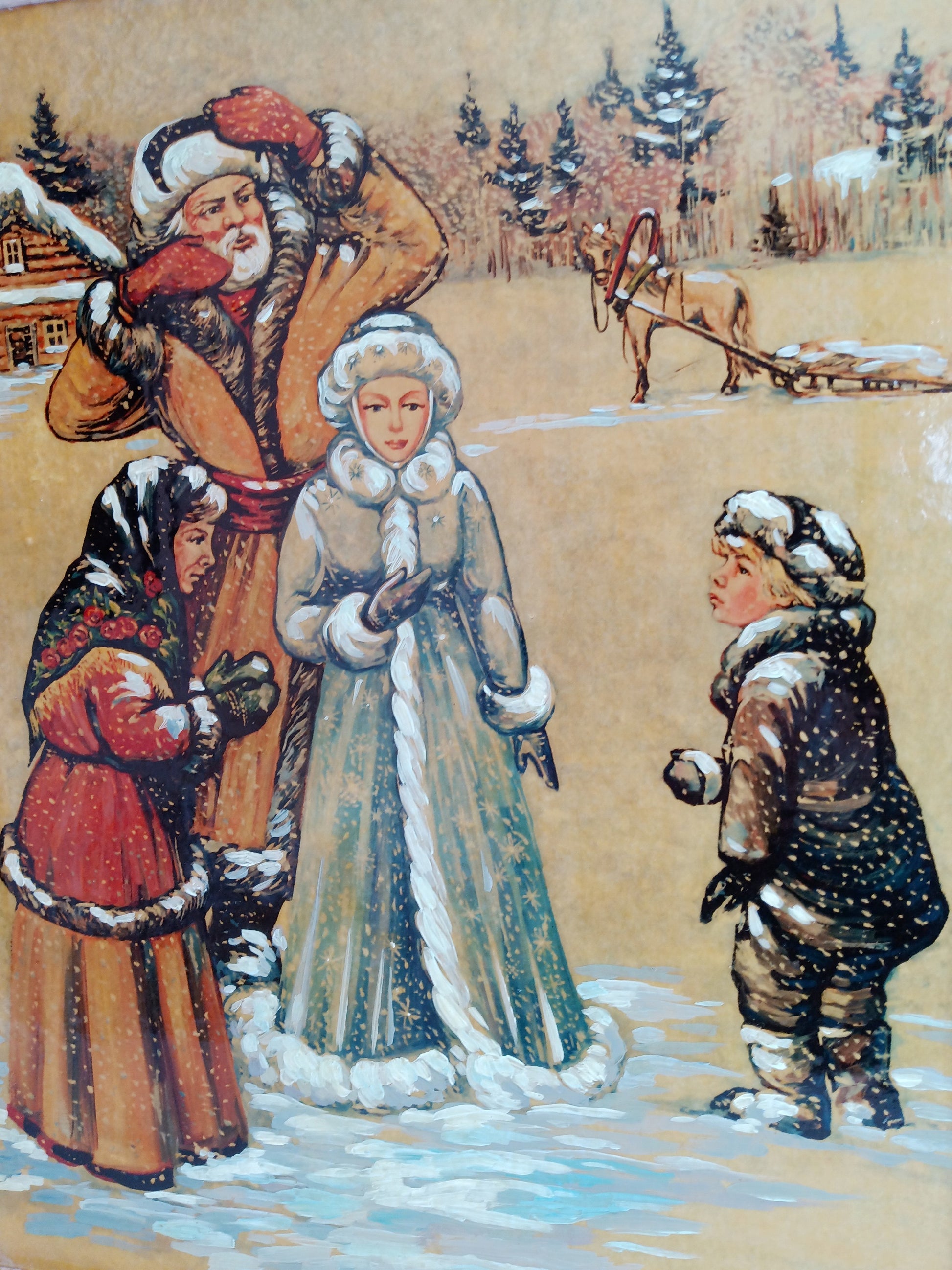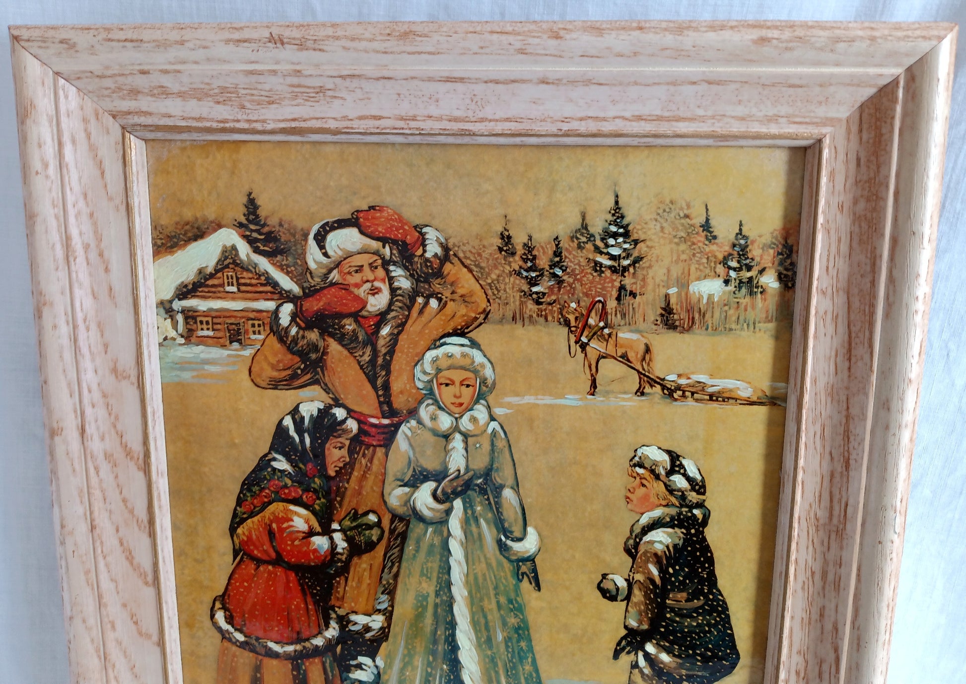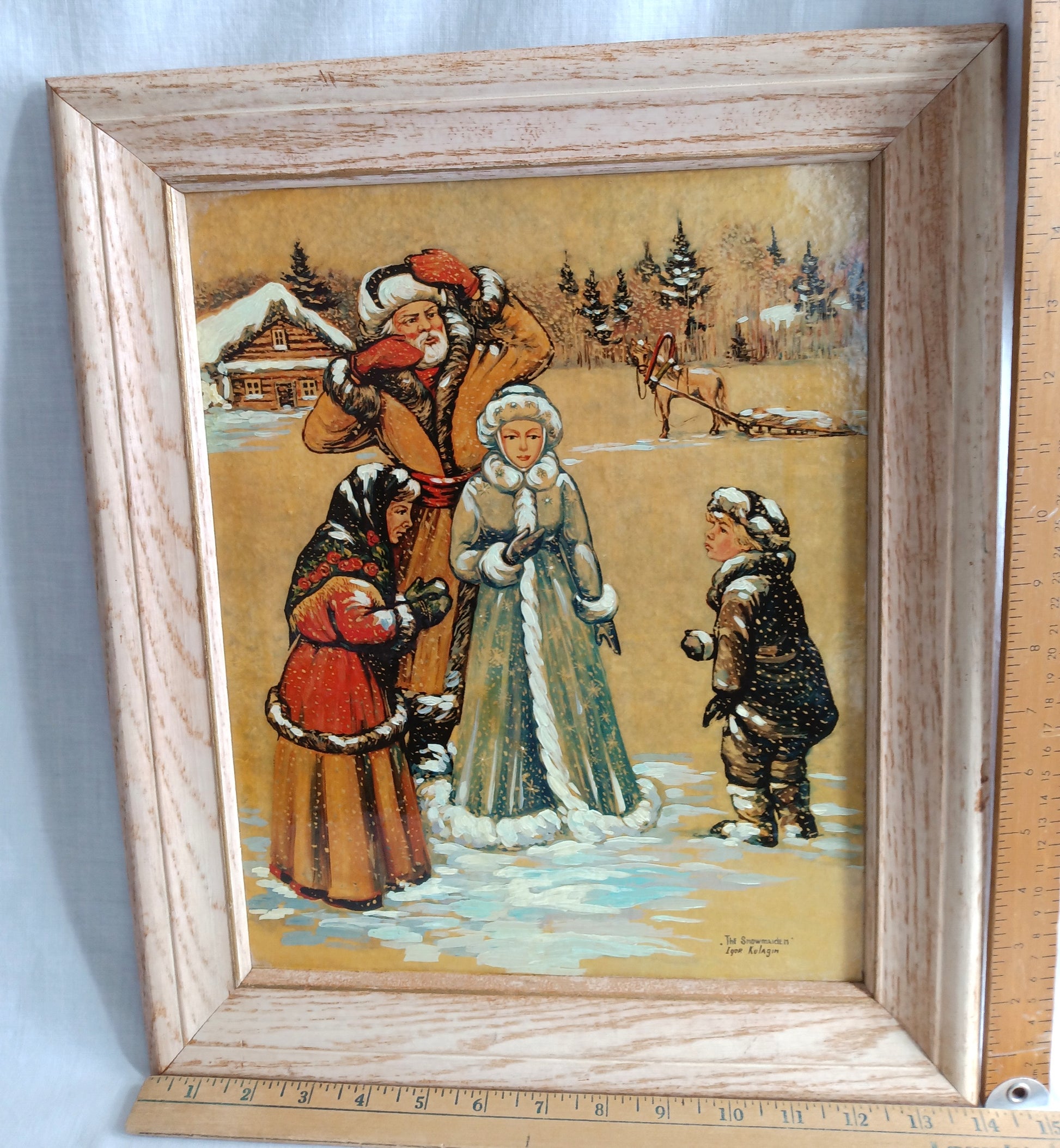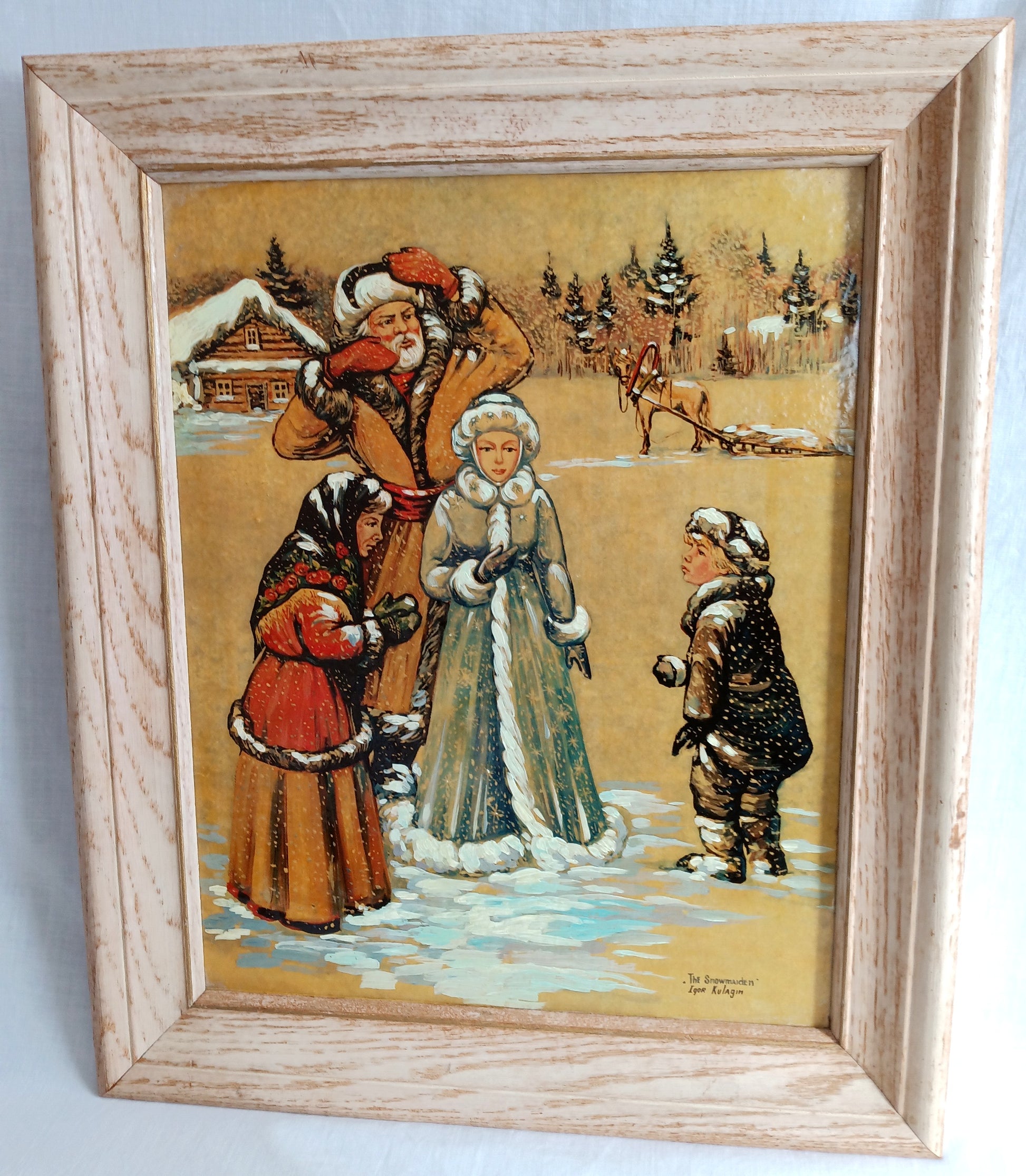 Wonderful hand painted oil on board of a Russian older couple, Snegurochka, a young boy, log cabin, trees, and a horse with sledge. Few layers of enamel paint cover the oil painting. The artist's signature and the title of the painting can be found in the lower right-hand corner. It is framed with a sturdy, hard wood distressed frame. Painting is ready to hang with a string, attached to the back of the frame.